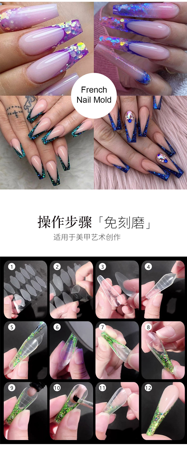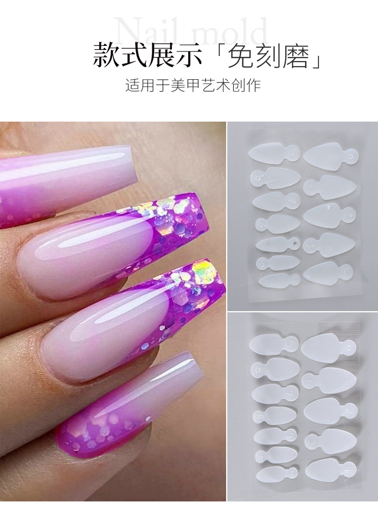 Molde de película de uñas de cristal de uñas popular transfronteriza sin pegamento de extensión de soporte de papel 12 piezas de molde de uñas pegatinas francesas no tallado de silicona de molienda