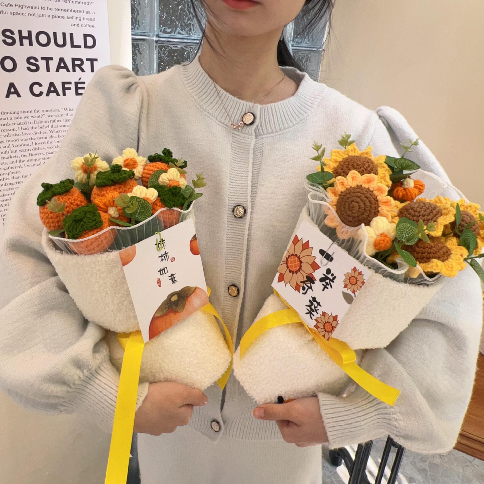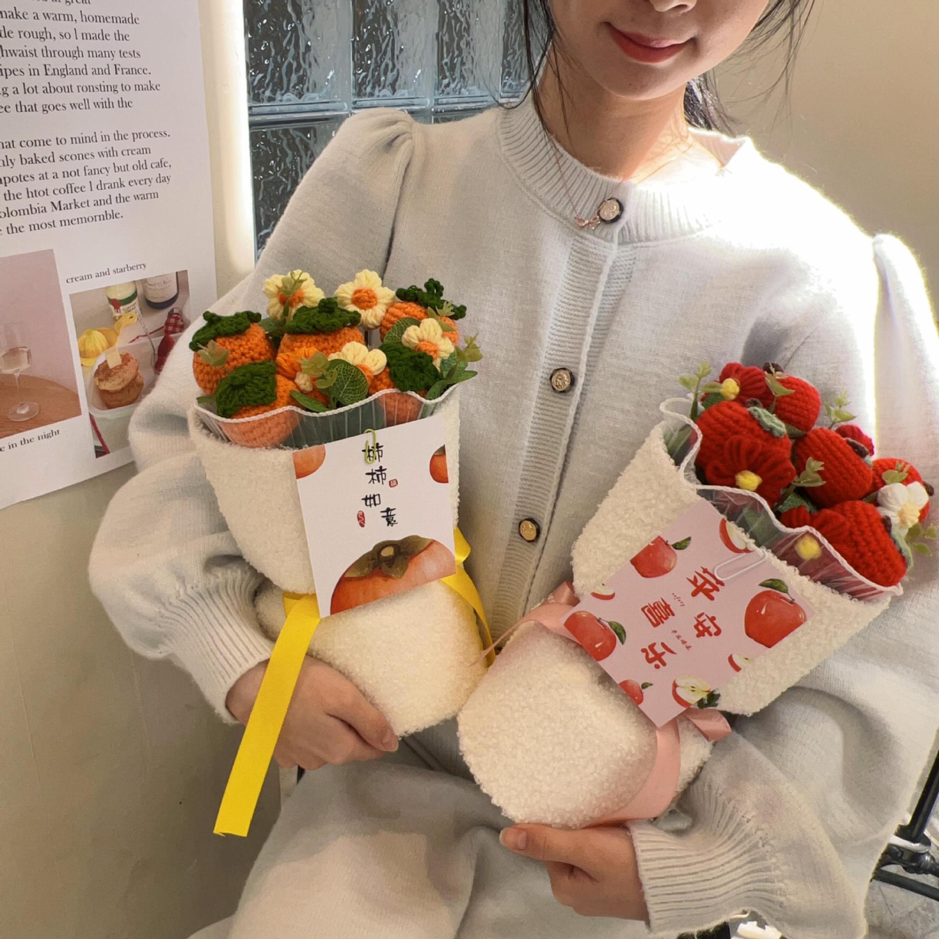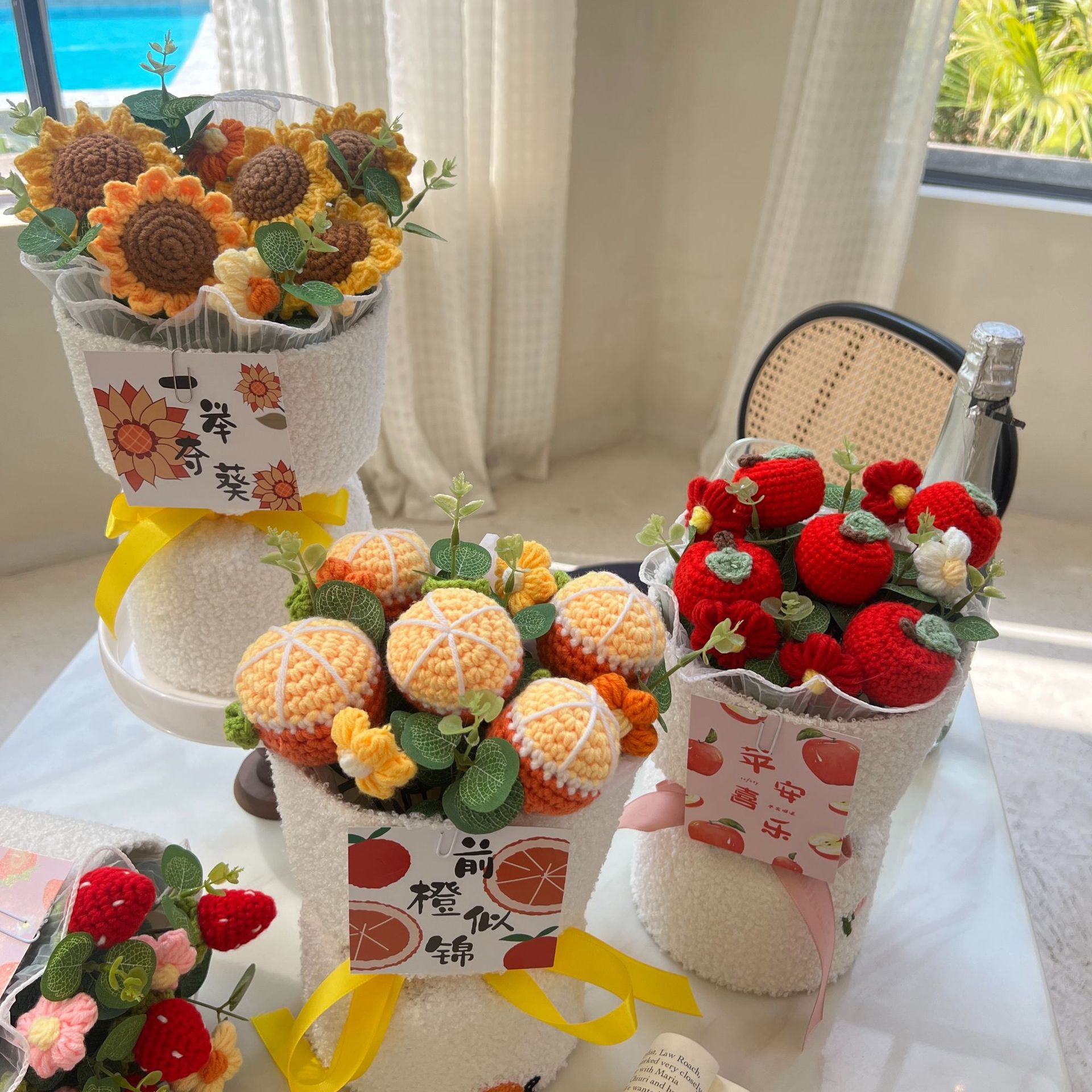 Regalo del día de la madre Ramo de fruta de fresa de lana tejida a mano Regalo de cumpleaños para niñas Flor de graduación de girasol