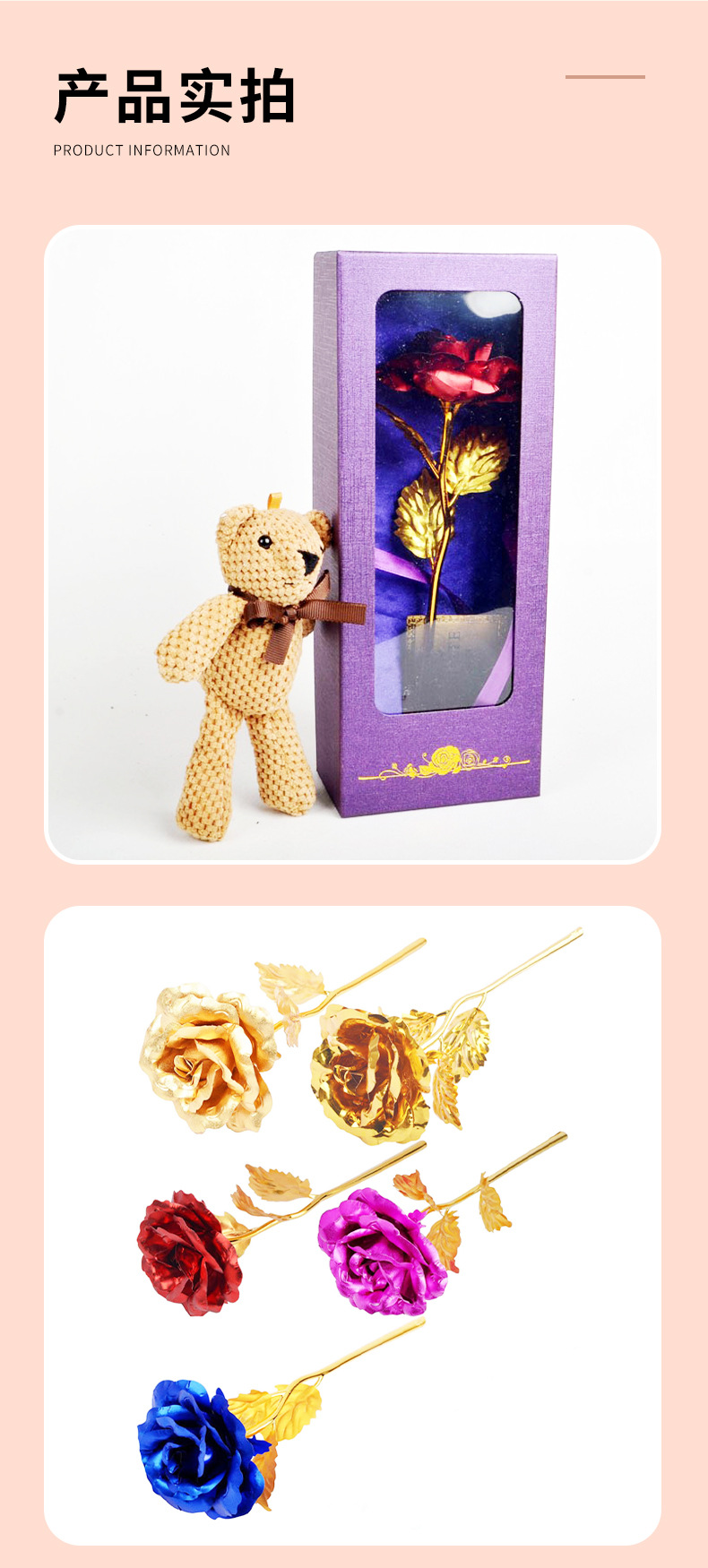 | Color | Caja Polvo Frosted Gold Rose,Caja Rosa Roja,Caja negra Frosted Gold Rose,Caja negra Rosa roja,Caja negra azul rosa,Caja negra Rose,Caja púrpura Frosted Gold Rose,Caja púrpura rosa roja,Colgante de pecho de peluche amarillo,Caja púrpura azul + pequeña flor AMOR base,Purple Box Purple + flor pequeña base de AMOR |