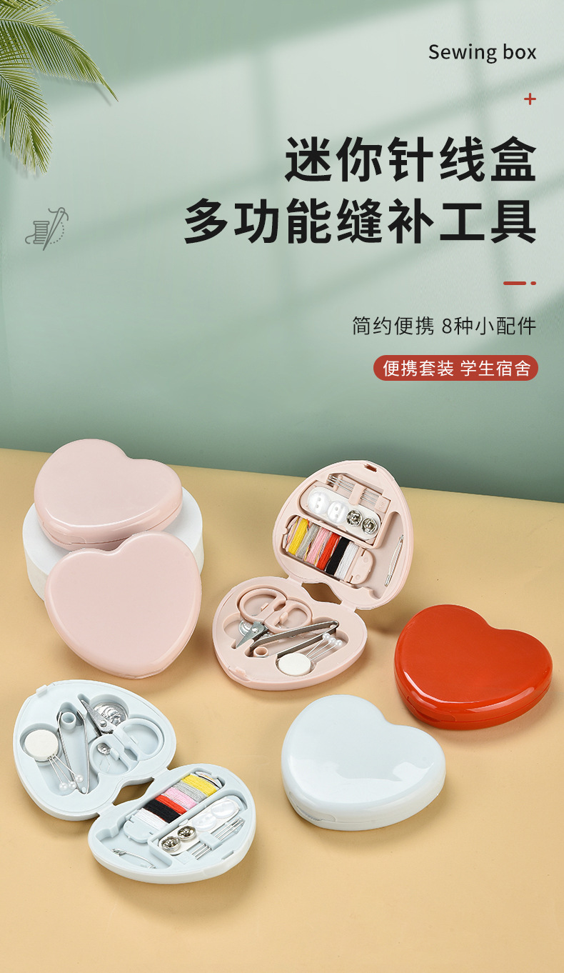 Nuevo creativo multi-funcional dormitorio estudiantil 8-pieza en forma de corazón mini portátil aguja de coser e hilo caja de almacenamiento traje