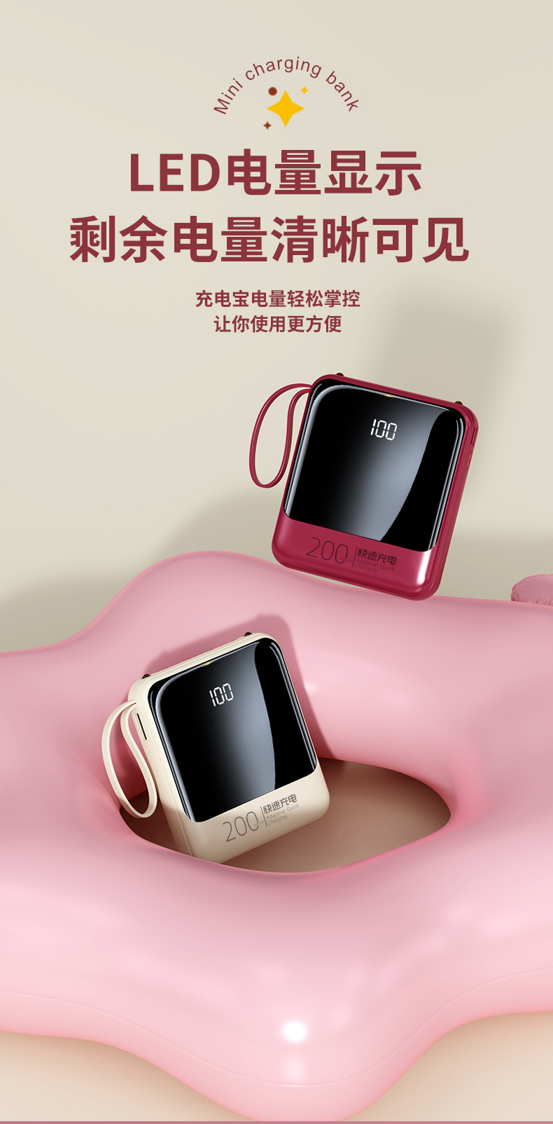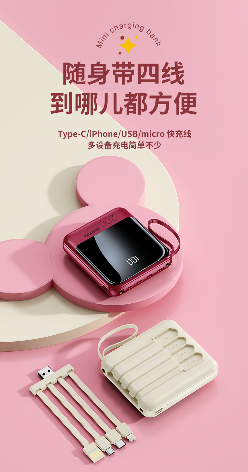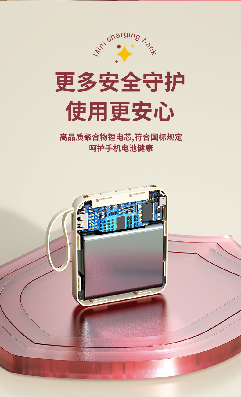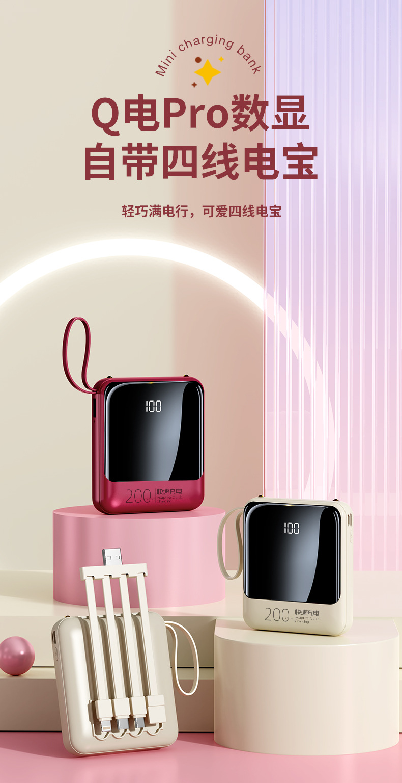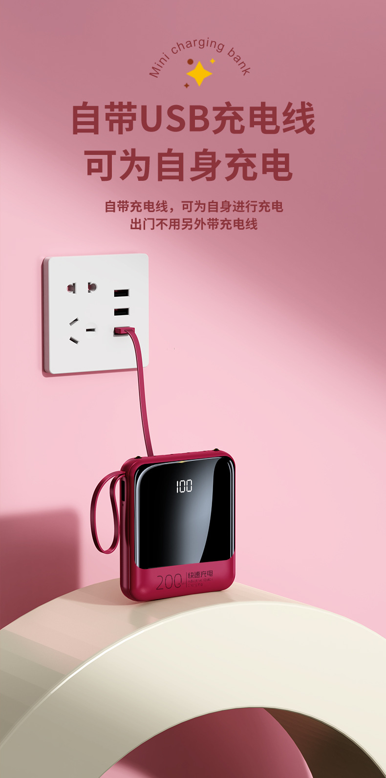 Batería Externa Compacta de 10000 mAh con Carga Rápida de 22.5 W, Cable Integrado, Color Rojo Rosa, Fuente de Alimentación Móvil, Regalo, Logotipo, Carga Rápida