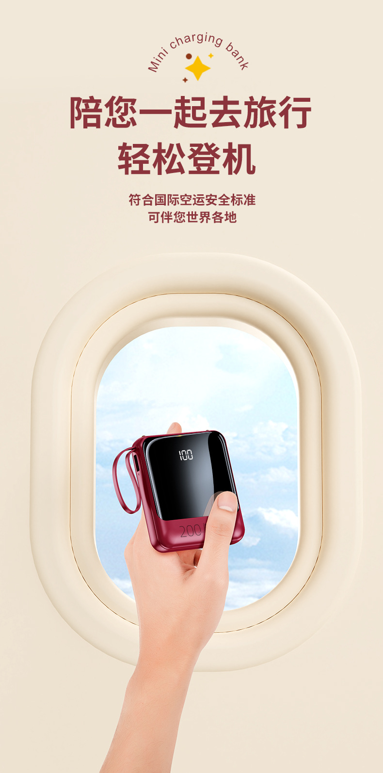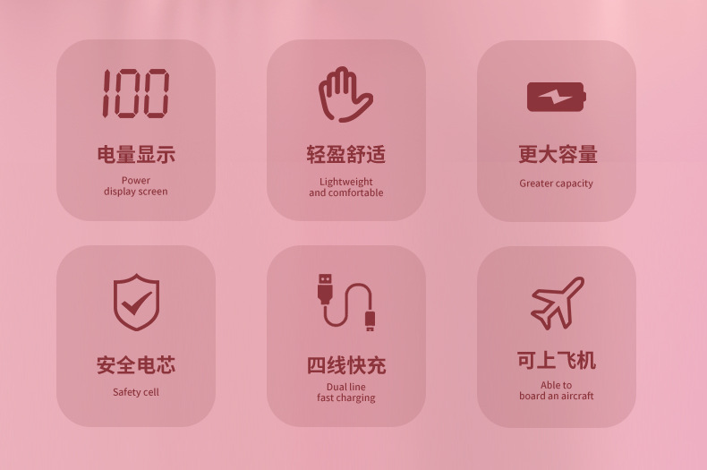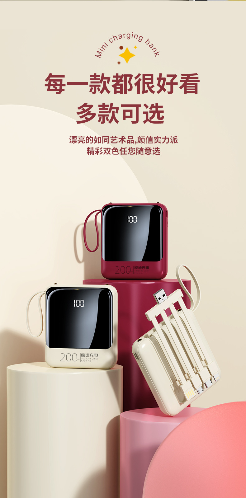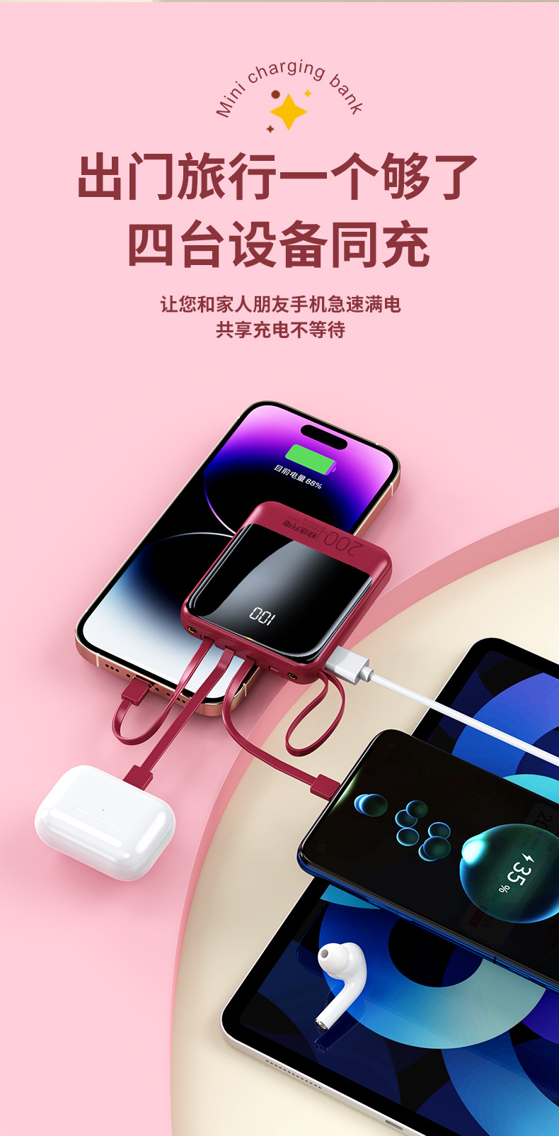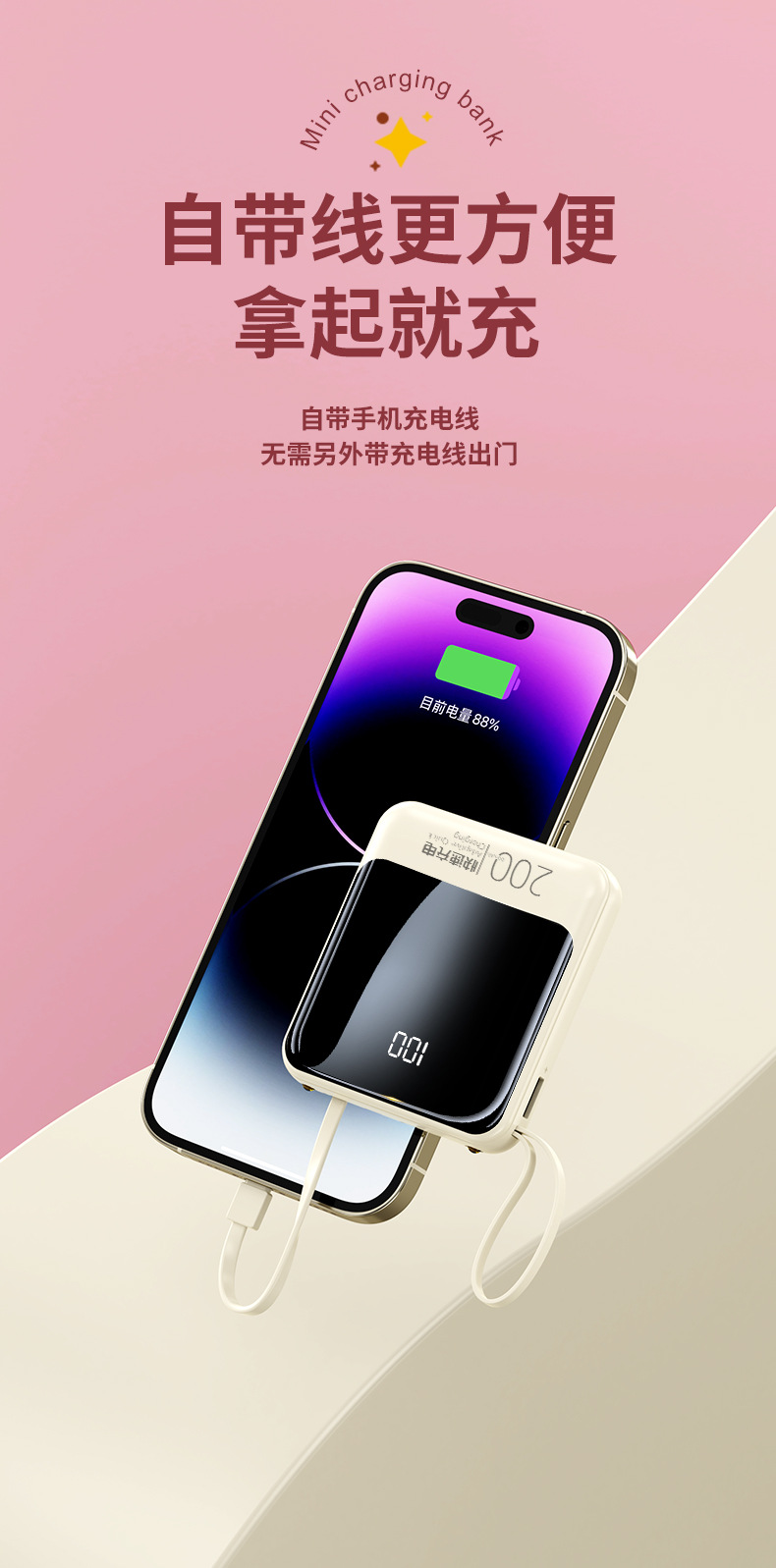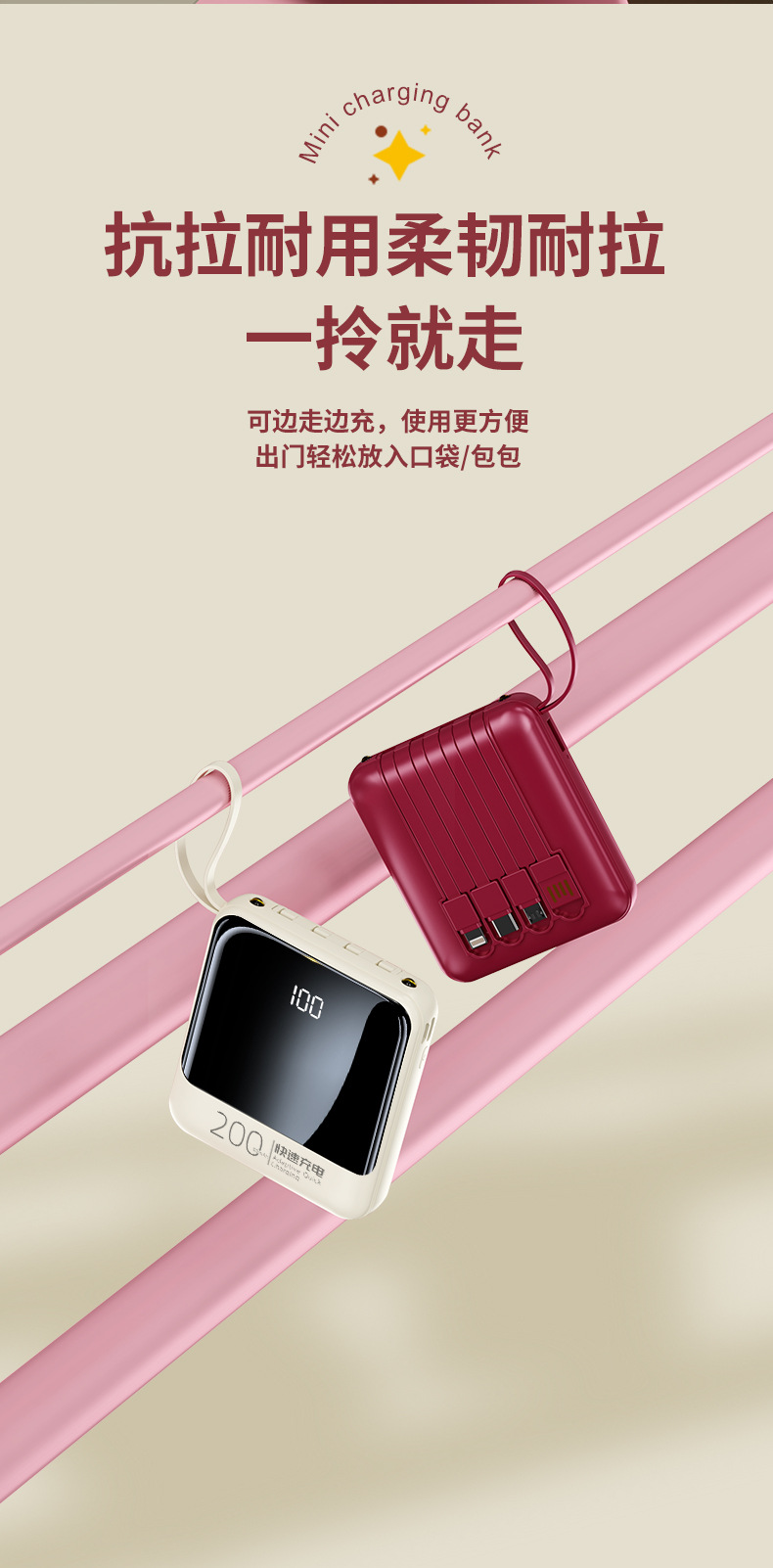 Batería Externa Compacta de 10000 mAh con Carga Rápida de 22.5 W, Cable Integrado, Color Rojo Rosa, Fuente de Alimentación Móvil, Regalo, Logotipo, Carga Rápida