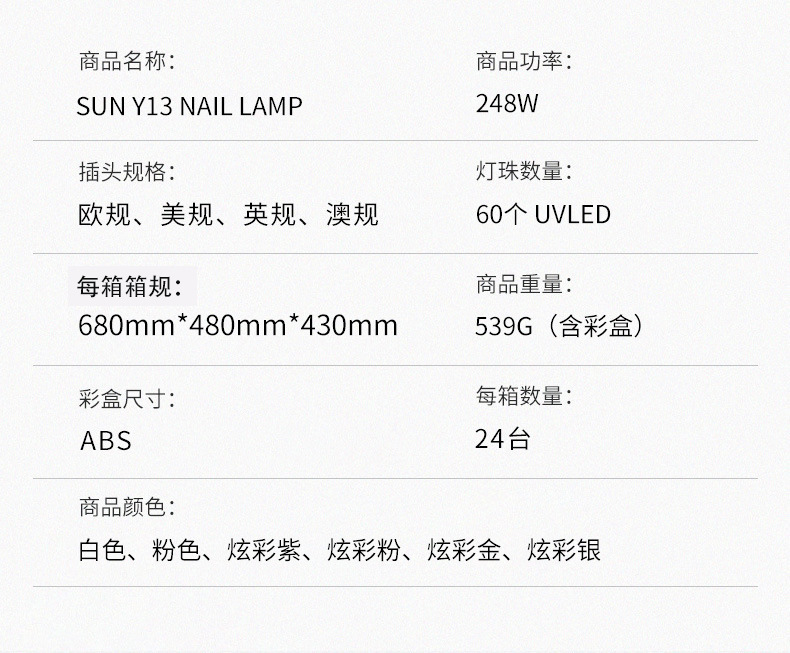 | Especificaciones | Blanco-enchufe estándar americano (aplicable a China, los Estados Unidos, Japón y otros países),Blanco-Enchufe estándar europeo (aplicable a Alemania, Francia, Rusia, Corea del Sur y otros países),Enchufe blanco del Reino Unido (aplicable al Reino Unido, Singapur, Malasia, India y otros países),Enchufe blanco australiano (aplicable a Australia, Nueva Zelanda y otros países),Colorido púrpura-enchufe estándar de EE. UU. (aplicable a China, Estados Unidos, Japón y otros países),Colorido púrpura-enchufe estándar europeo (aplicable a Alemania, Francia, Rusia, Corea del Sur y otros países),Enchufe colorido púrpura del Reino Unido (aplicable al Reino Unido, Singapur, Malasia, India y otros países),Enchufe australiano colorido de color púrpura (aplicable a Australia, Nueva Zelanda y otros países),Colorido Rosa-enchufe estándar americano (aplicable a China, Estados Unidos, Japón y otros países),Colorido Rosa-enchufe estándar europeo (aplicable a Alemania, Francia, Rusia, Corea del Sur y otros países),Polvo colorido - Enchufe británico (apto para Reino Unido, Singapur, Malasia, India y otros países),Polvo colorido - Enchufe australiano (apto para Australia, Nueva Zelanda y otros países),Enchufe colorido plateado de EE. UU. (aplicable a China, Estados Unidos, Japón y otros países),Enchufe europeo plateado y colorido (apto para Alemania, Francia, Rusia, Corea del Sur y otros países).,Enchufe colorido plateado del Reino Unido (aplicable al Reino Unido, Singapur, Malasia, India y otros países),Enchufe australiano plateado y colorido (apto para Australia, Nueva Zelanda y otros países). |