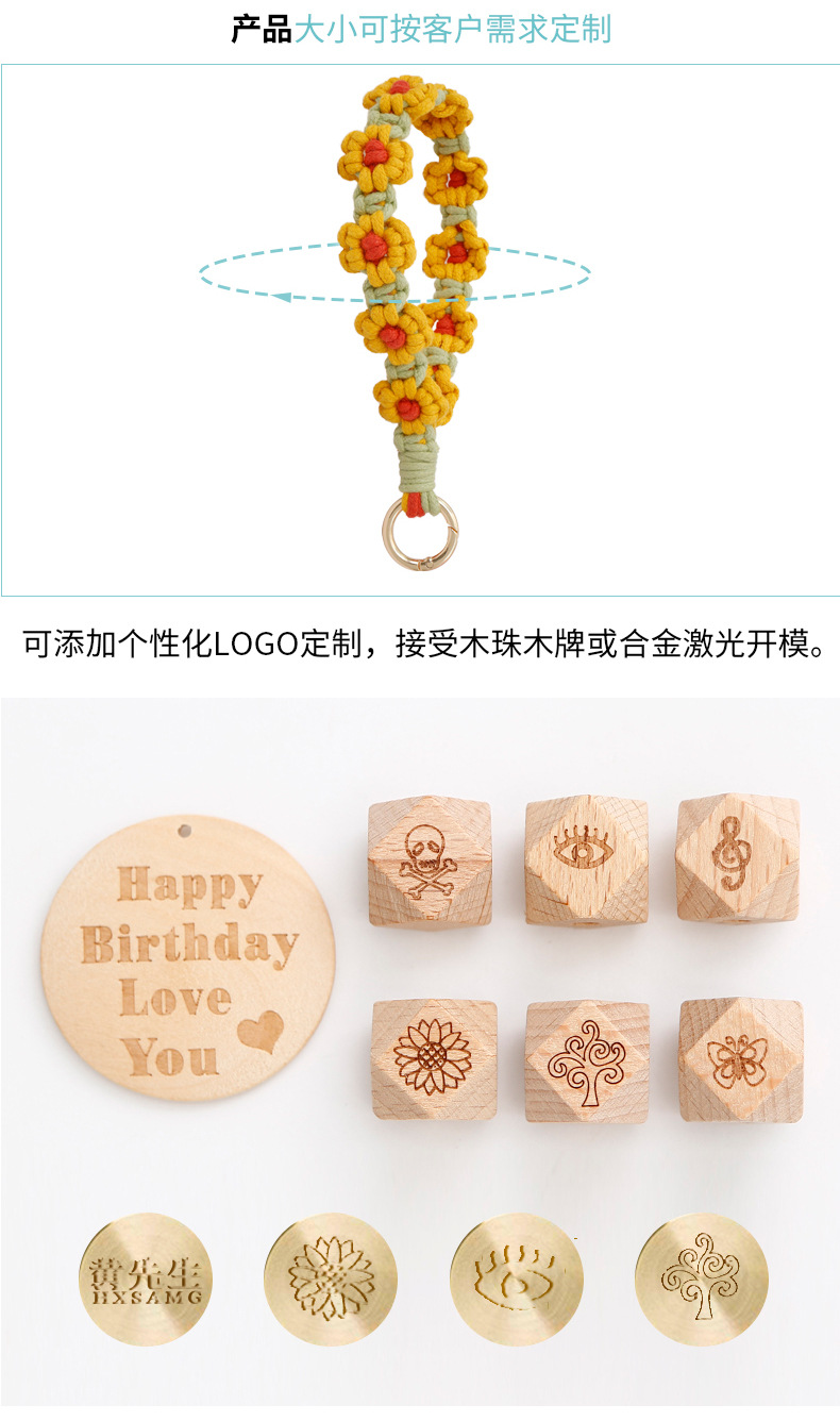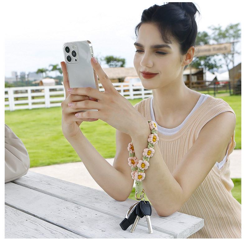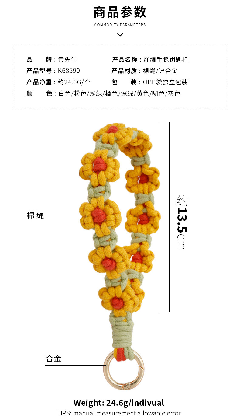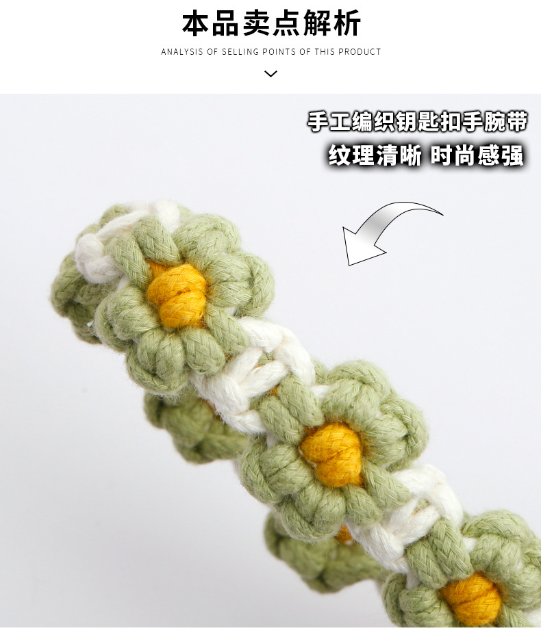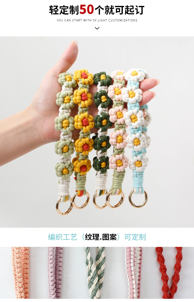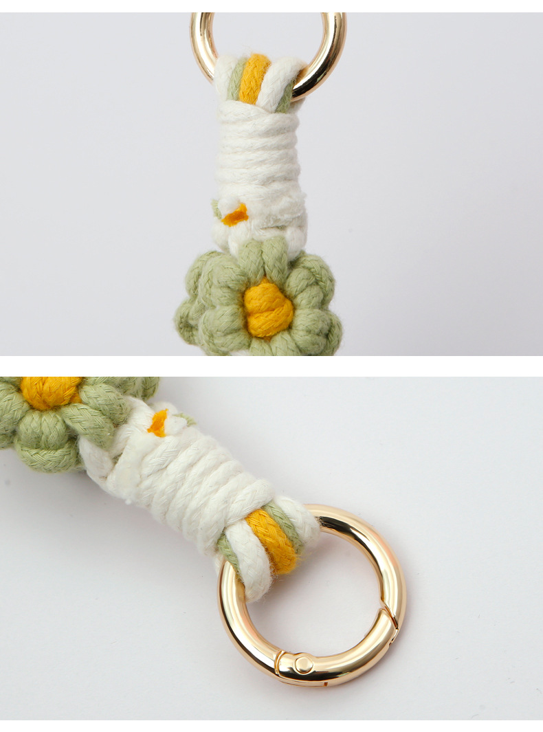 Llavero bohemio de margarita pequeña hecho a mano, planta de crisantemo, anillo de primavera, correa de muñeca trenzada, llavero