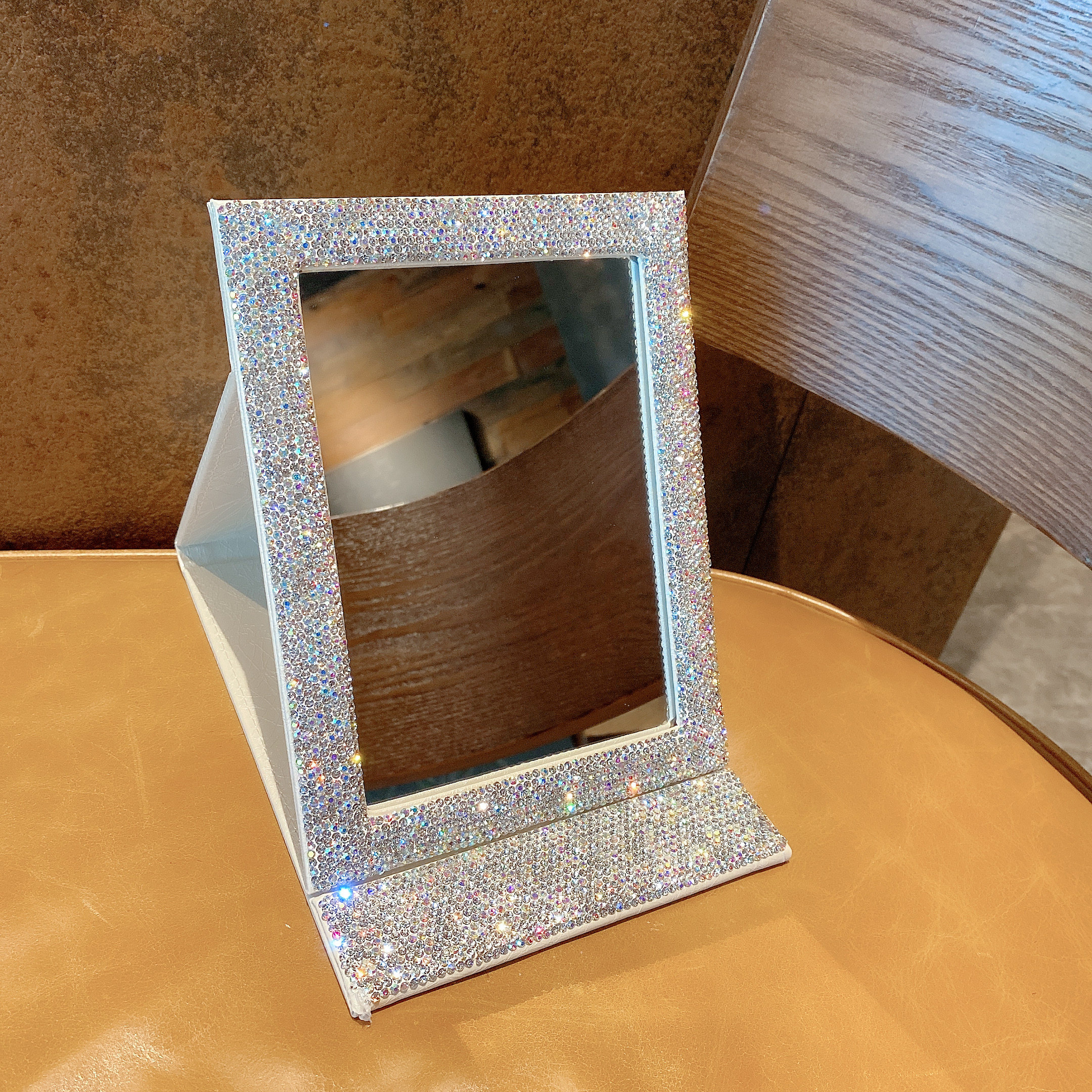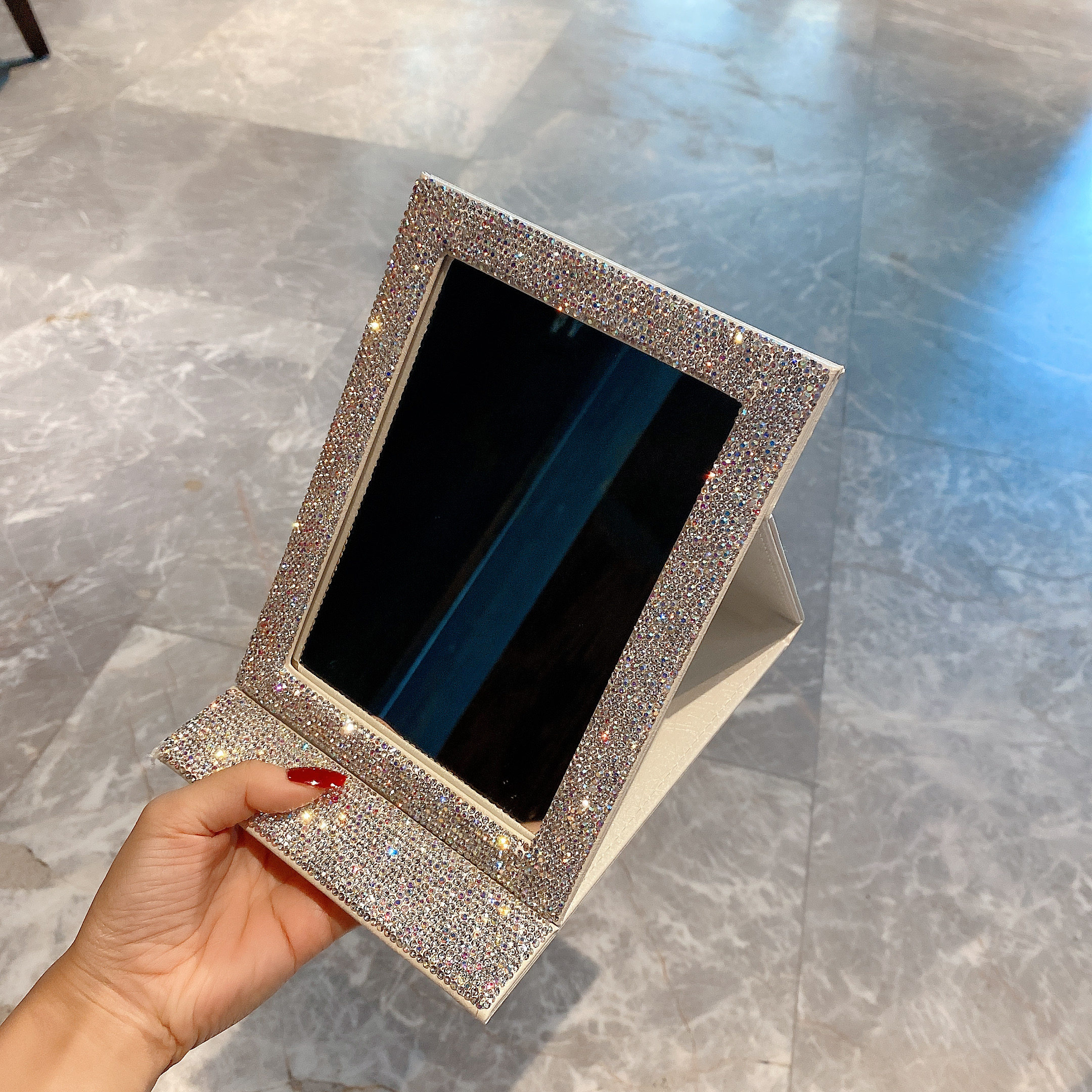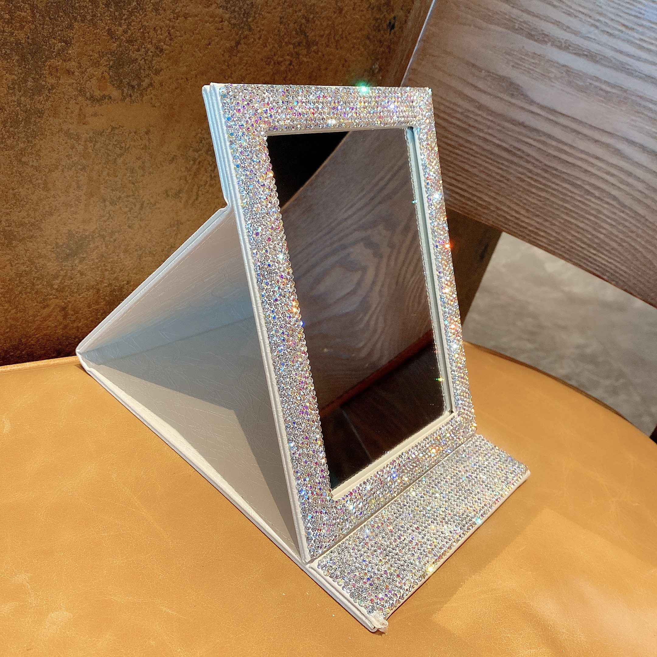 Diamante incrustado HD espejo plegable brillo cuero PU cuero chica dormitorio portátil escritorio espejo cosmético