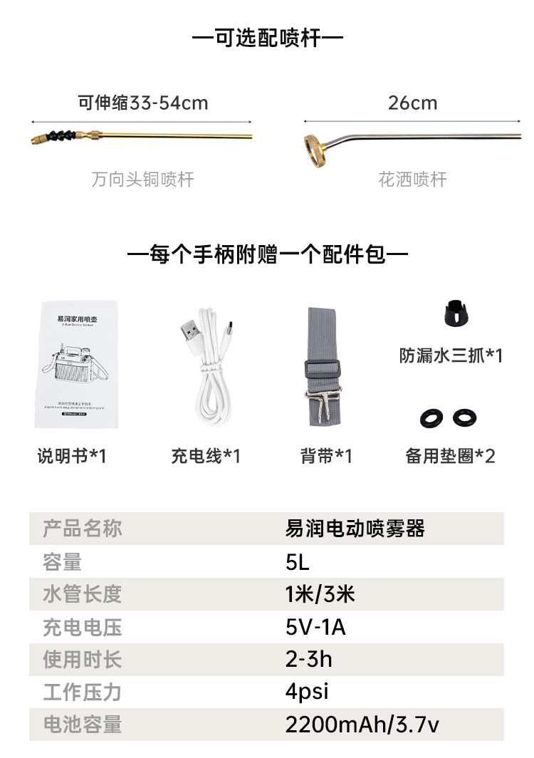 | Especificaciones | Yirun 5L pulverizador eléctrico (estándar),Yirun 5L pulverizador eléctrico + varilla telescópica de cobre,Yirun 5L pulverizador eléctrico + rociador de ducha Rod,Yirun 5L pulverizador eléctrico + Tubo de extensión de 3 m,5L Estándar Eléctrico + Tubo de la extensión de 3 M + espray de cobre Rod,5L eléctrico + Tubo de extensión de 3 m + rociador de ducha Rod |
