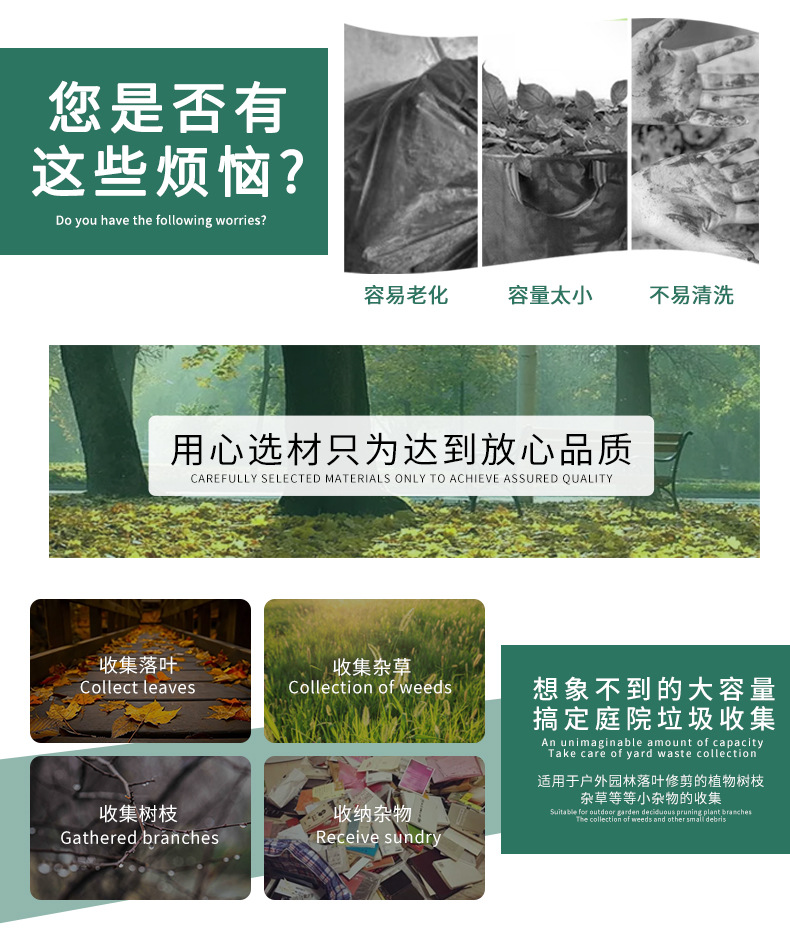 | Especificaciones | 60L 45*38cm * 3 unid/set + 1 par de guantes,120L 45*76cm * 3 unid/set + 1 par de guantes,272L 67*76cm * 3 unid/set + 1 par de guantes,300L 67*84cm * 3 unid/set + 1 par de guantes,400L 80*80cm * 3 unid/set + 1 par de guantes,500L 86*86cm * 3 unid/set + 1 par de guantes,120L + 272L + 1 par de guantes,200L + 300L + 1 par de guantes,400L + 500L + 1 par de guantes |