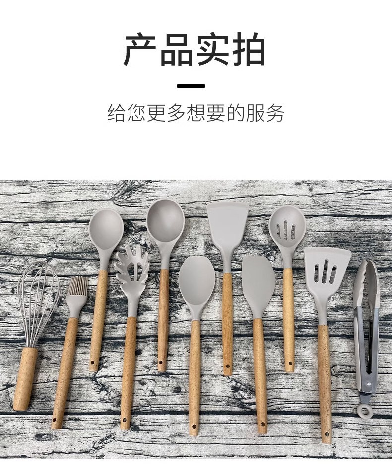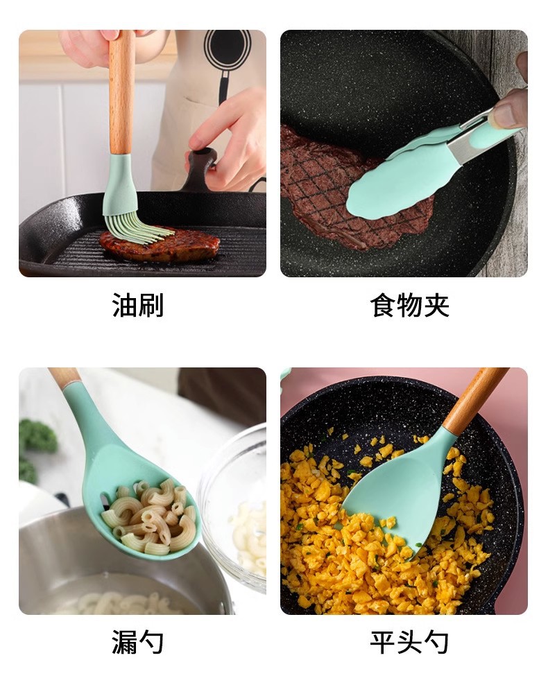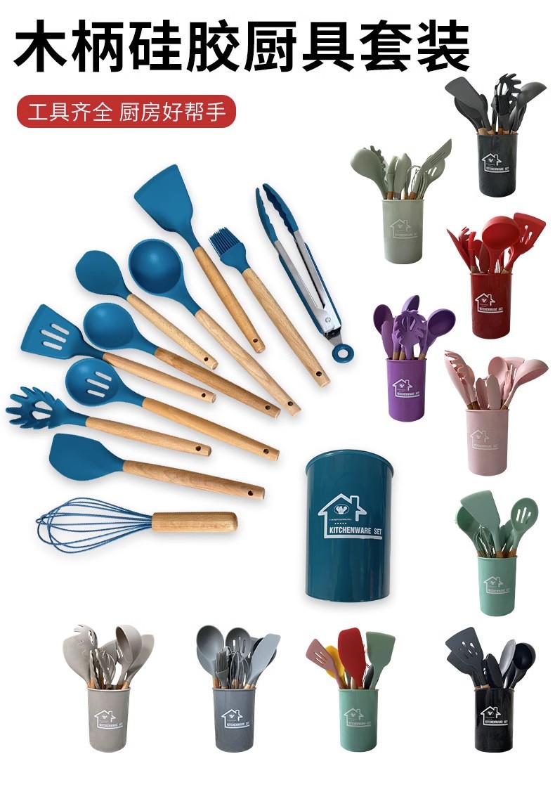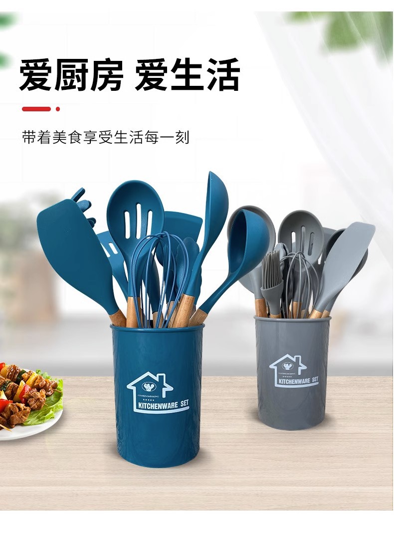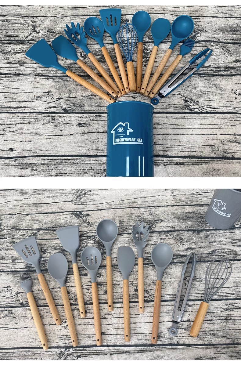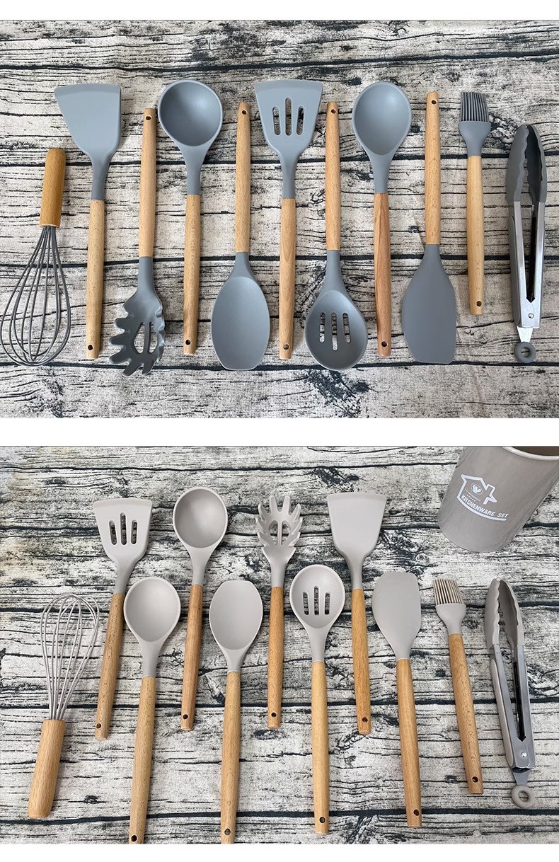 Utensilios de cocina de silicona transfronterizos 12 piezas de cocina sartén antiadherente mango de madera pala de silicona cuchara traje de cocina utensilios de cocina domésticos