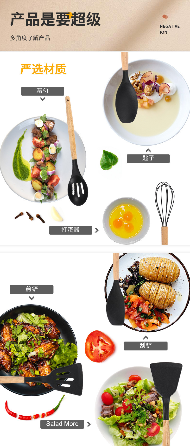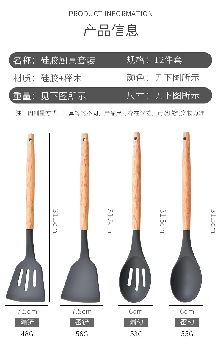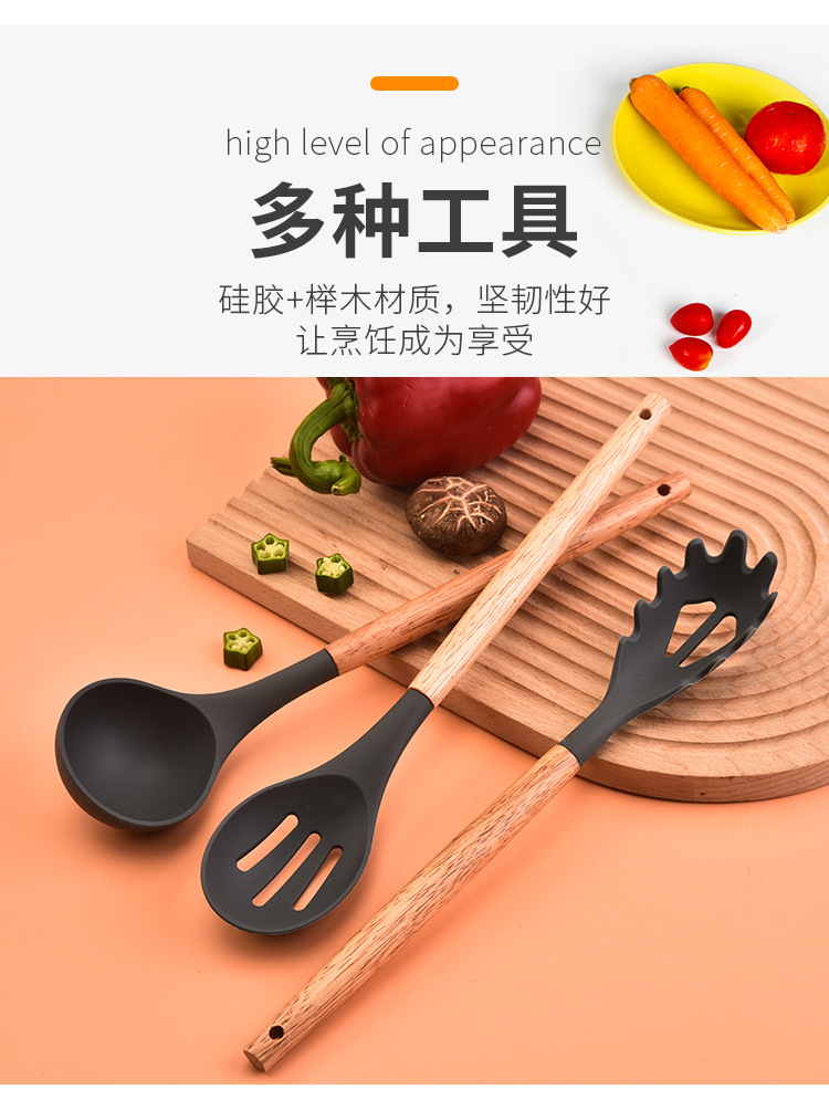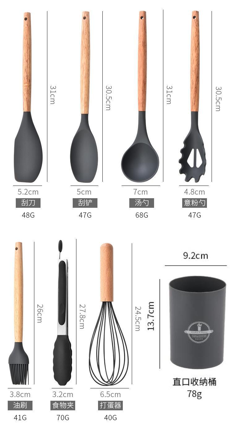 Juego de utensilios de cocina de silicona con mango de madera de doce piezas, de colores, para almacenar espátulas y cucharas resistentes a altas temperaturas y aptas para uso con alimentos, en stock.