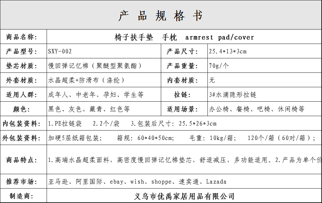 Reposabrazos cojín Silla de espuma de memoria almohada de mano almohada de codo Amazon popular Home Office eBay suministro transfronterizo caliente