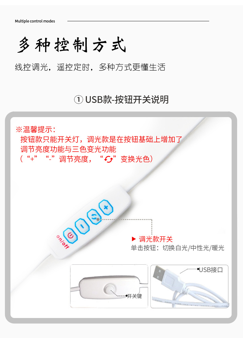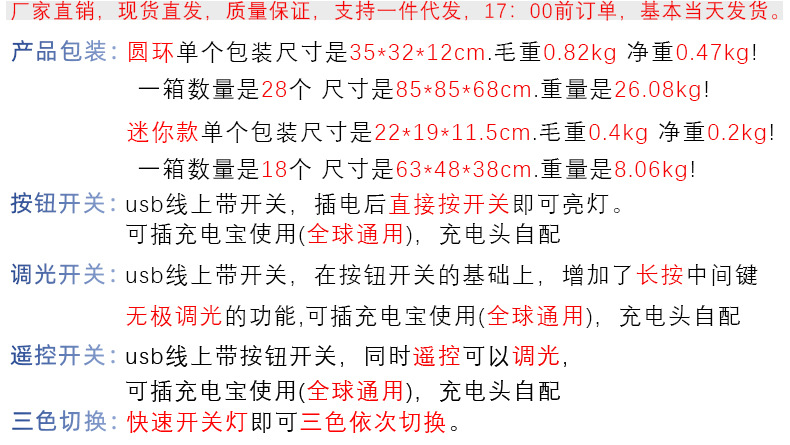 | Especificaciones | 5v [luz cálida] USB interruptor de una marcha,5V [Tres colores] USB con control remoto, atenuación y temporizador,220v en línea [tres colores] cambio de luz de tres velocidades,Enchufe recto estándar europeo [tres colores] cambio de luz de tres velocidades,Enchufe recto estándar británico [tres colores] cambio de luz de tres velocidades,Atenuación multinivel USB de 5v [tres colores] |