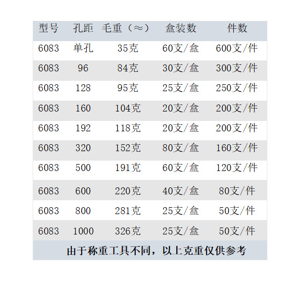 | Especificaciones | 6083-solo agujero Oro + Negro,6083-96 Oro + Negro,6083-128 oro + negro,6083-160 oro + negro,6083-192 oro + negro,6083-320 Oro + Negro,6083-446 espaciamiento de agujeros (500 de largo) Oro + Negro,6083-agujero único Oro + Oro,6083-96 Oro + Oro,6083-128 oro + oro,6083-160 oro + oro,6083-192 oro + oro,6083-320 Oro + Oro,6083-agujero único Cromo + Negro,6083-96 cromo + negro,6083-128 cromo + negro,6083-160 Cromo + Negro,6083-192 Cromo + Negro,6083-800 oro largo + oro,6083-800 oro largo + negro,6083-1 m de largo oro + oro,6083-1 m de largo oro + negro |