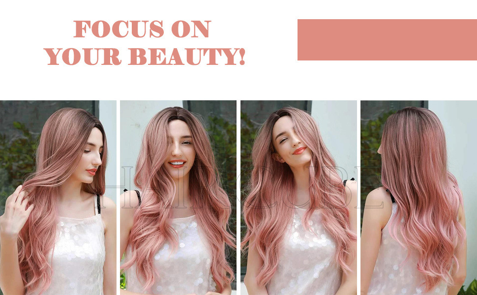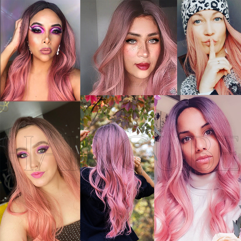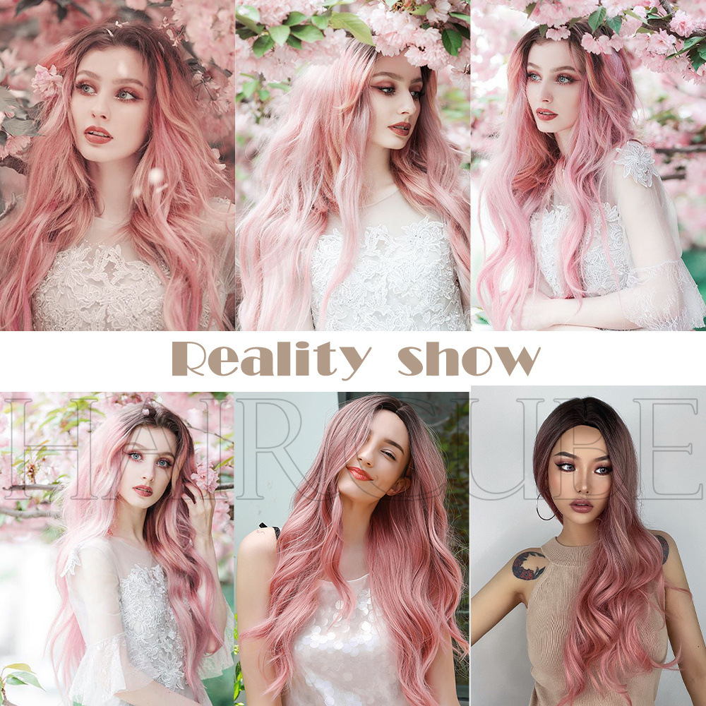 HAIRCUBE Peluca transfronteriza de estilo europeo y americano, la parte superior de la cabeza está teñida de negro, rosa degradado, cabello rizado de longitud media, seda de alta temperatura, comercio exterior