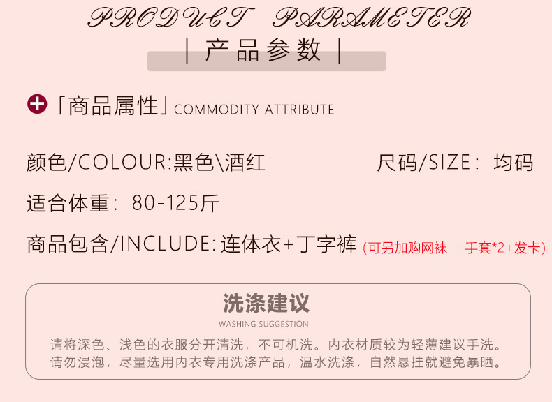 | color | Mono negro + tanga,Mono negro + tanga + medias de rejilla,Mono negro + tanga + medias de rejilla + horquilla + guantes*2,Mono burdeos + tanga,Mono burdeos + tanga + medias de rejilla,Mono burdeos + tanga + medias de rejilla + horquilla + guantes*2,Morado [tanga de una pieza],Púrpura [tanga de una pieza] el mismo estilo de medias moradas |