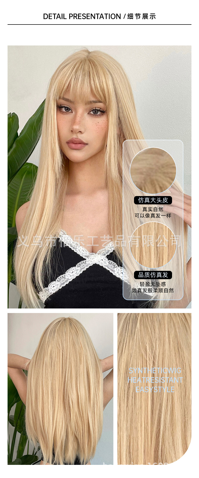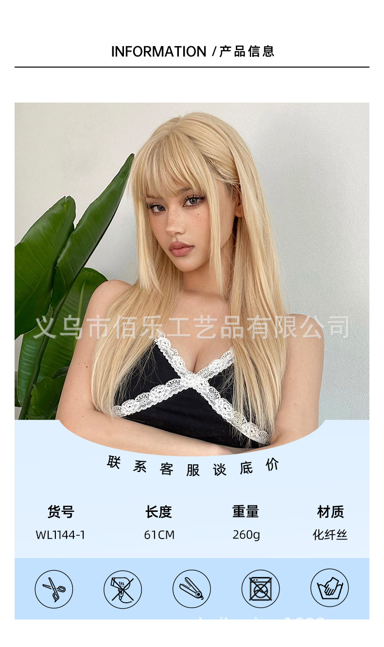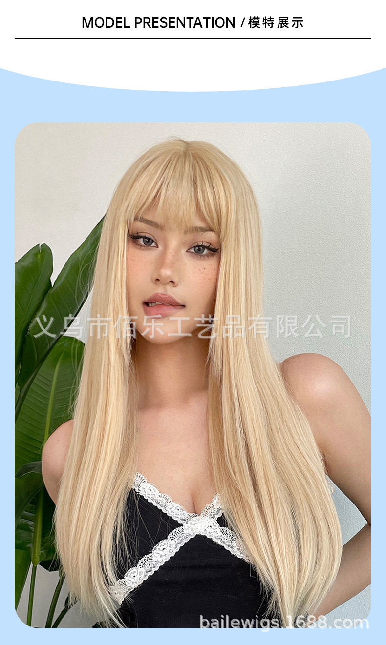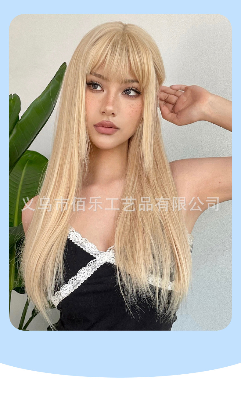 Pelucas de estilo europeo y americano, cabello largo y liso dorado con flequillo, peluca completa de fibra de alta temperatura, fabricante, venta al por mayor transfronteriza