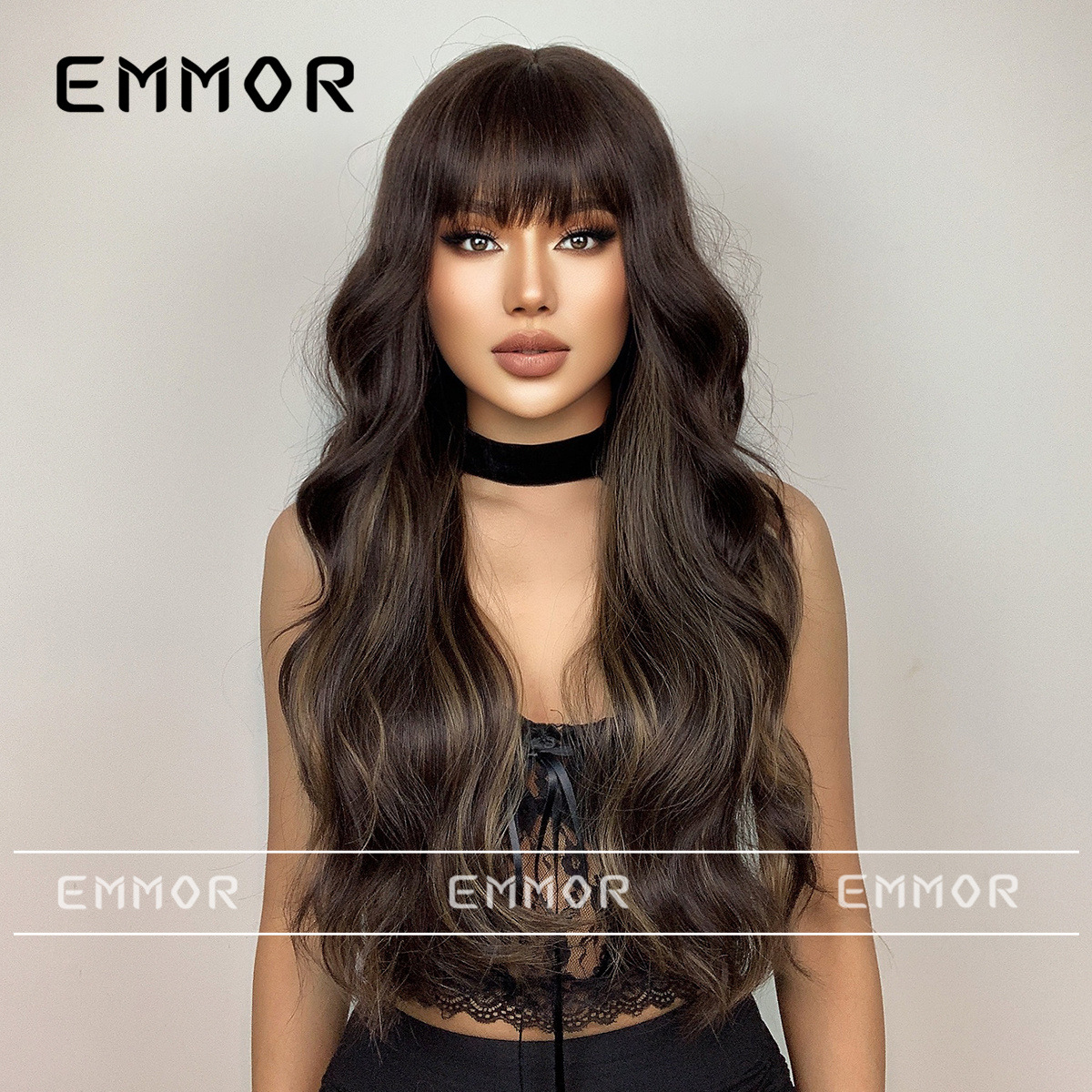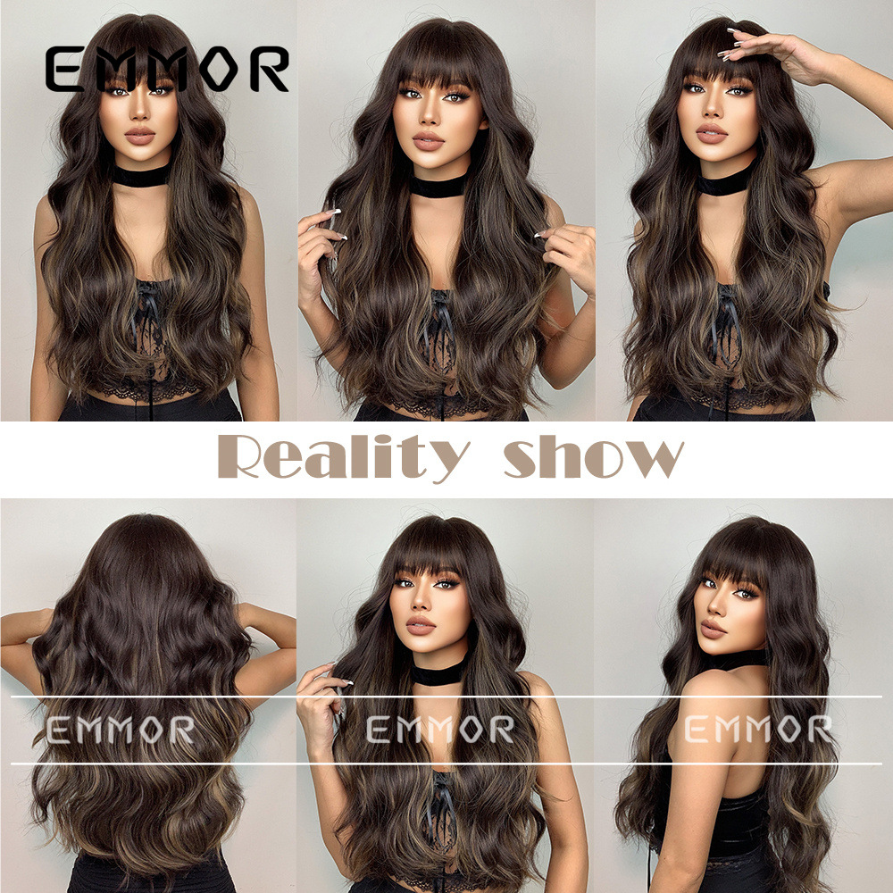 Elegante nueva moda de las mujeres Peluca de pelo largo y rizado con flequillo negro marrón estilo europeo y americano gran ola peluca cabeza cubierta