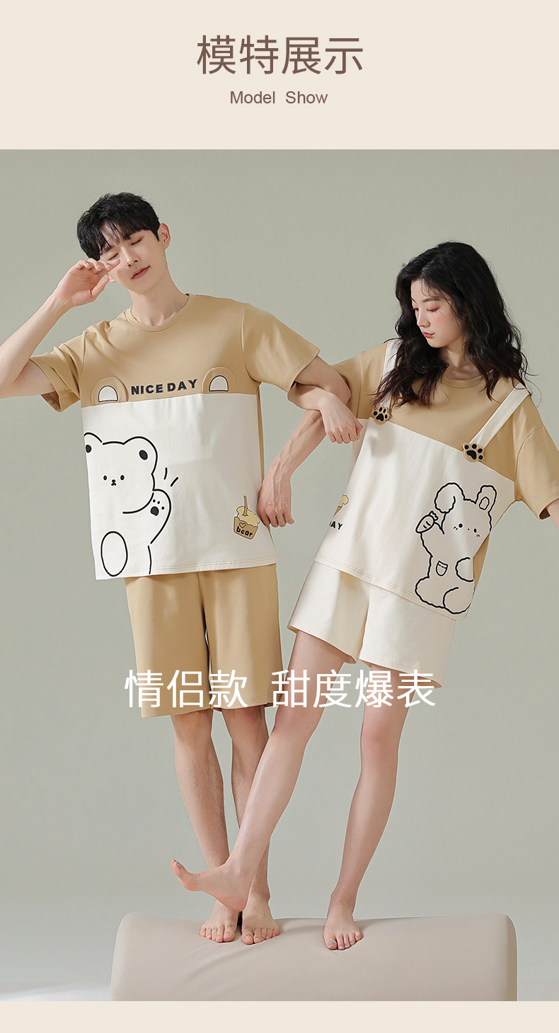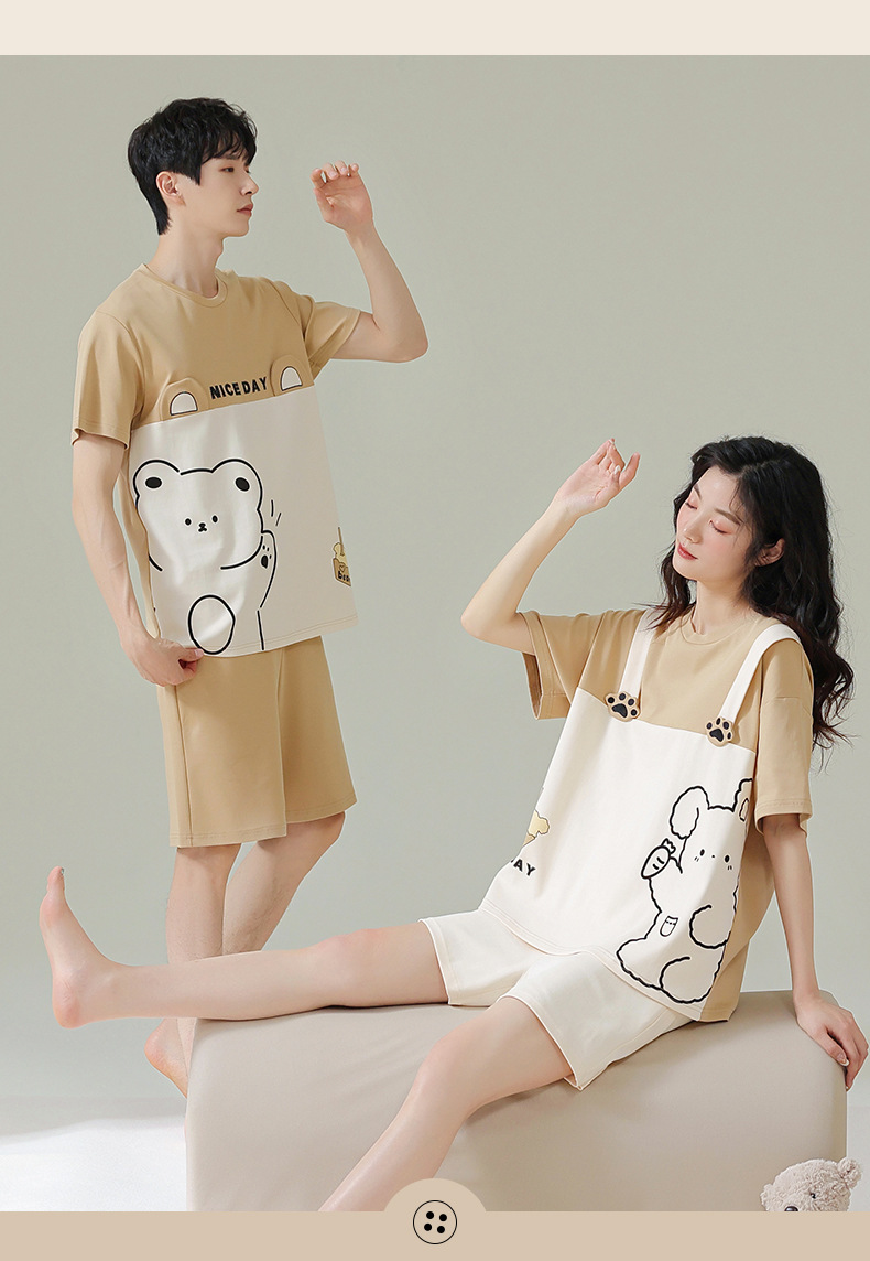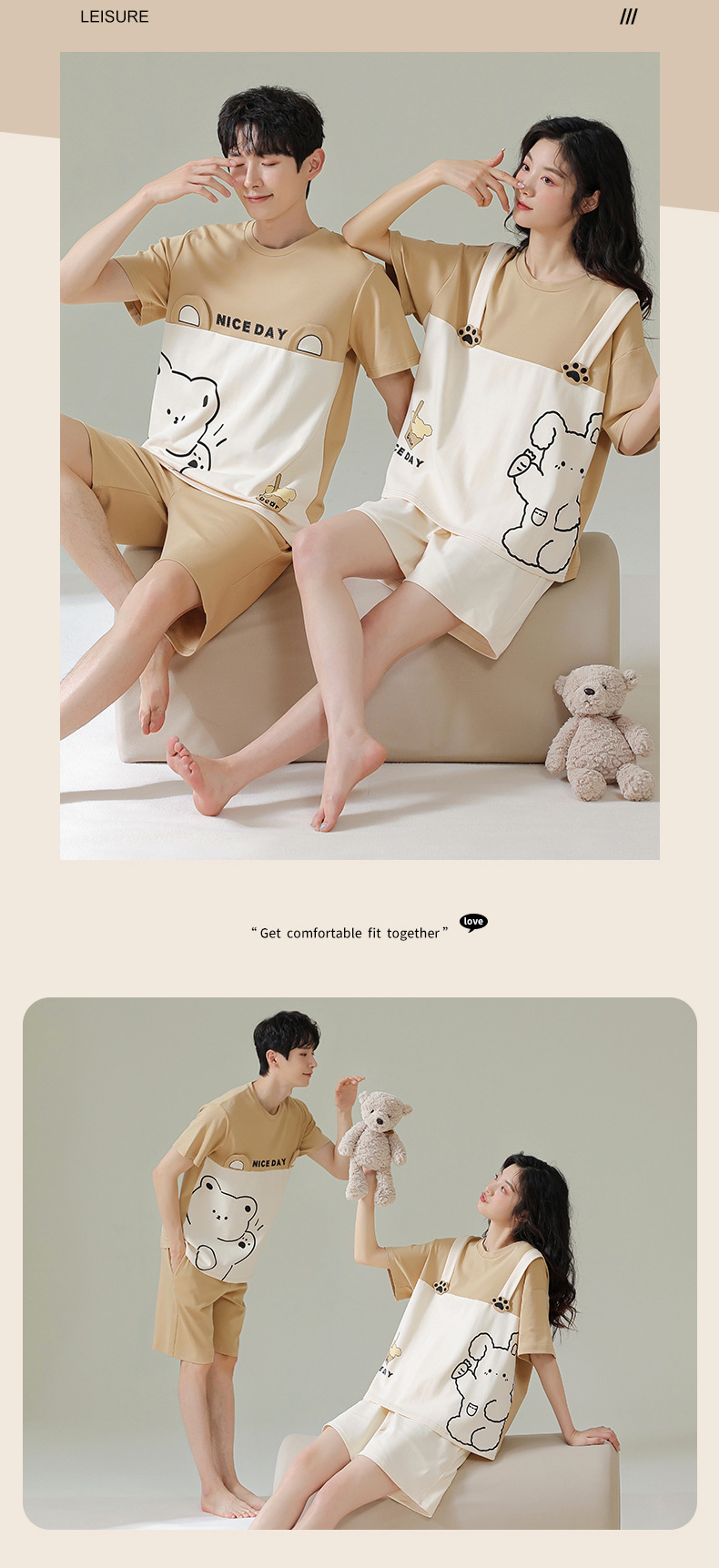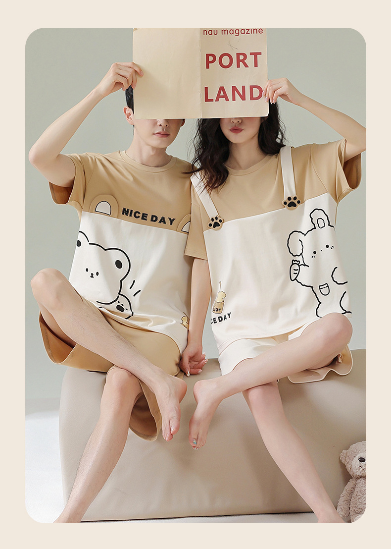 Pijamas de pareja pantalones cortos de manga corta de algodón de verano hombres y mujeres traje de homewear delgado de dibujos animados de oso lindo de algodón