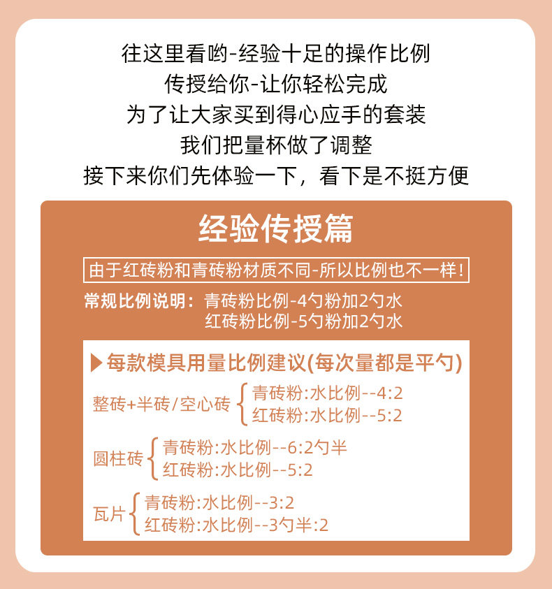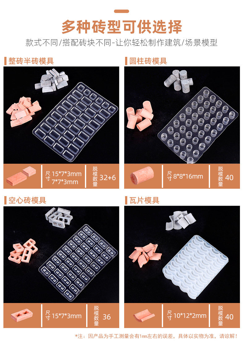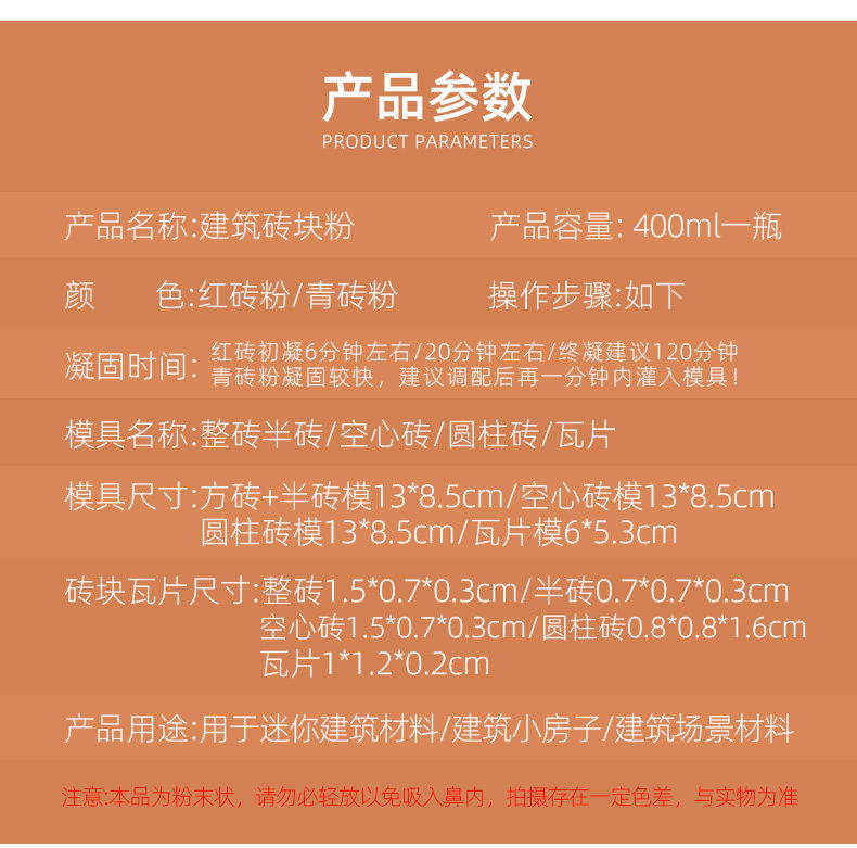 | Colores | [Ladrillos rojos caseros] Traje de experiencia,[Ladrillos azules caseros] Traje de experiencia,[Ladrillos rojos caseros] Traje de entrada,[Ladrillos azules caseros] Traje de entrada,[Ladrillos rojos caseros] Conjunto estándar,[Ladrillos azules caseros] Juego de edición estándar,[Ladrillos rojos caseros] Traje de gama alta,[Ladrillos azules caseros] Traje de gama alta,[Ladrillos rojos caseros] Traje de lujo,[Ladrillos azules caseros] Traje de lujo,Polvo de ladrillo rojo 400g 1 botella,Polvo de ladrillo verde 400g 1 botella,1 molde de medio ladrillo de ladrillo completo,1 molde de bloque de ladrillo hueco (cabello aleatorio transparente blanco),Molde de ladrillo cilíndrico 1 pieza,1 molde de baldosas,Juego completo de moldes de ladrillos y tejas,Molde de ladrillo grande-ladrillo completo medio ladrillo |