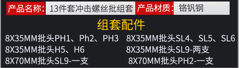 Venta al por mayor de fábrica de 13 piezas de impacto juego de destornillador de hierro destornillador de combinación de impacto destornillador de hardware