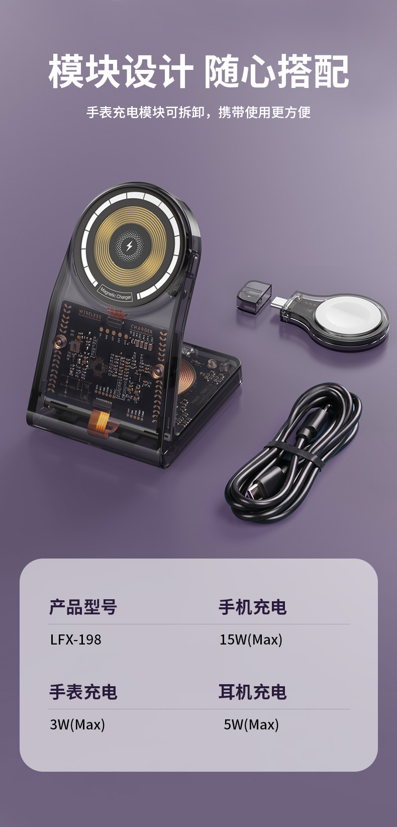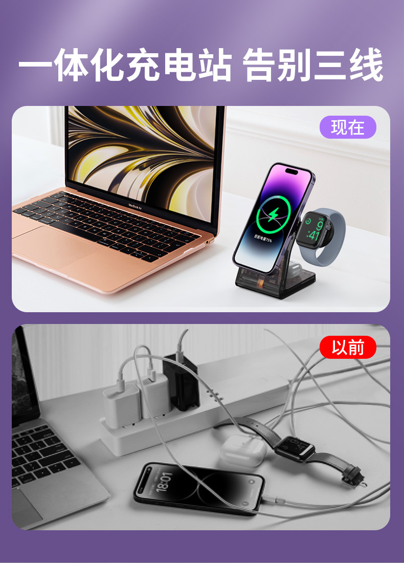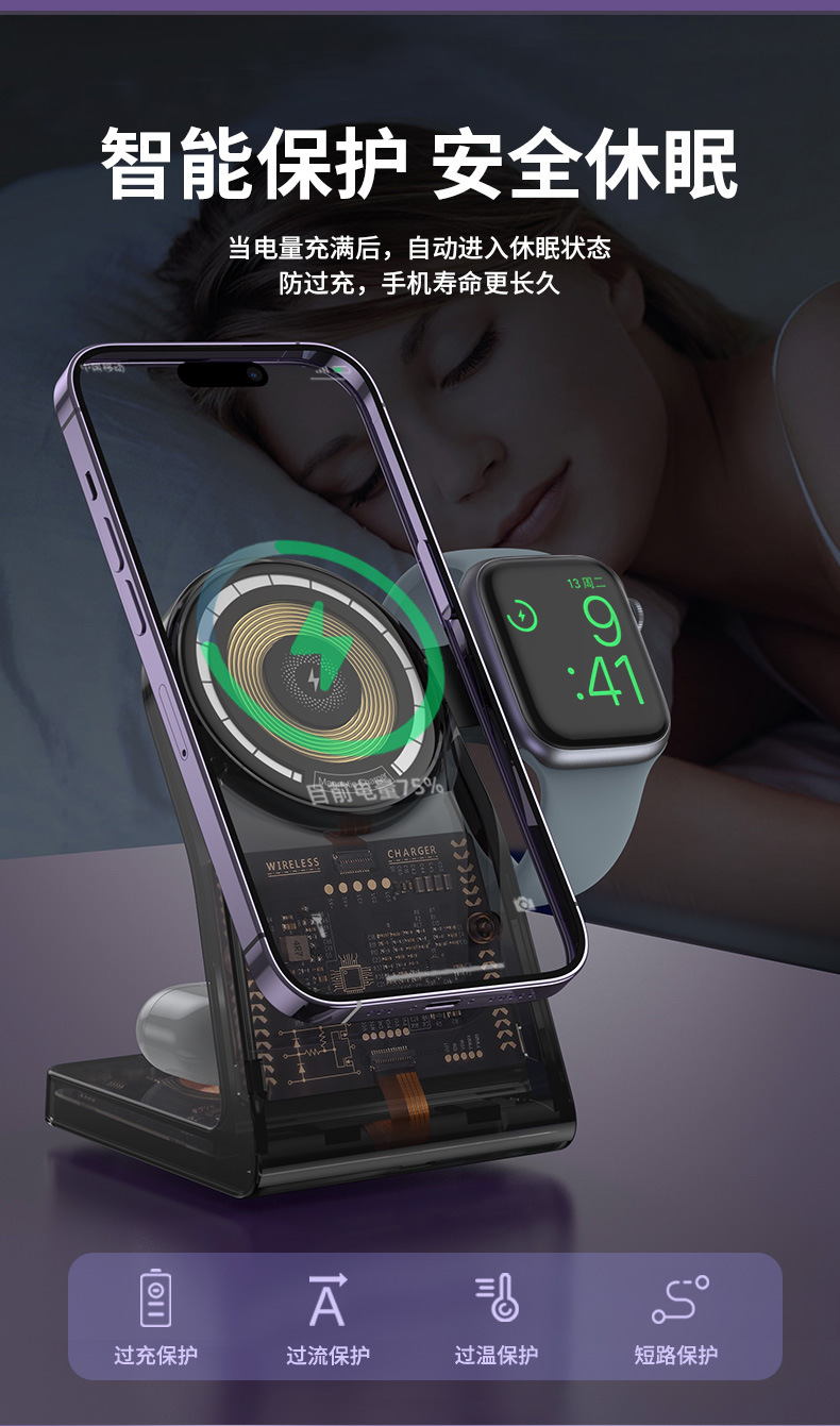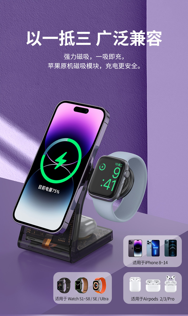 Nuevo magnético transparente tres en uno cargador inalámbrico soporte para Teléfono Móvil 15W carga rápida multifuncional cargador de reloj typec