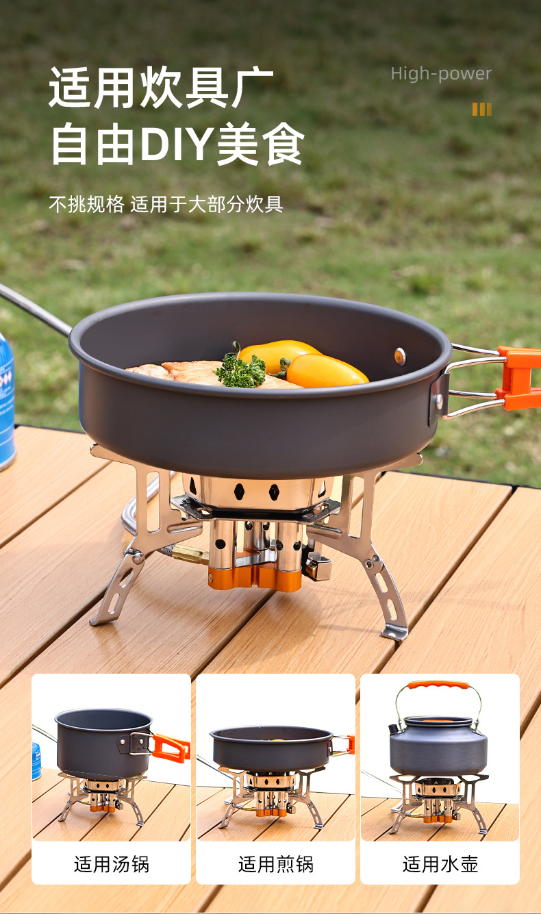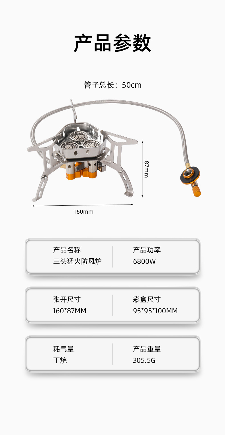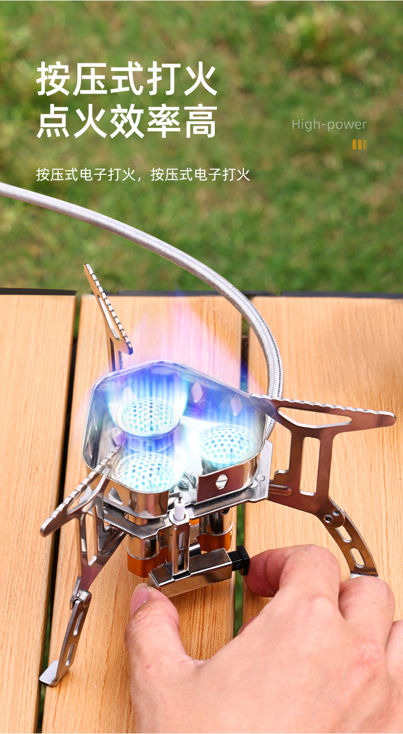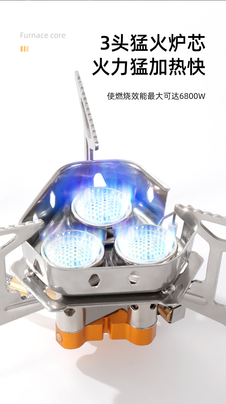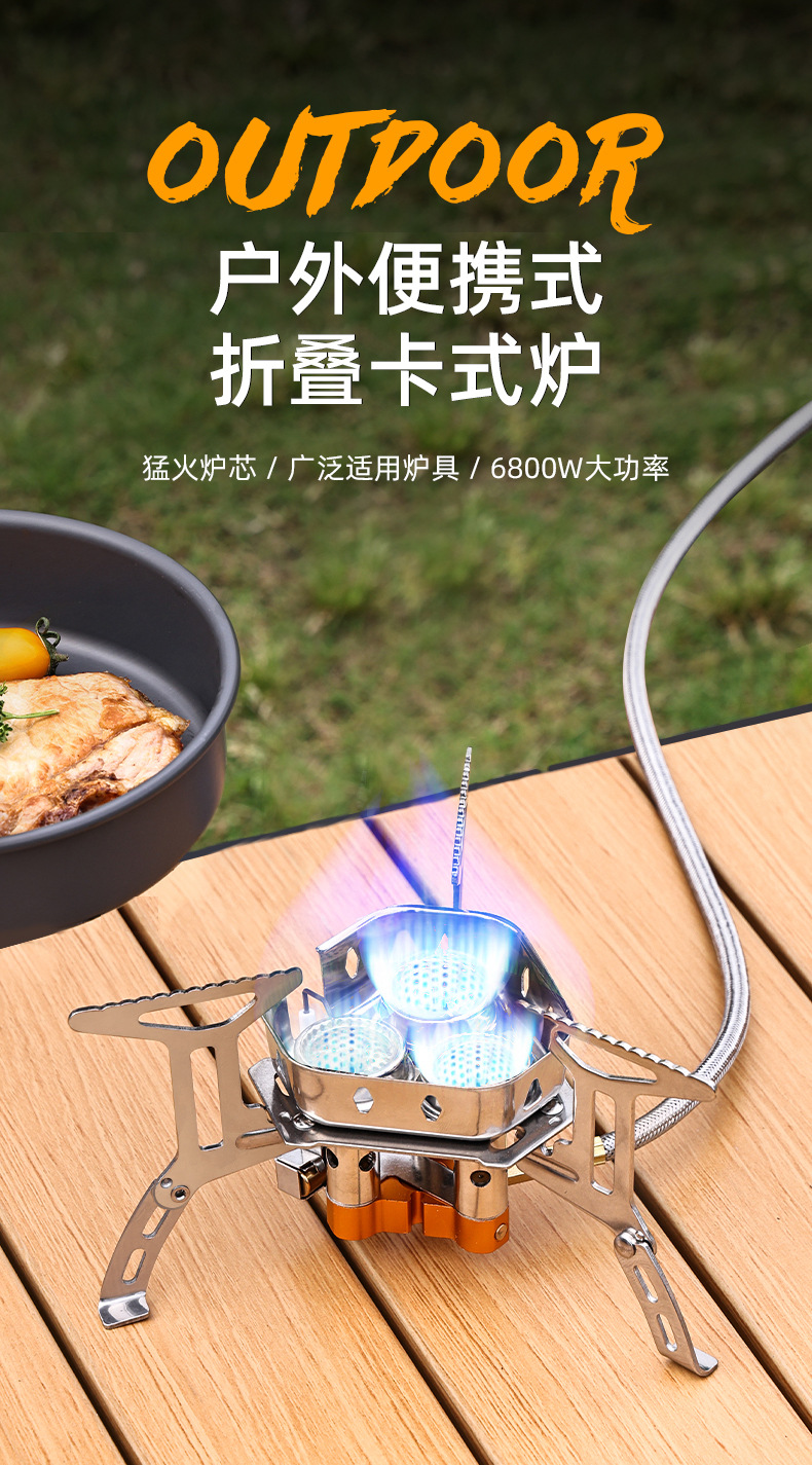 Entrega de una pieza de comercio exterior al aire libre portátil plegable tarjeta estufa de gas camping de tres cabezas estufa a prueba de viento