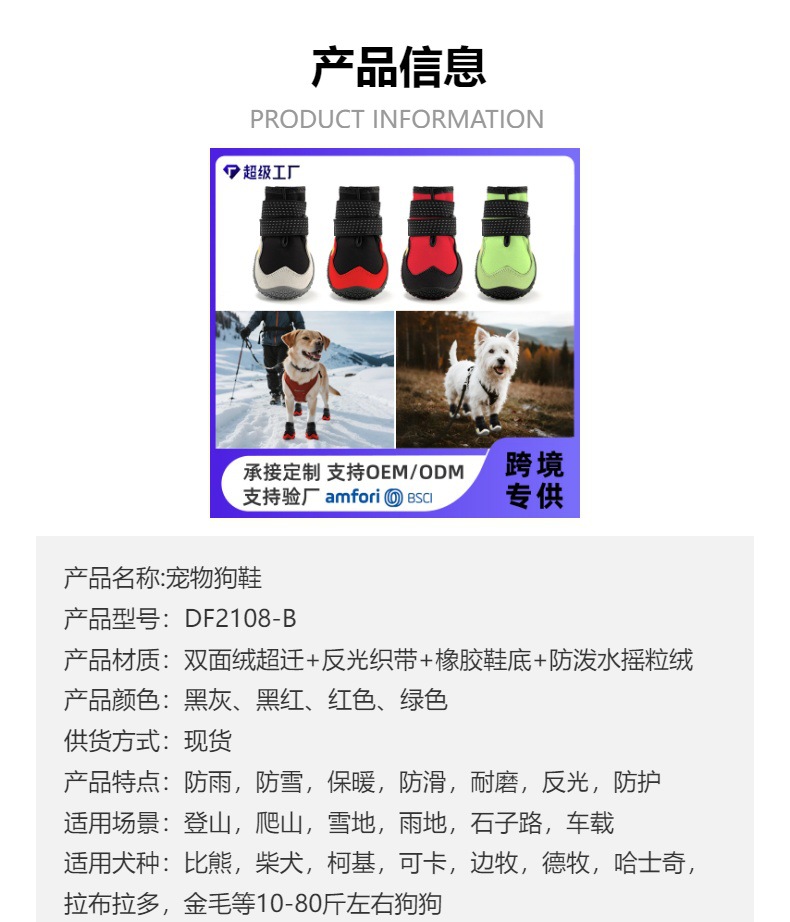 Zapatos para mascotas Zapatos para perros de Amazon Super movimiento multicolor zapatos para perros anti-Splash noche reflectante transfronteriza fábrica de zapatos para mascotas