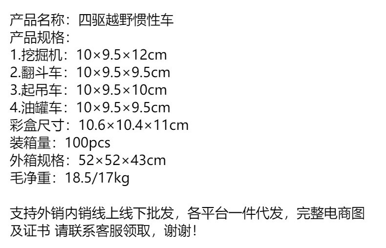 | Color | Excavadora todoterreno con tracción en las cuatro ruedas [Caja de color],Camión volquete todoterreno con tracción en las cuatro ruedas [Caja de color],Máquina de elevación fuera de carretera con tracción en las cuatro ruedas [Caja de color],Camión cisterna todoterreno con tracción en las cuatro ruedas [Caja de color] |