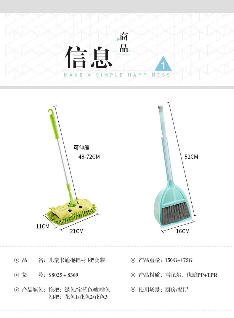 | Color | Orange escoba (conjunto de dos piezas),Escoba amarilla (conjunto de dos piezas),Escoba azul claro (conjunto de dos piezas),Fregona verde (juego de una pieza),Fregona marrón (juego de una pieza),Fregona rosa (set de una pieza),Fregona azul real (conjunto de una sola pieza),Azul claro (OSO),Caqui (oso),Oso Rosa |