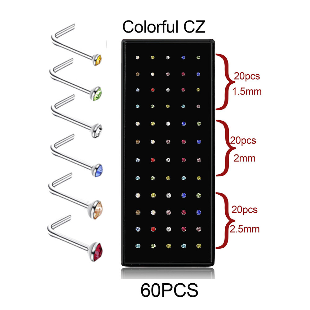 Suministro directo de fábrica 60 en caja de acero inoxidable en forma de L nariz espárragos 1,5/2,0/2,5 diamante incrustado curvado varilla nariz anillo piercing joyería