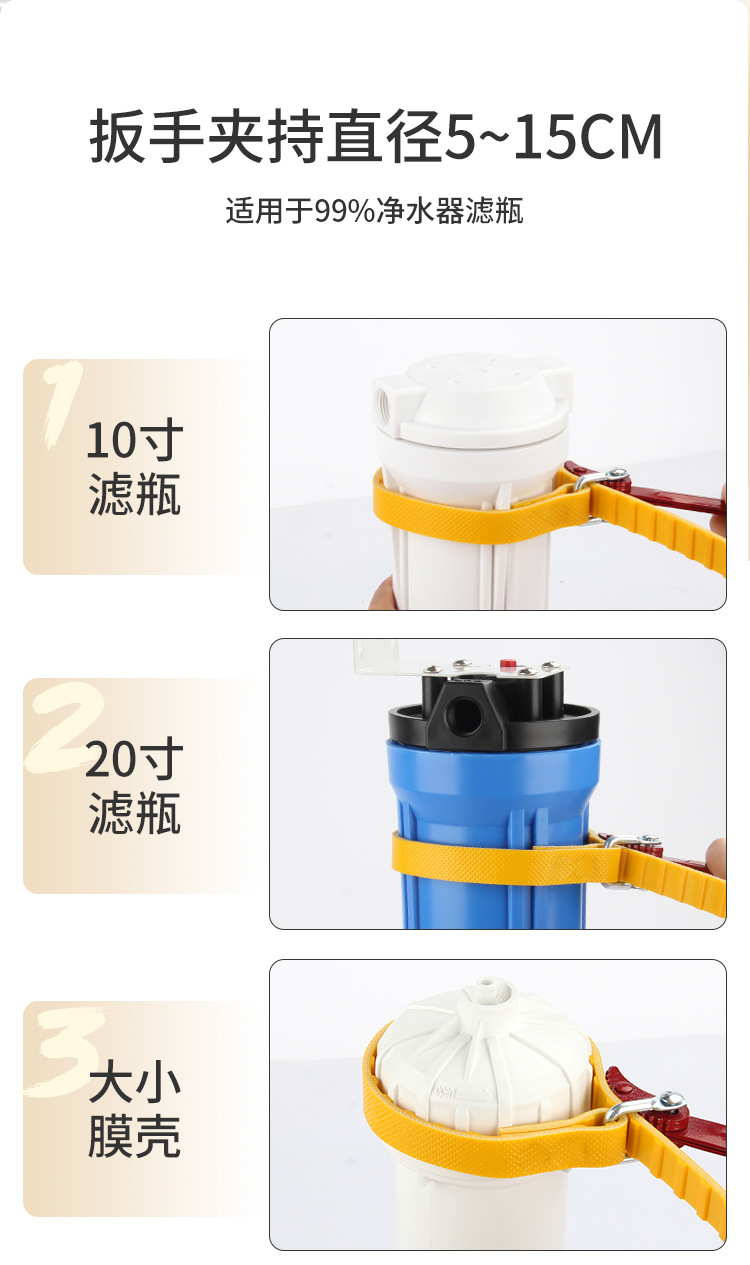 Purificador de agua universal filtro botella llave antideslizante cinturón universal llave desmontaje 10-pulgadas 20 pulgadas filtro botella membrana Shell máquina de Apple