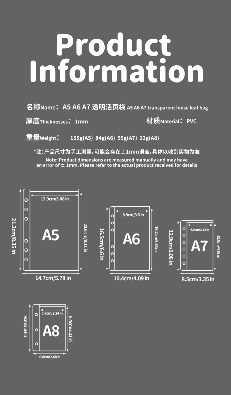 | Color | A5 bolsa de recarga transparente (fondo blanco),A6 bolsa de recarga transparente (fondo blanco),Una bolsa de recarga transparente A7 (fondo blanco) |