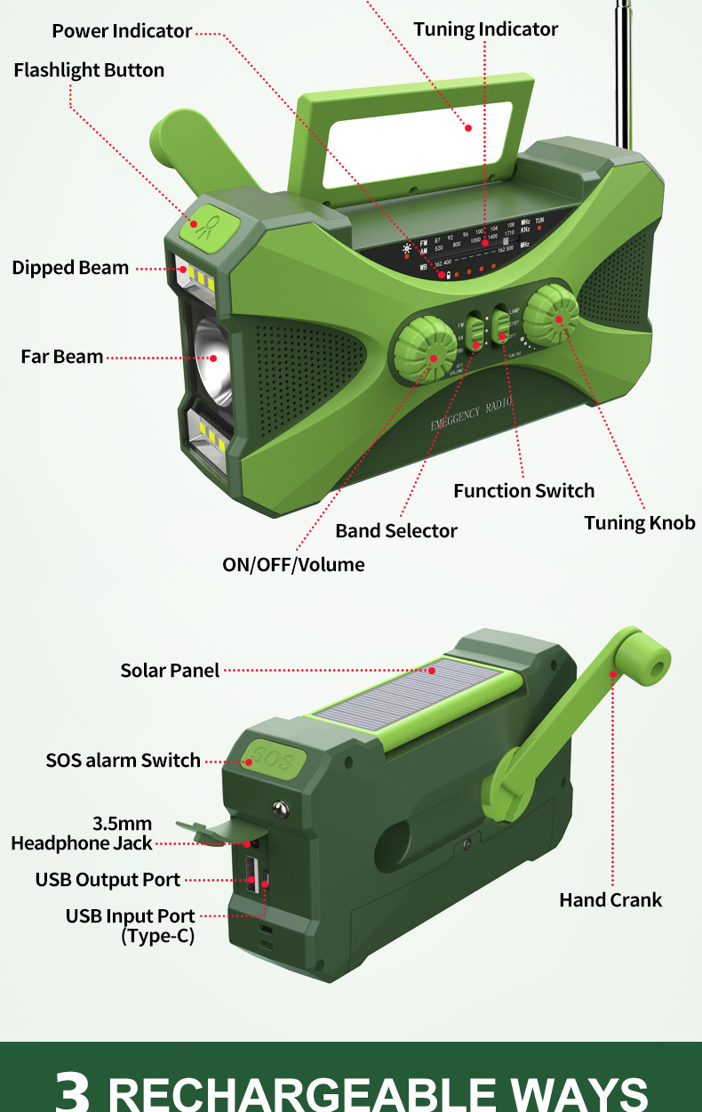 Nueva preparación para el combate transfronteriza Prevención de Desastres emergencia multifunción Radio al Aire Libre FM generación de energía solar Radio