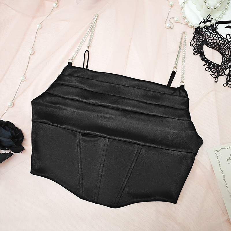 De moda de gama alta sexy cuello bajo Sling plisado máquina cuidadosa rhinestone costura cintura corta adelgazamiento Fishbone corsé para las mujeres