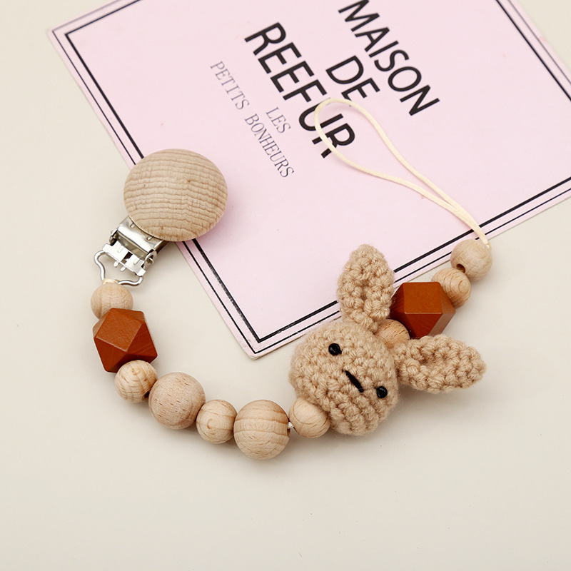 Bebé chupete cadena lindo dibujos animados conejito de lana calmante anti-gota Cadena de madera grano redondo Haya chupete clip al por mayor