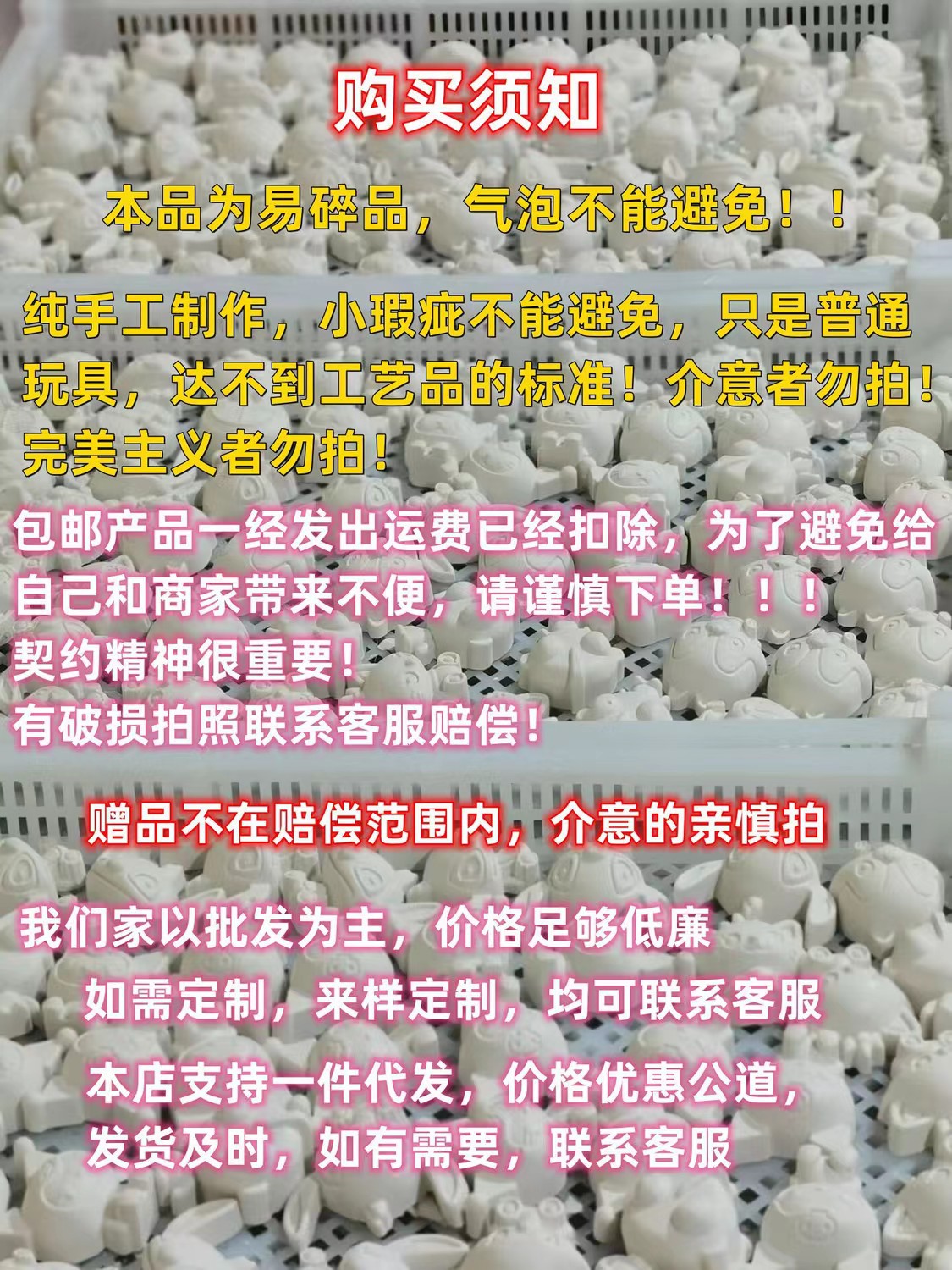 | Colores | Caja pequeña de muñecas de yeso (2 yeso por caja, 1 bolígrafo, 3 pigmentos de color),Kit de Muñeca de Yeso con Ventana Abierta (Cada kit incluye 1 figura de yeso, 1 pincel y 3 colores de pintura).,Muñeco de yeso caja ciega (1 yeso, 1 bolígrafo, 3 colores de pintura por caja),Muñeca de yeso en bolsa individual (Cada bolsa contiene 1 muñeca de yeso, 1 pincel y 3 colores de pintura). Las muñecas se envían de forma aleatoria.,Dos muñecos de yeso en bolsas (cada bolsa contiene 2 muñecos de yeso, 1 bolígrafo y 6 colores de pintura). Las muñecas se envían al azar.,Cuatro bolsas de muñecos de yeso (cada bolsa contiene 4 yesos, 1 bolígrafo y 6 colores de pintura). Los muñecos se distribuyen aleatoriamente.,Tres bolsas de muñecos de yeso (cada bolsa contiene 3 yesos, 1 bolígrafo y 6 colores de pintura). Los muñecos se distribuyen aleatoriamente. |
