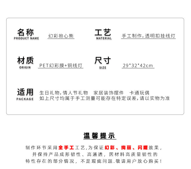 | Colores | Corazón rosa abrazo oso,Oso de corazón rojo,Unicornio,Conejito,Osito de fantasía |