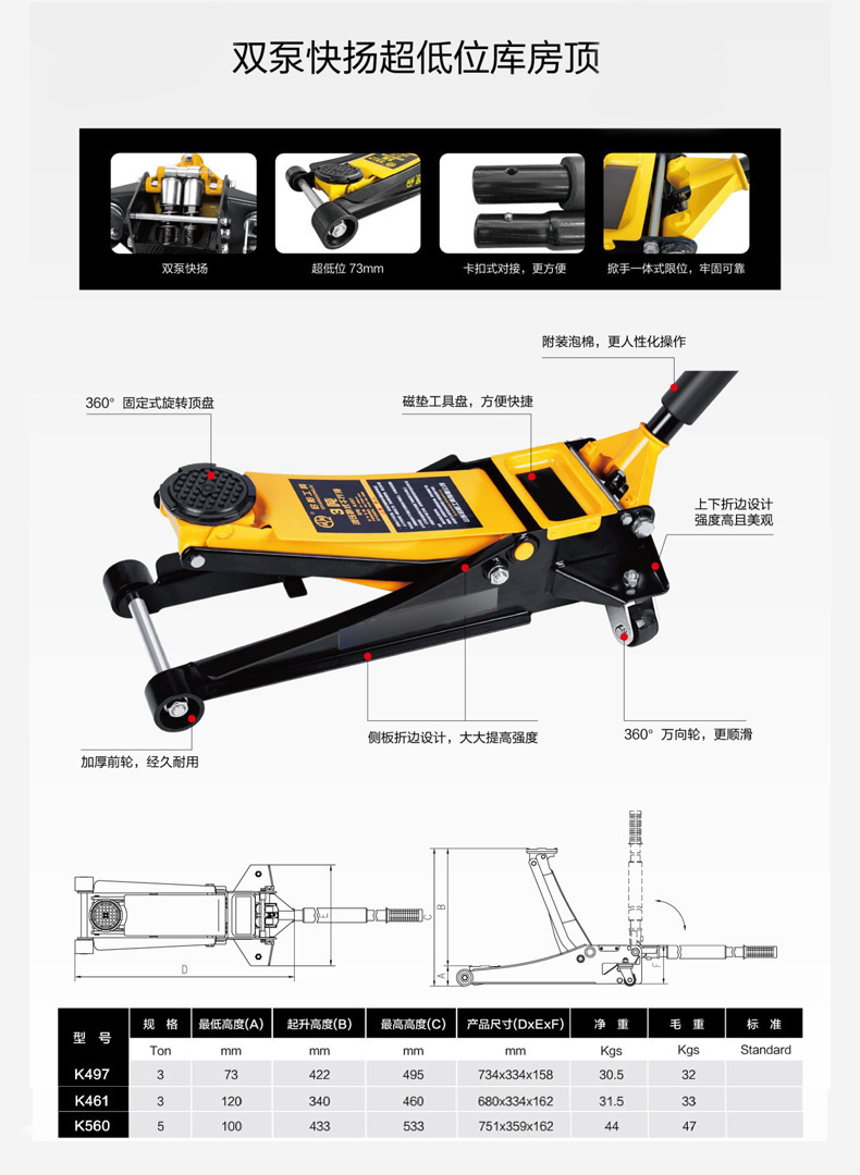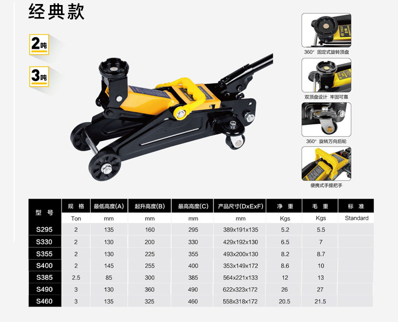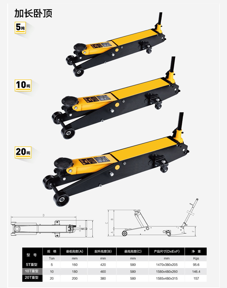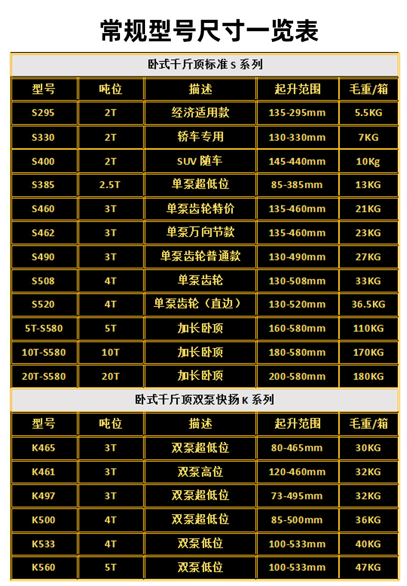 | Modelo | 2T-295 asequible (rango de elevación 135-295mm),Para automóviles 2T-330 (rango de elevación 130-330mm),2T-400SUV con vehículo (rango de elevación 145-400mm),2.5T-385 de una sola bomba de posición ultra baja (rango de elevación 85-385mm),Precio especial de engranaje de bomba única 3T-460 (rango de elevación 135-460mm),3T-462 junta universal de una sola bomba (rango de elevación 135-460mm),3T-490 engranaje de una sola bomba ordinario (rango de elevación 130-490mm),4T-508 (engranaje de bomba única) (rango de elevación 130-508mm),4T-520 (engranaje de bomba simple con borde recto) (rango de elevación 130-520mm),5T-580 alargamiento de la parte superior de la cama (rango de elevación 160-580mm),10T-580 alargamiento de la parte superior de la cama (rango de elevación 180-580mm),3T-461 bomba doble alta (rango de elevación 120-460mm),3T-465 baja de doble bomba (rango de elevación 80-465),3T doble bomba de posición ultra baja (rango de elevación 73-495mm),4T-500 doble bomba de posición ultra baja (rango de elevación 73-495mm),4T-533 doble bomba baja (rango de elevación 100-533mm),5T-560 bomba doble baja (altura máxima de elevación 533),5T brazo de elevación más largo (160-580mm) |
