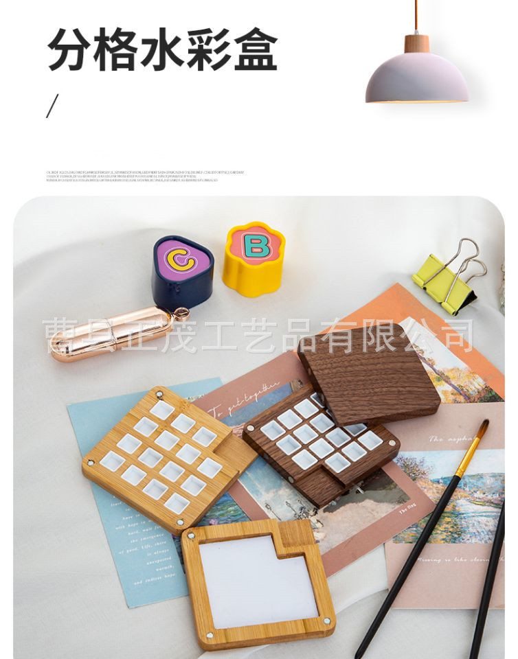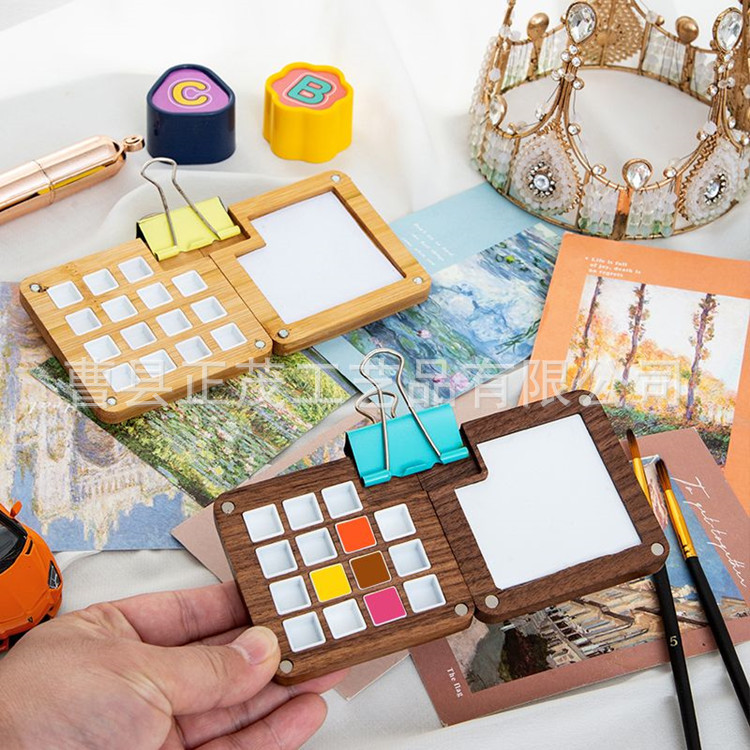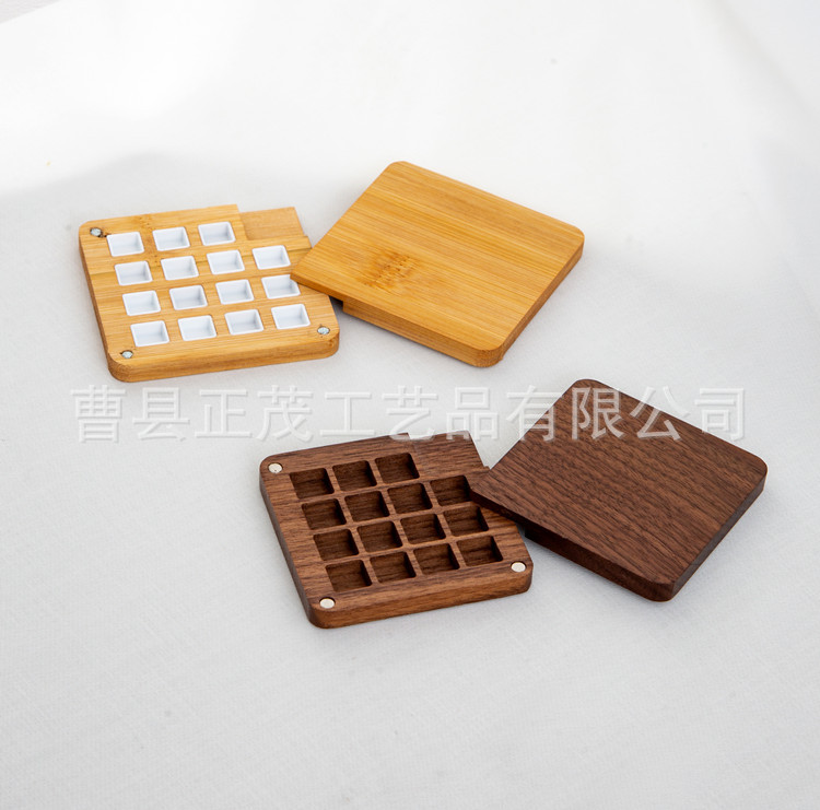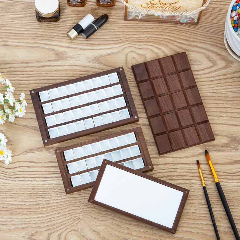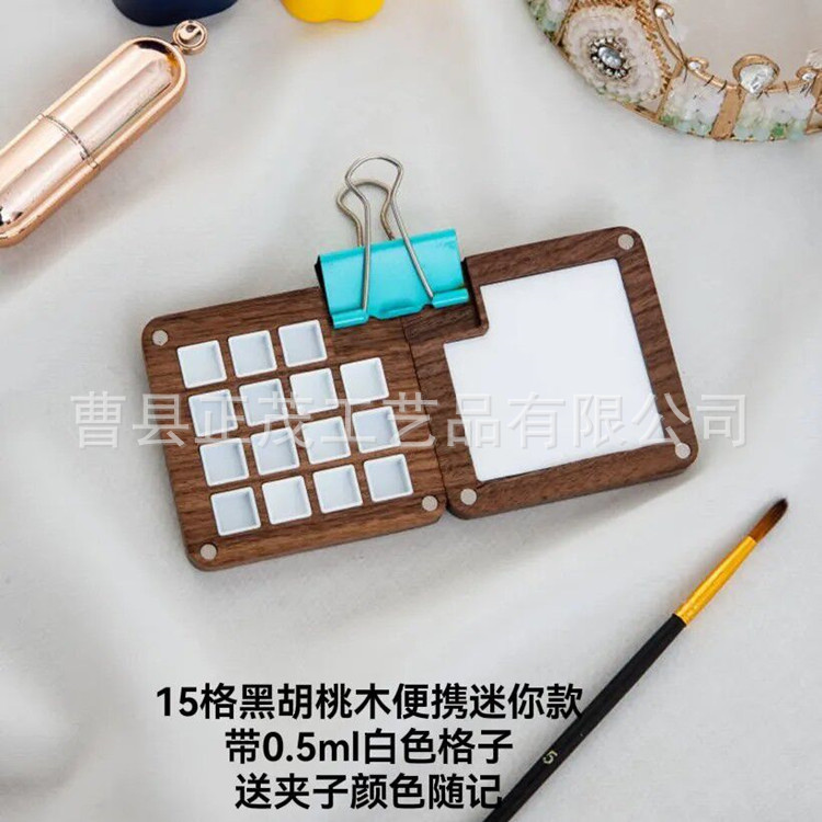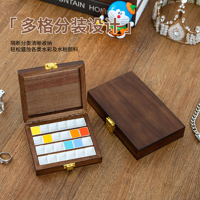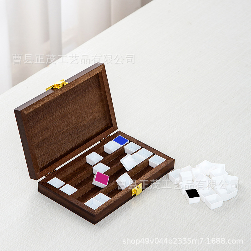 Goma pintado de nuez estilo ins hecho a mano para niños, caja de subensamblaje de pintura sólida, caja de madera portátil, caja de paleta de acuarela de 15 compartimentos