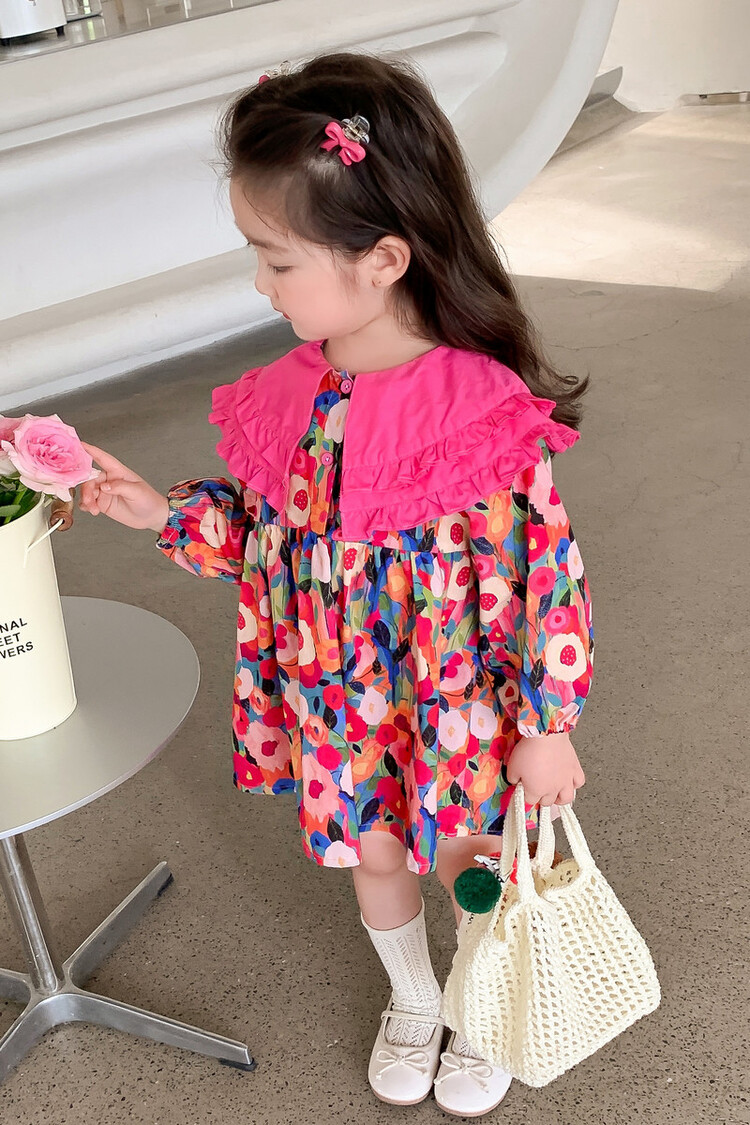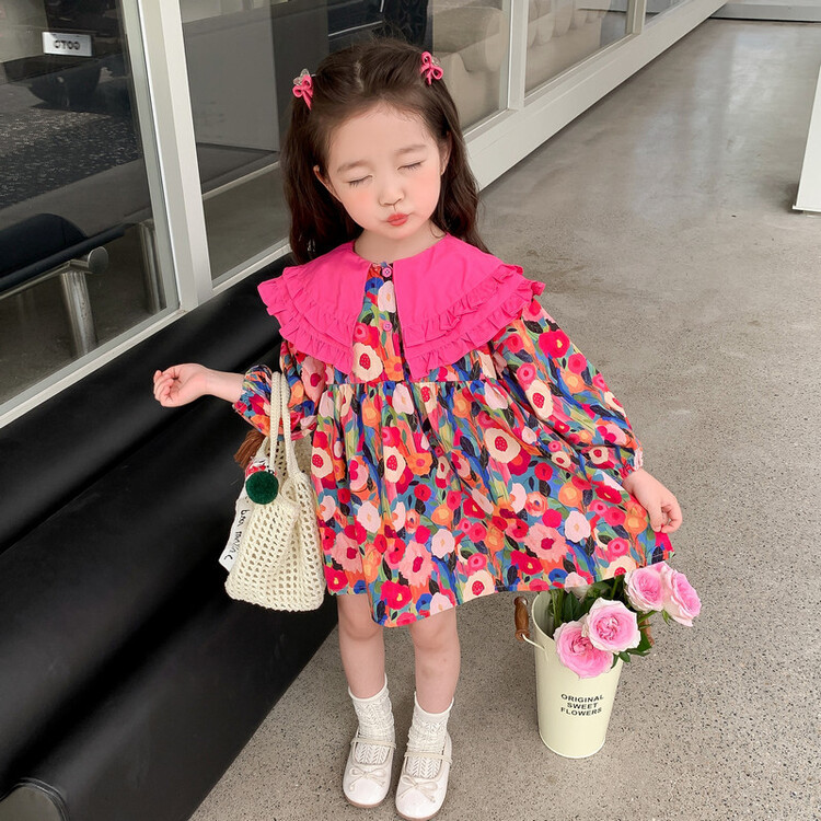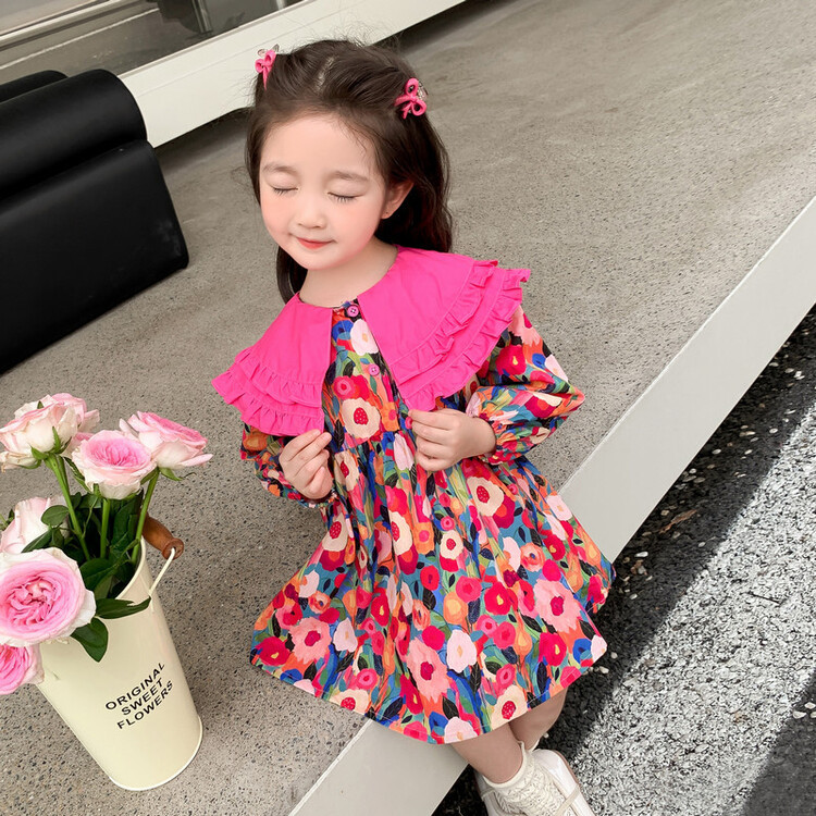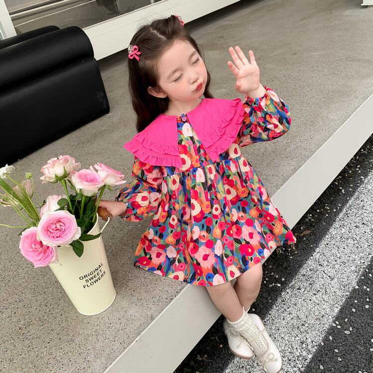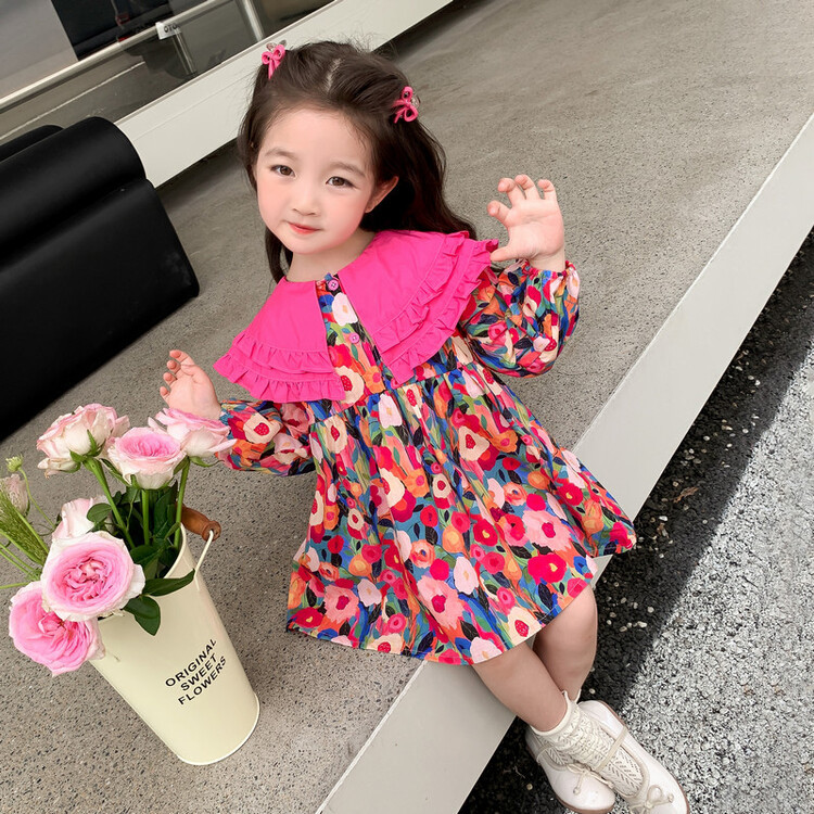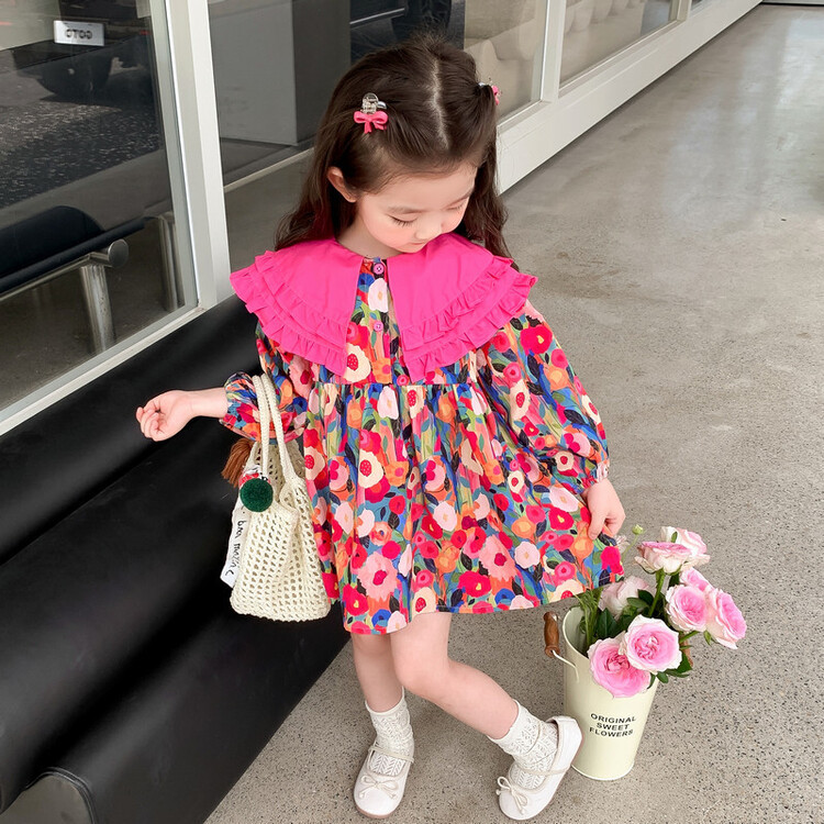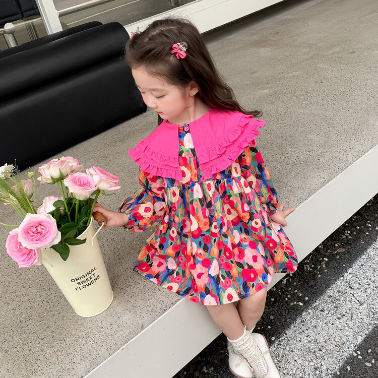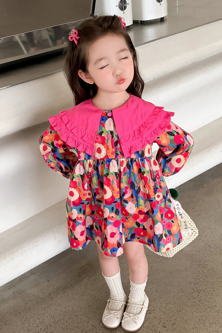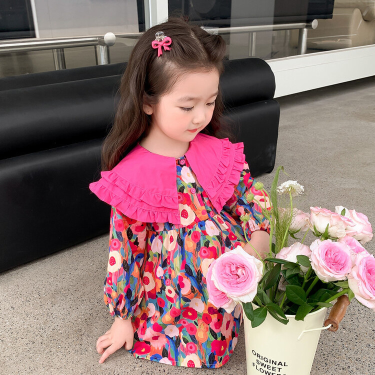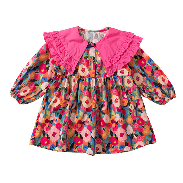 Las niñas de dopamina primavera y otoño vestido floral pitaya falda floral de solapa grande falda floral de estilo occidental de moda