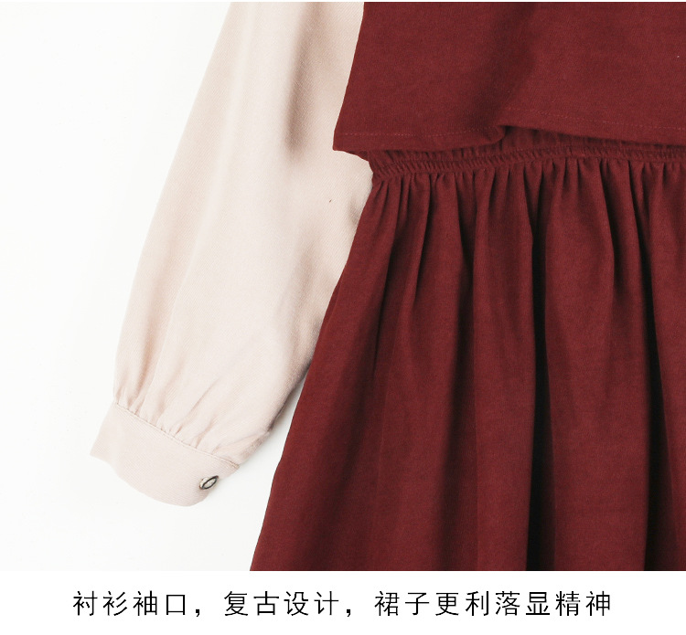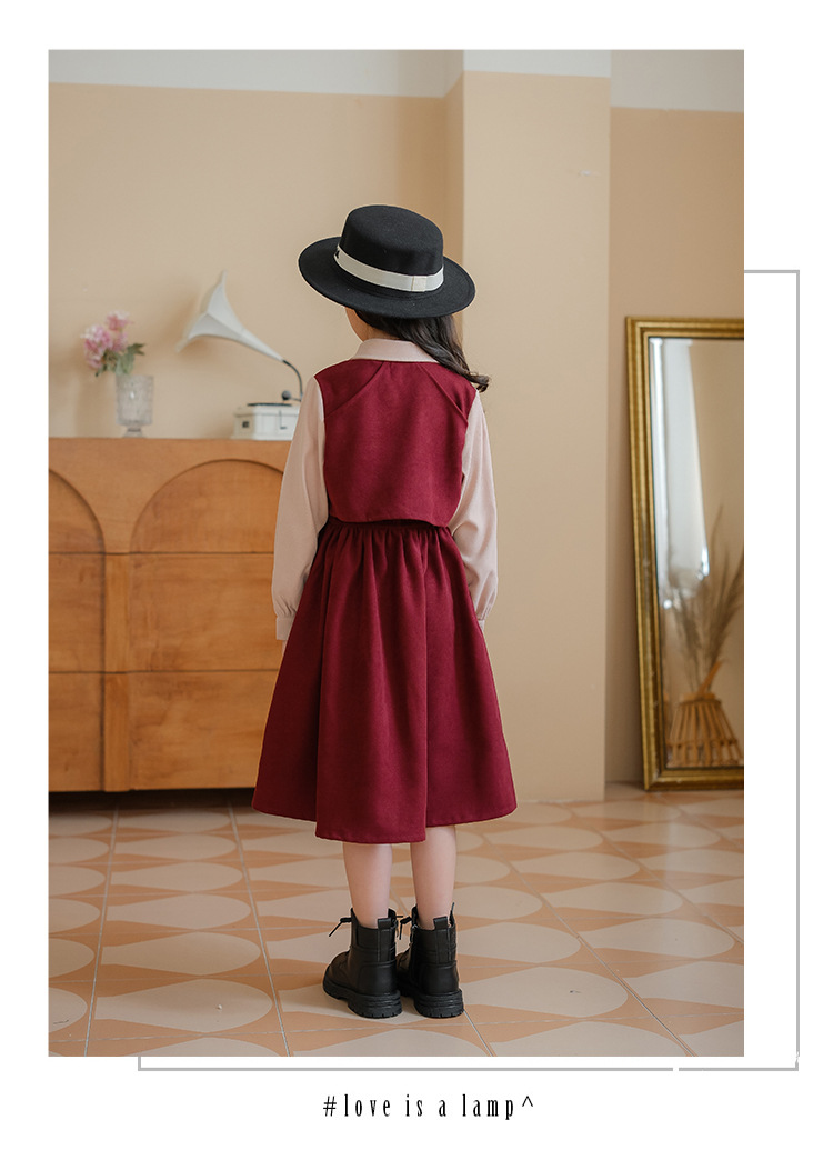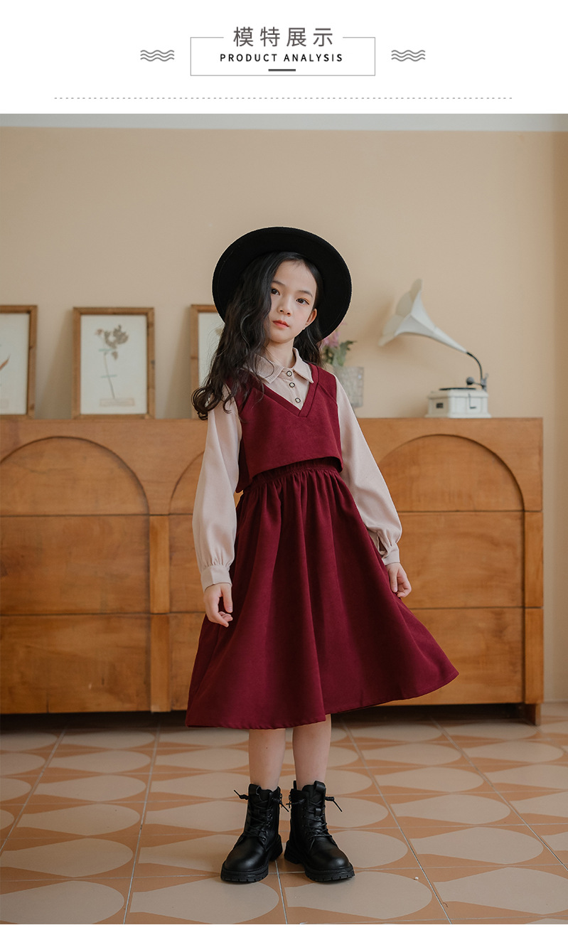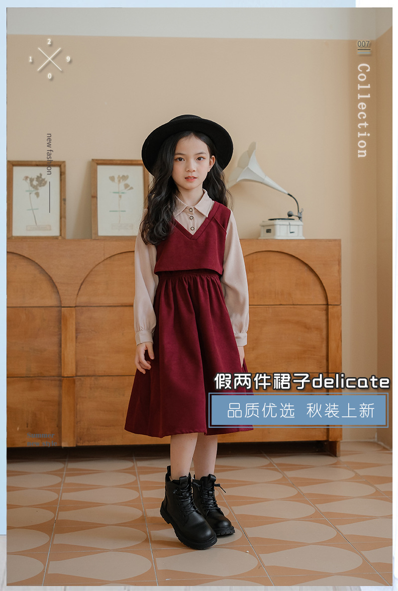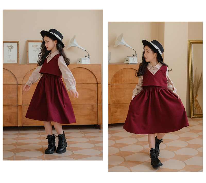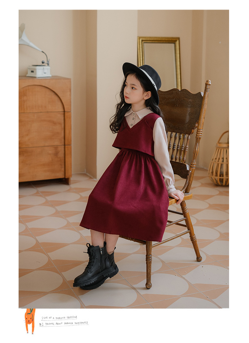 2024 niñas solapa moda falso vestido de dos piezas niños medianos y grandes rojo Otoño e Invierno vestido de princesa de pana vestido de padre e hijo