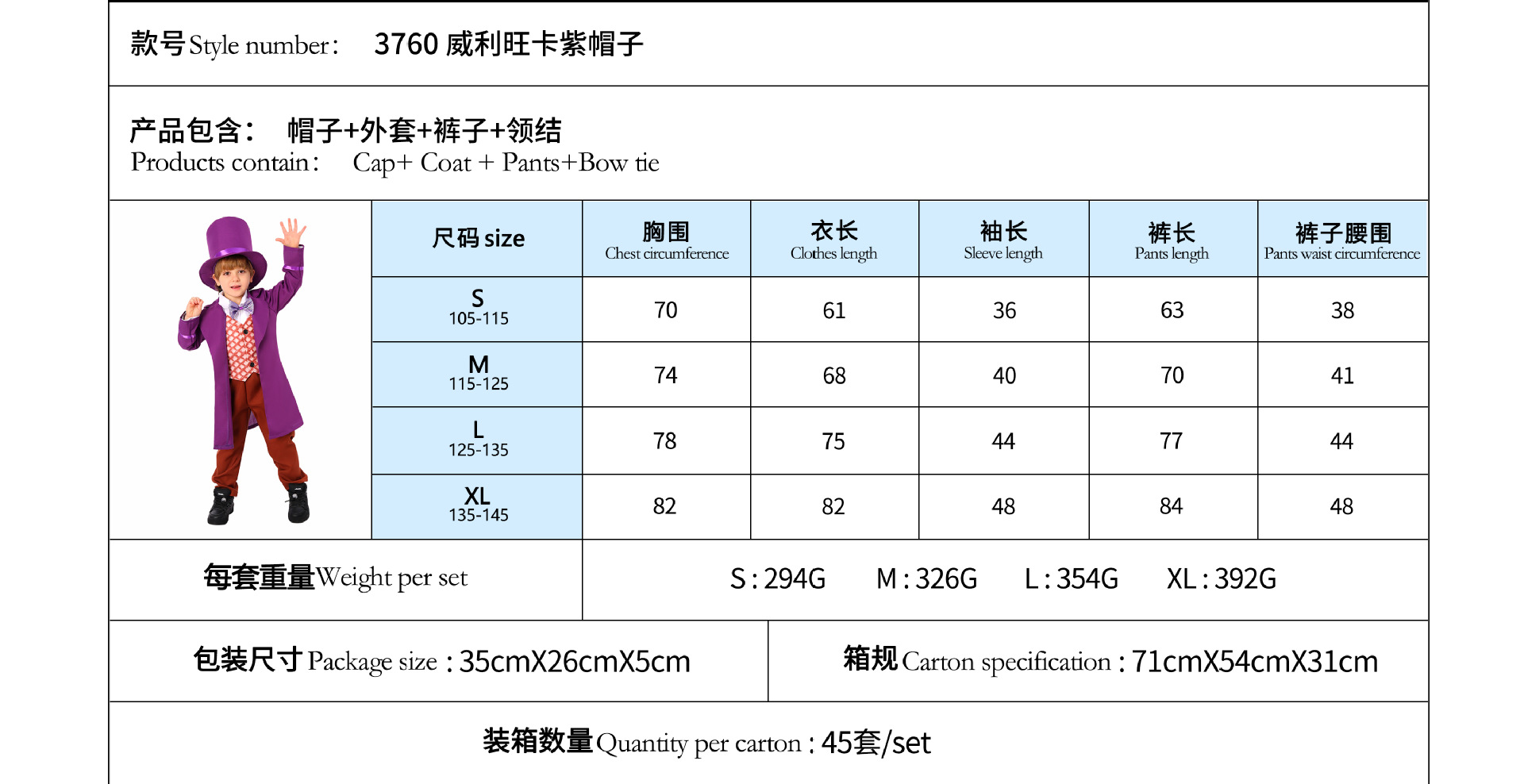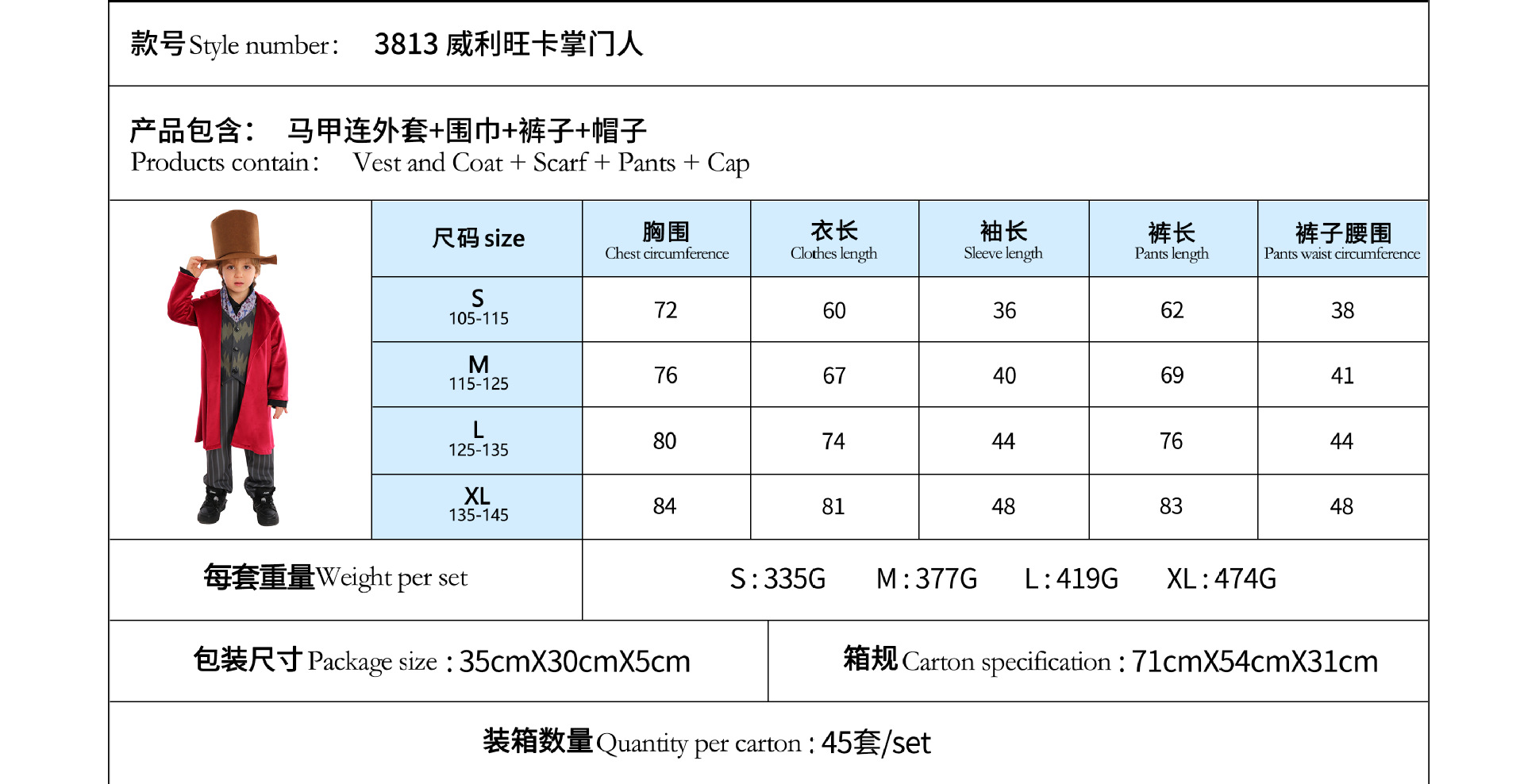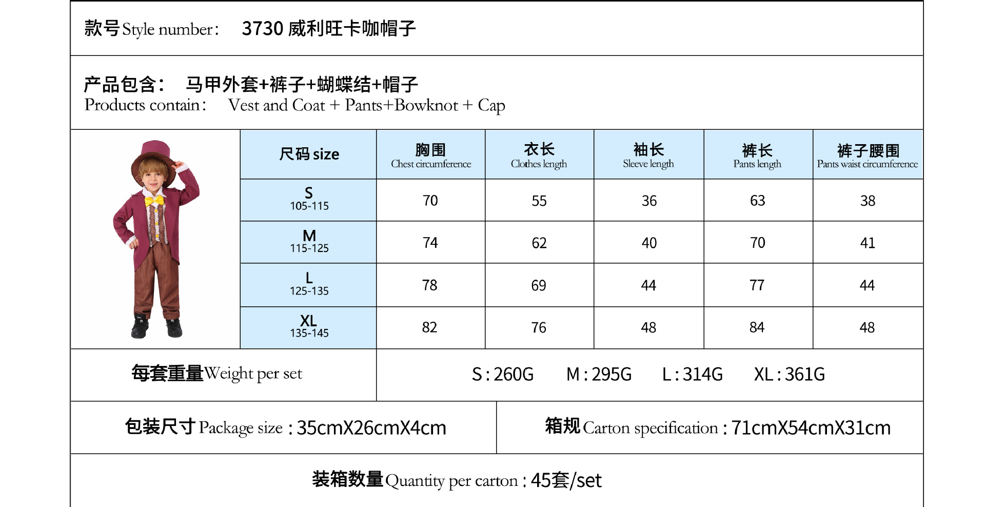 Traje de Halloween para niños Una pieza de reparto Charlie Chocolate Factory Willewanka cos Traje de actuación