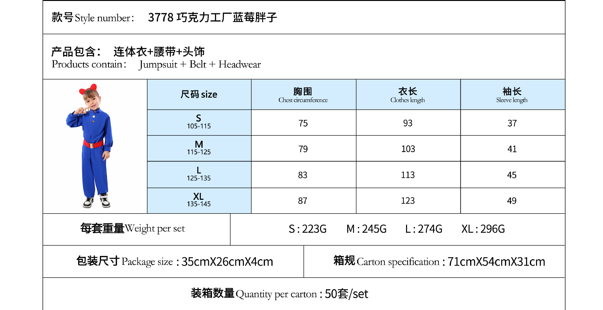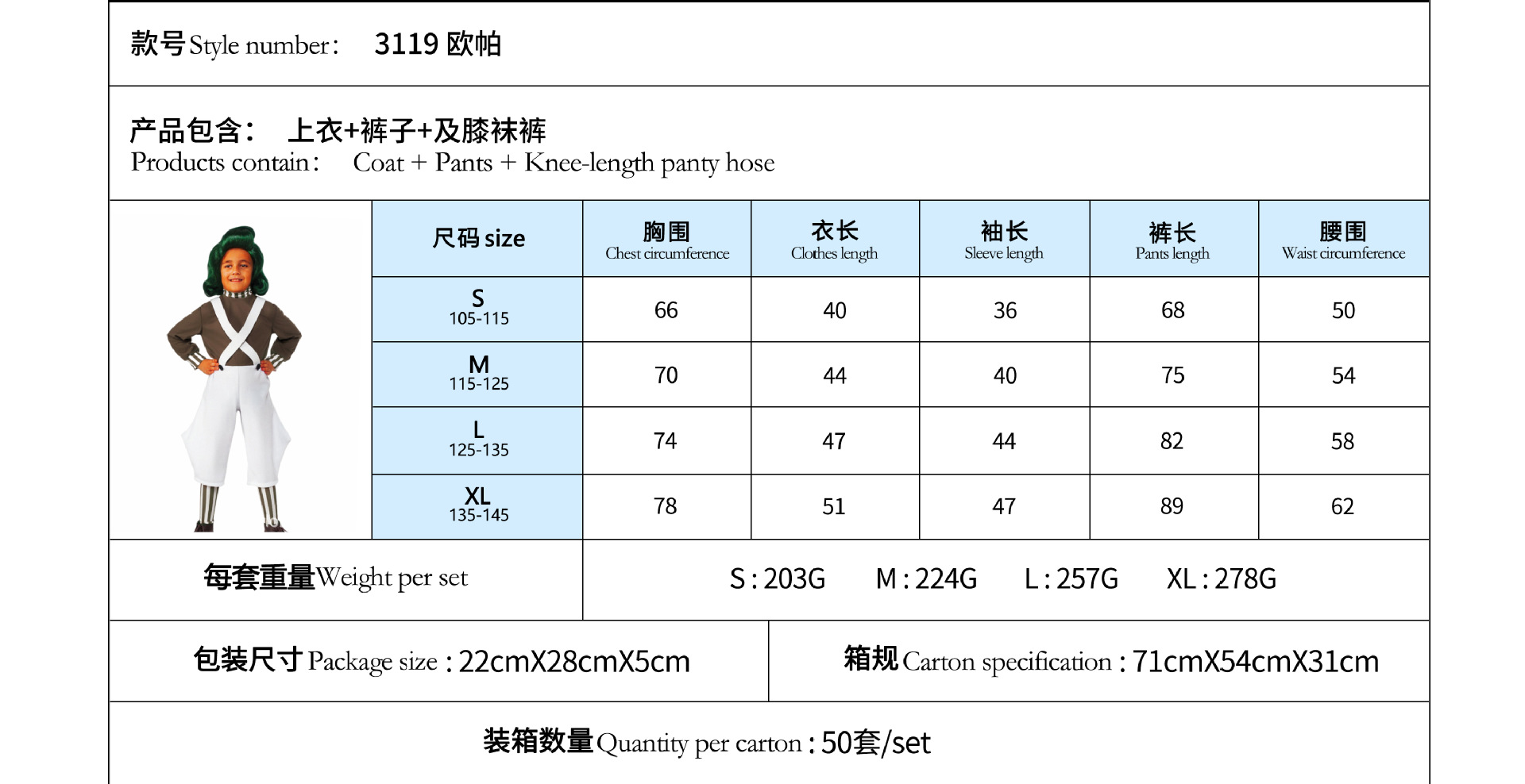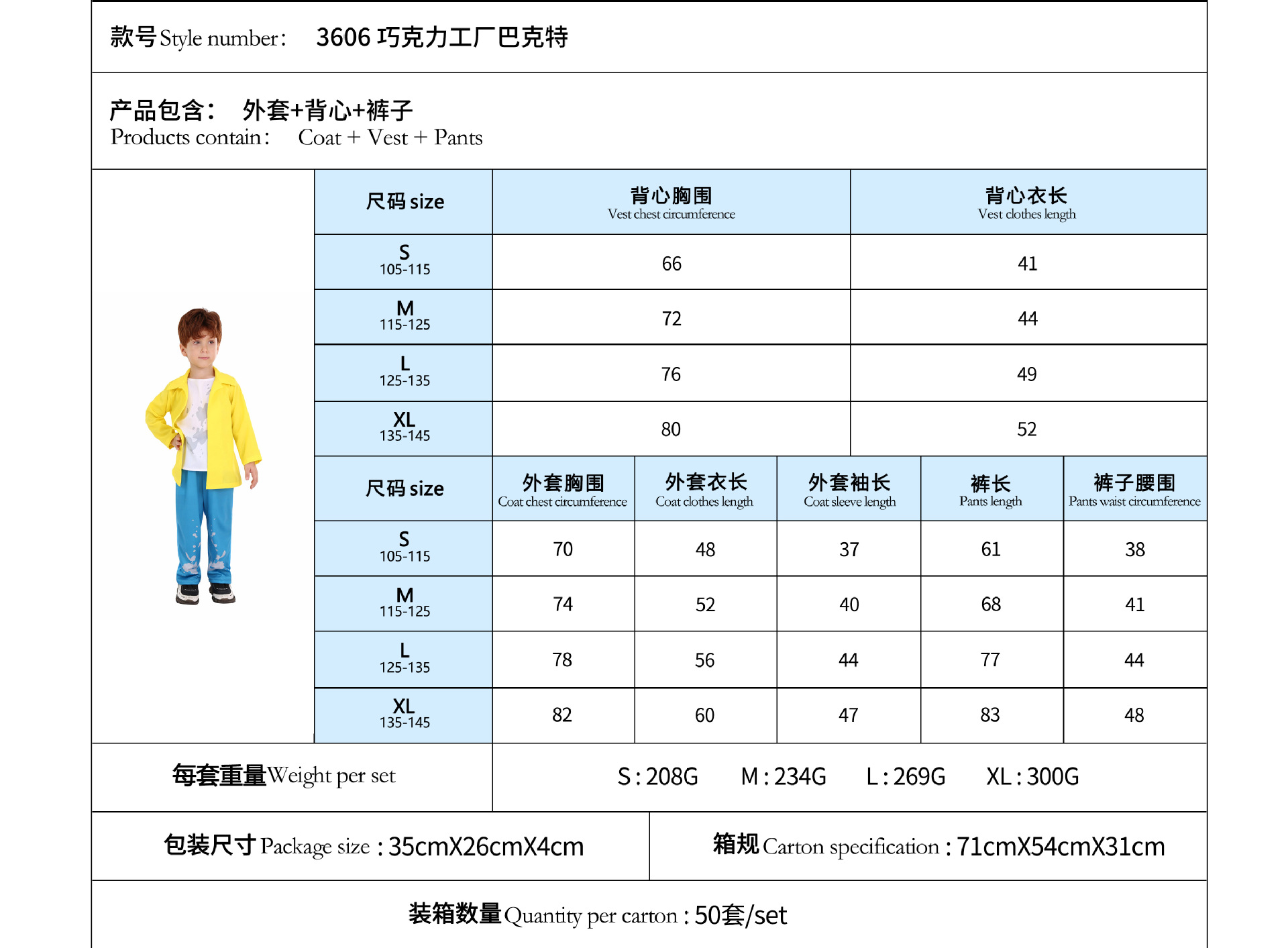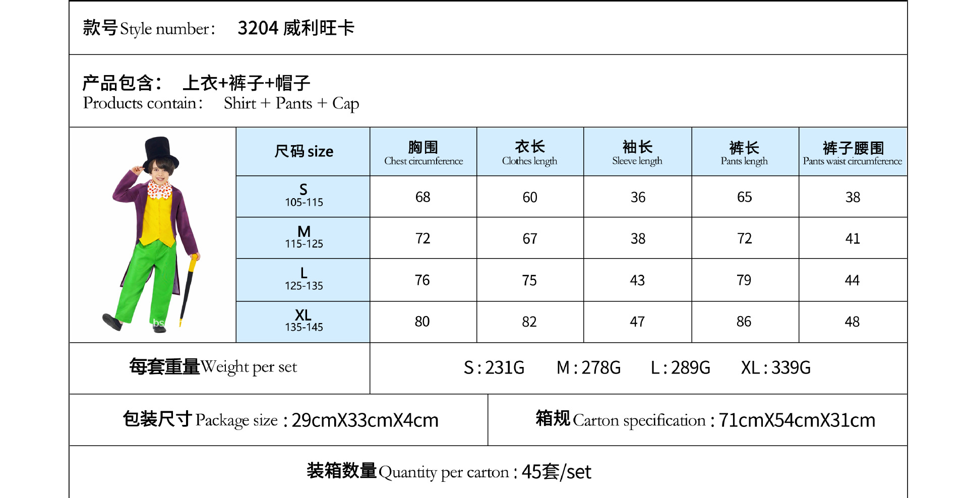 Traje de Halloween para niños Una pieza de reparto Charlie Chocolate Factory Willewanka cos Traje de actuación
