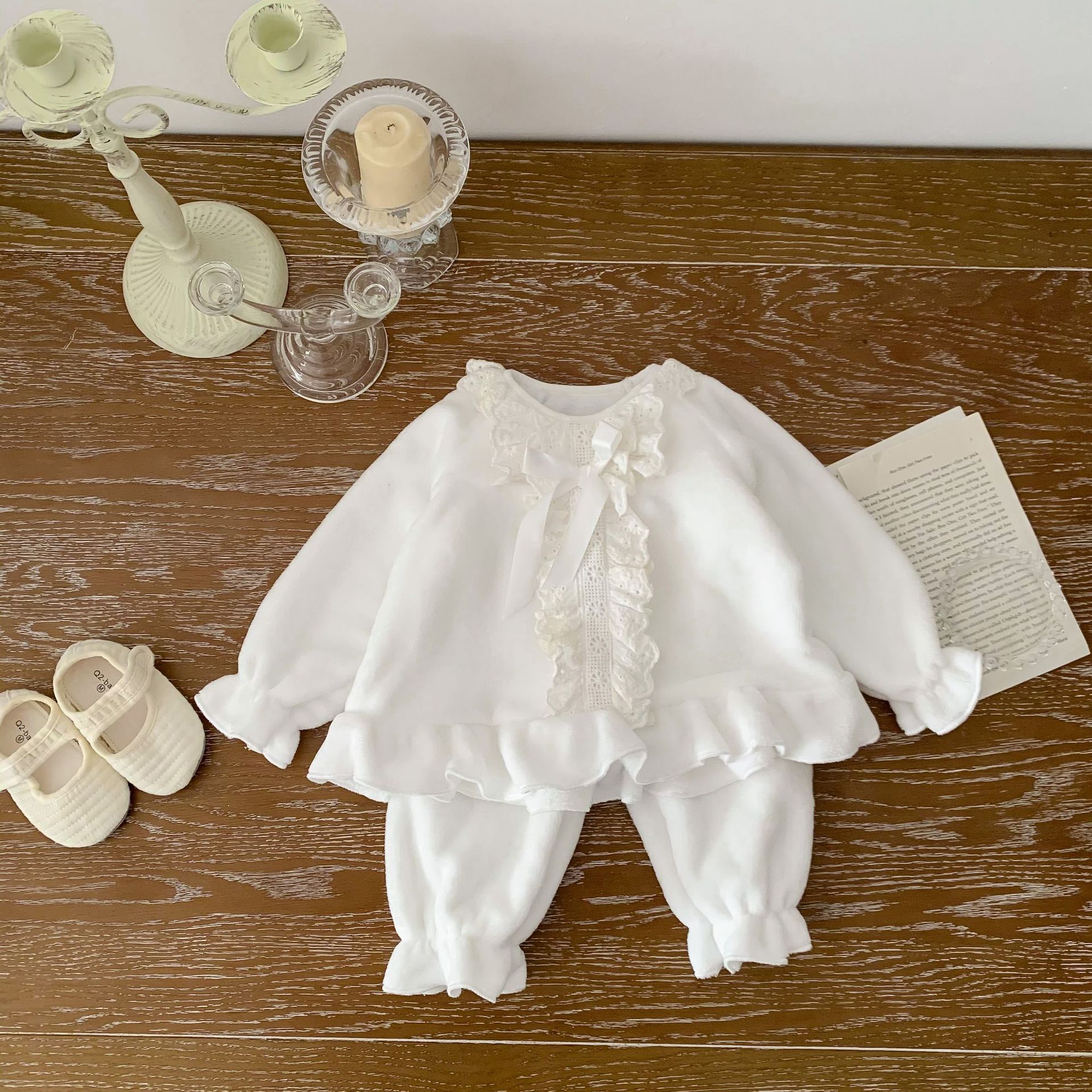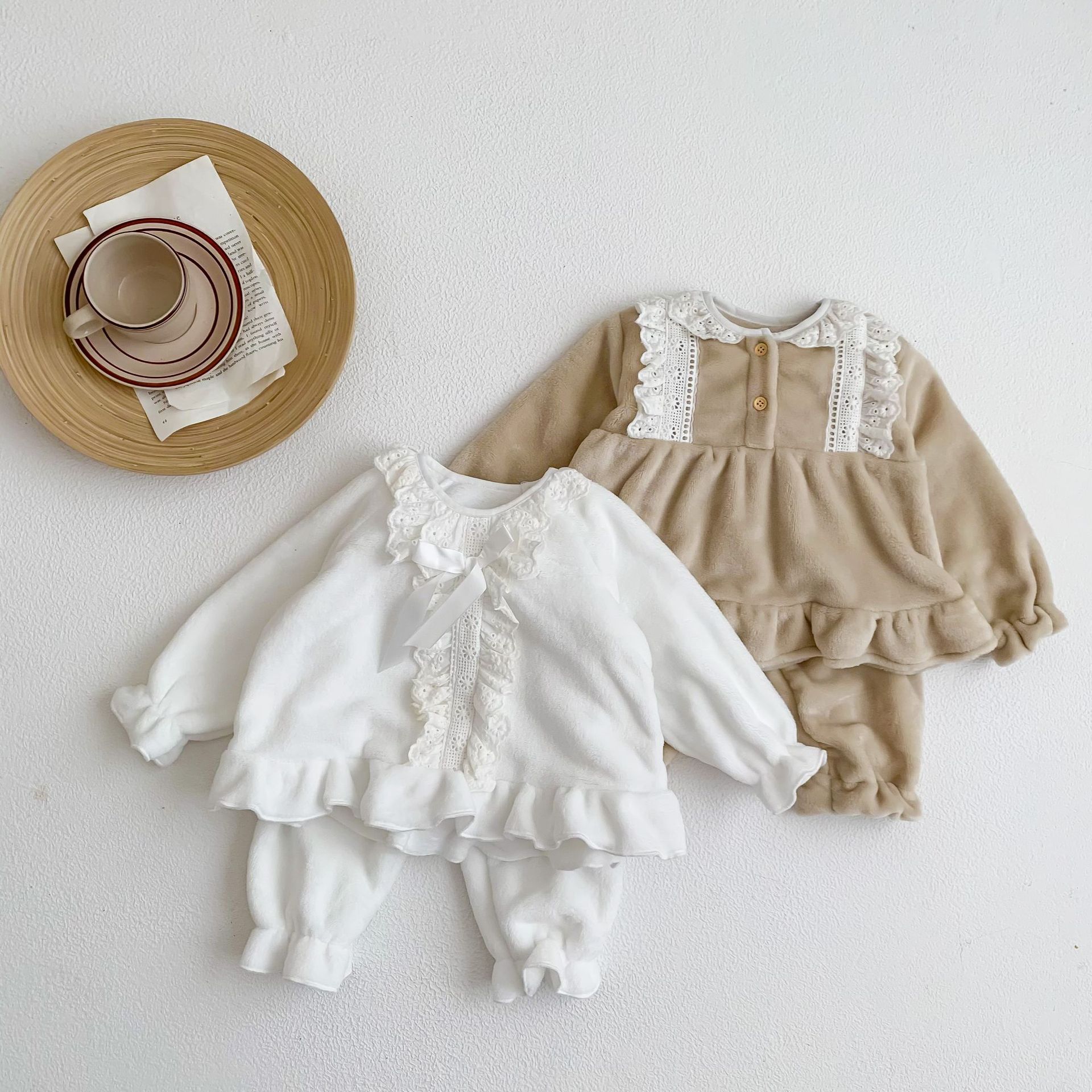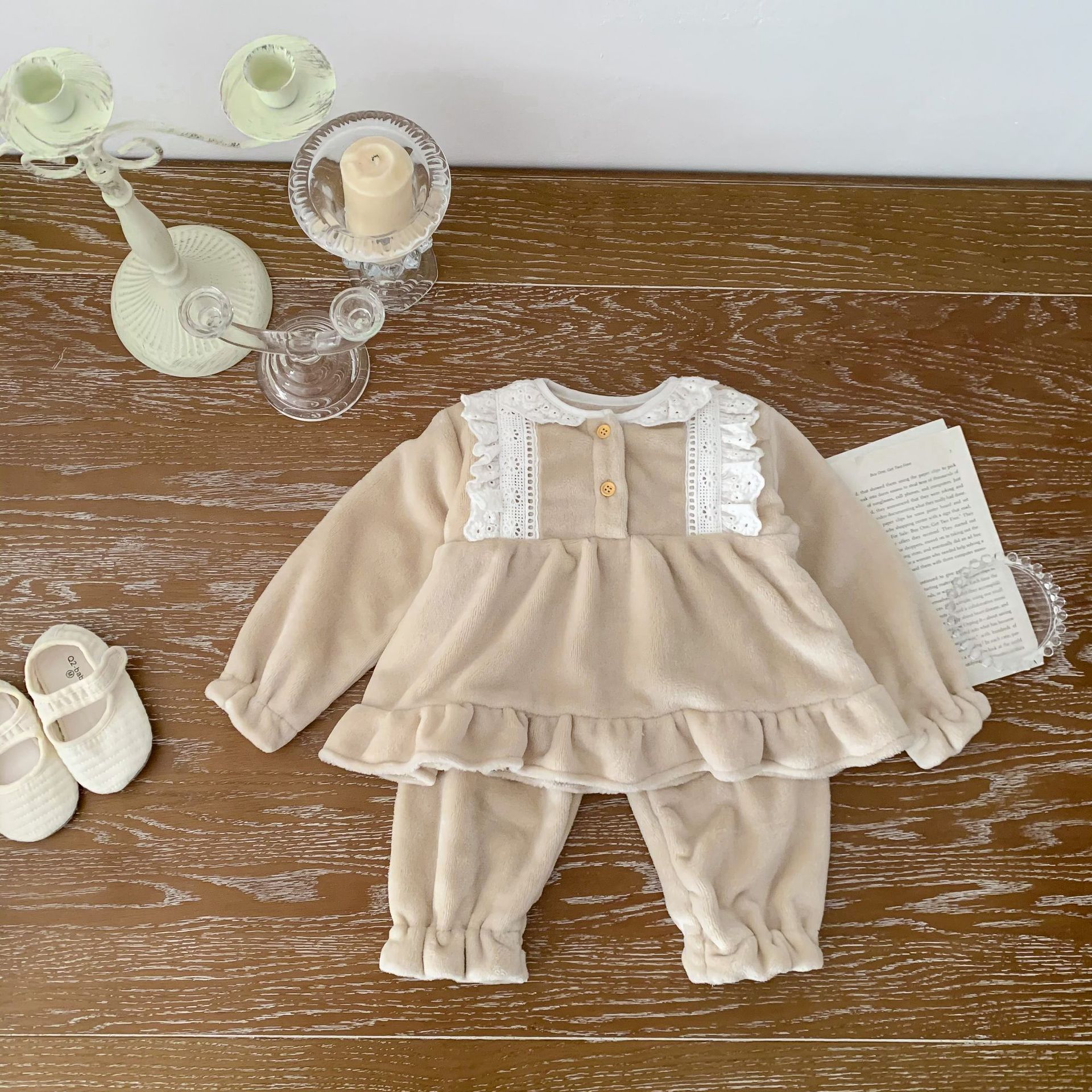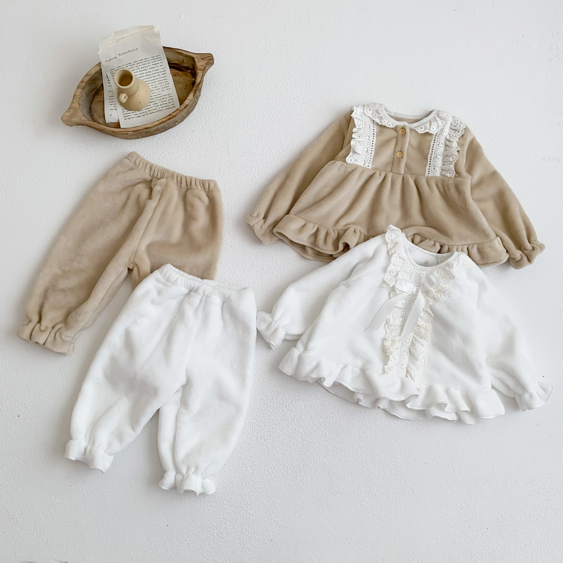 Corea del Sur ins Otoño e Invierno lindo encaje franela bebé niña pijamas infantil princesa desgaste del hogar de dos piezas de espesor