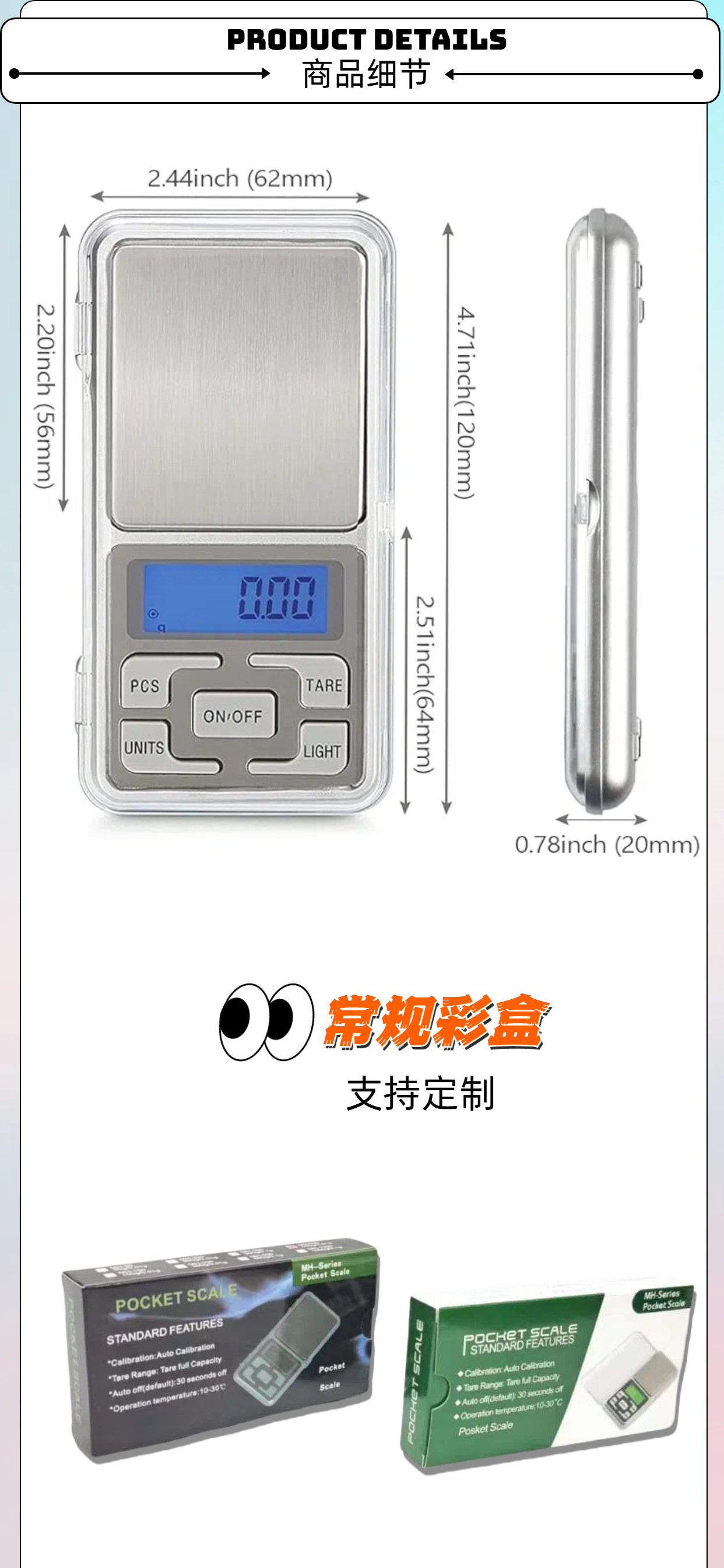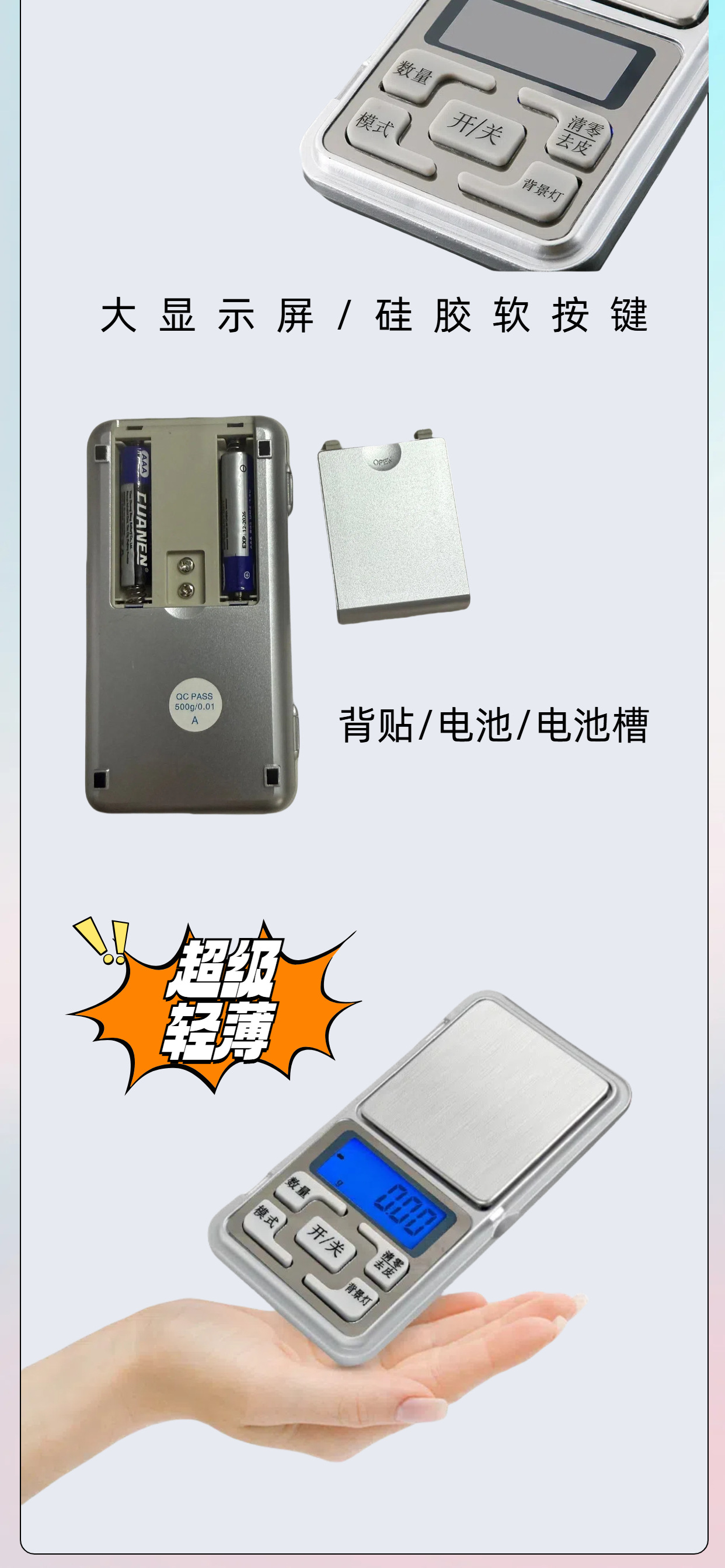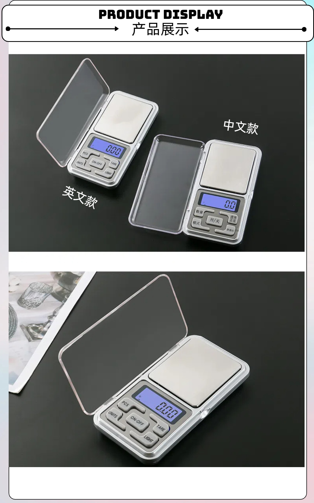 | Colores | Botón suave chino 100g/0.01g,Botón suave chino 200g/0.01g,Botón suave chino 300g/0.01,Botón suave chino 500g/0.01g,Botón suave chino 500g/0.1,Botones suaves en inglés 100g/0.01g,Botón suave Inglés 200g/0.01g,Botón suave Inglés 300g/0.01g,Teclas suaves en inglés 500g/0.01g,Botones suaves en inglés 500g/0.1g |
