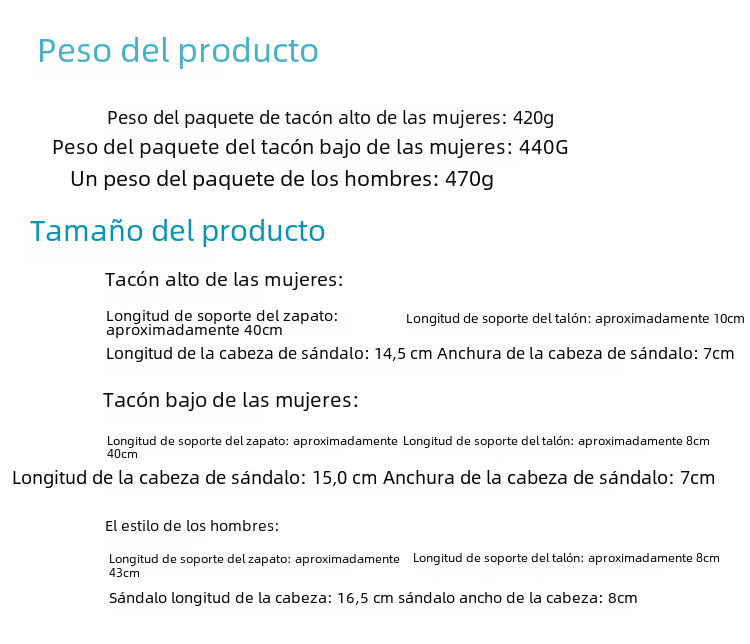| Color | Altura de soporte de los hombres adecuada para el tamaño 37-44,Los zapatos de tacón bajo de las mujeres apoyan alto adecuado para el tamaño 34-42,Los zapatos de tacón alto de las mujeres apoyan alto conveniente para el tamaño 34-41,Otros colores pueden ser personalizados por el fabricante. |