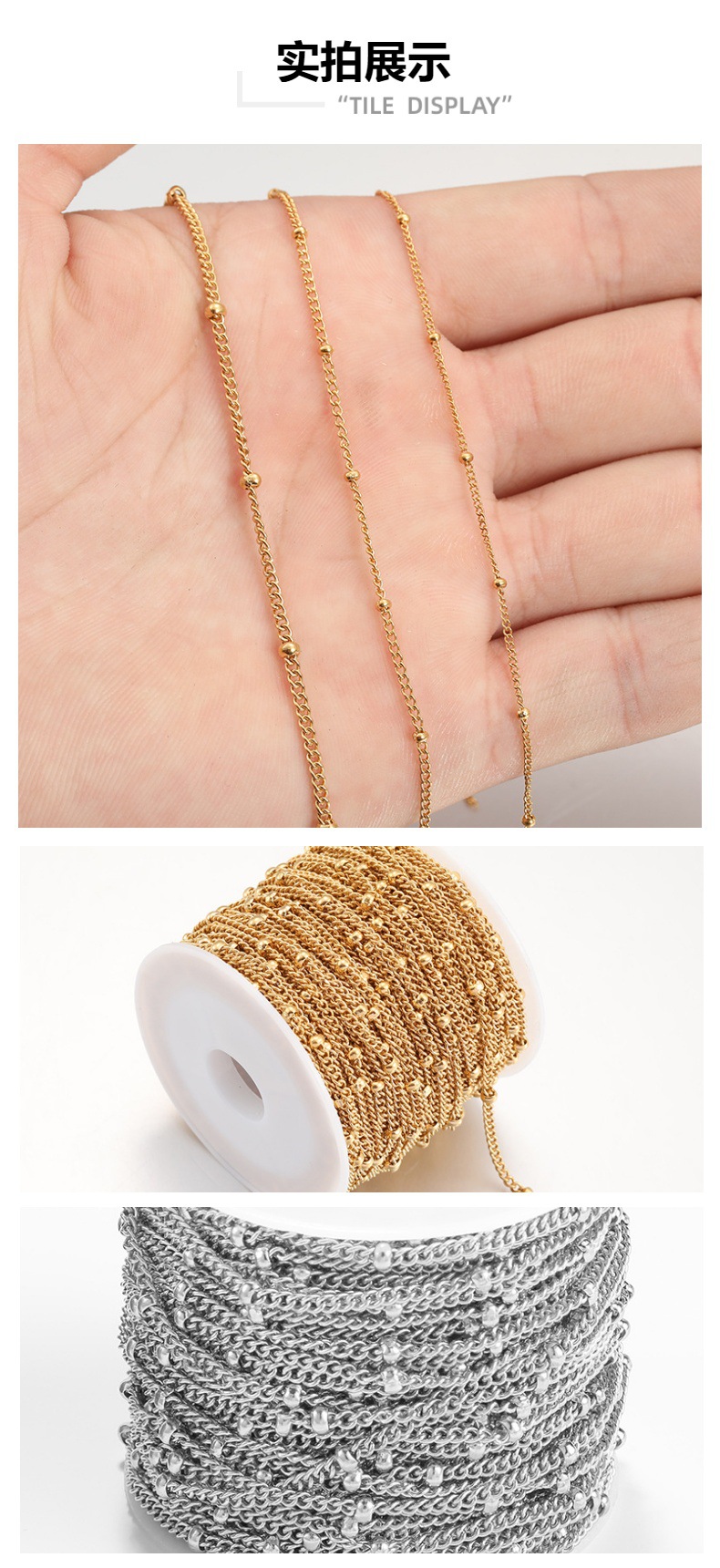 Color-preservación vacío galvanoplastia 18K oro Acero inoxidable clip lateral Cadena de cuentas espaciador grano cadena DIY Cadena de joyería al por mayor