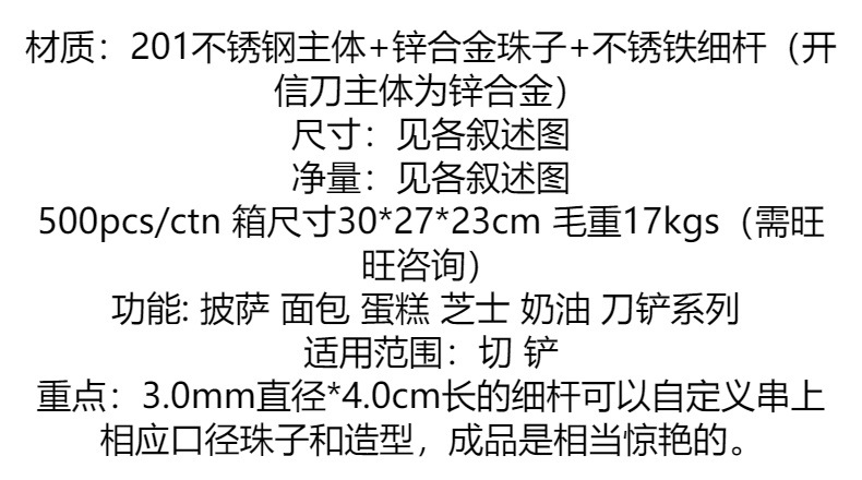 Pala de pizza con cuentas, cuchillo de pan, cuchillo de crema de mantequilla, cimitarra de queso de acero inoxidable, cuchillo de mesa, bricolaje con dientes, nueva vajilla