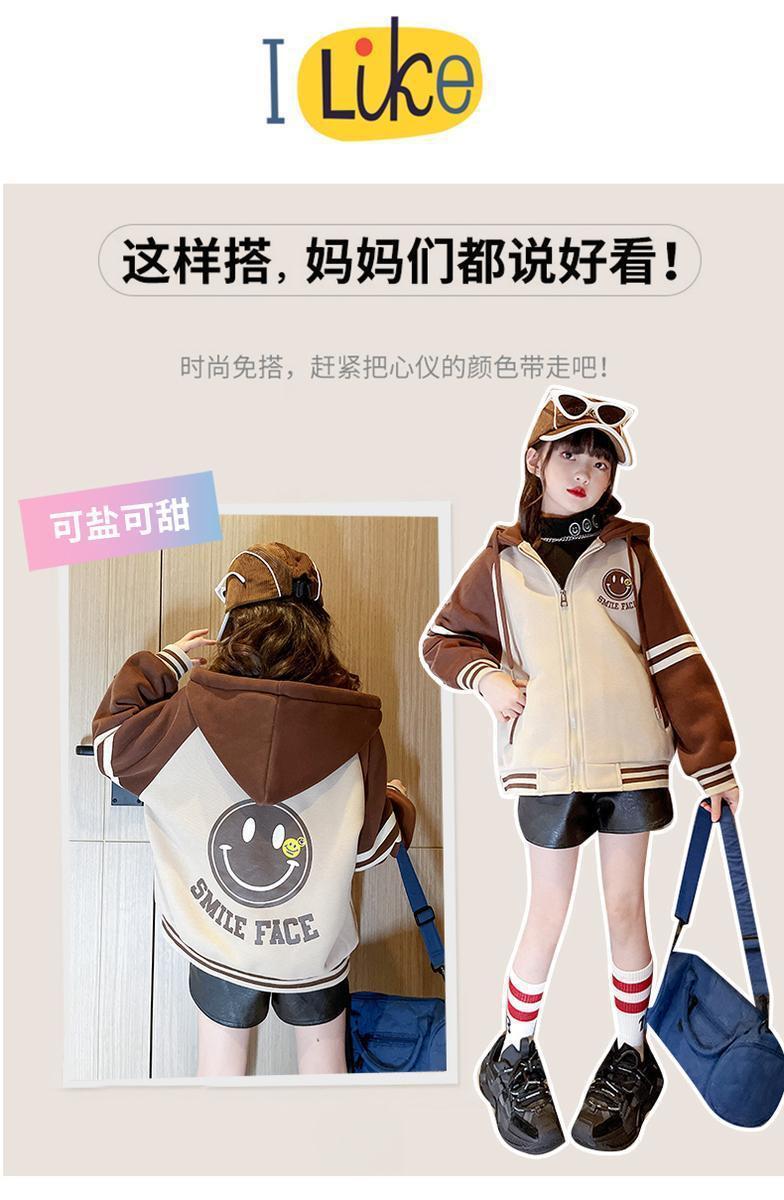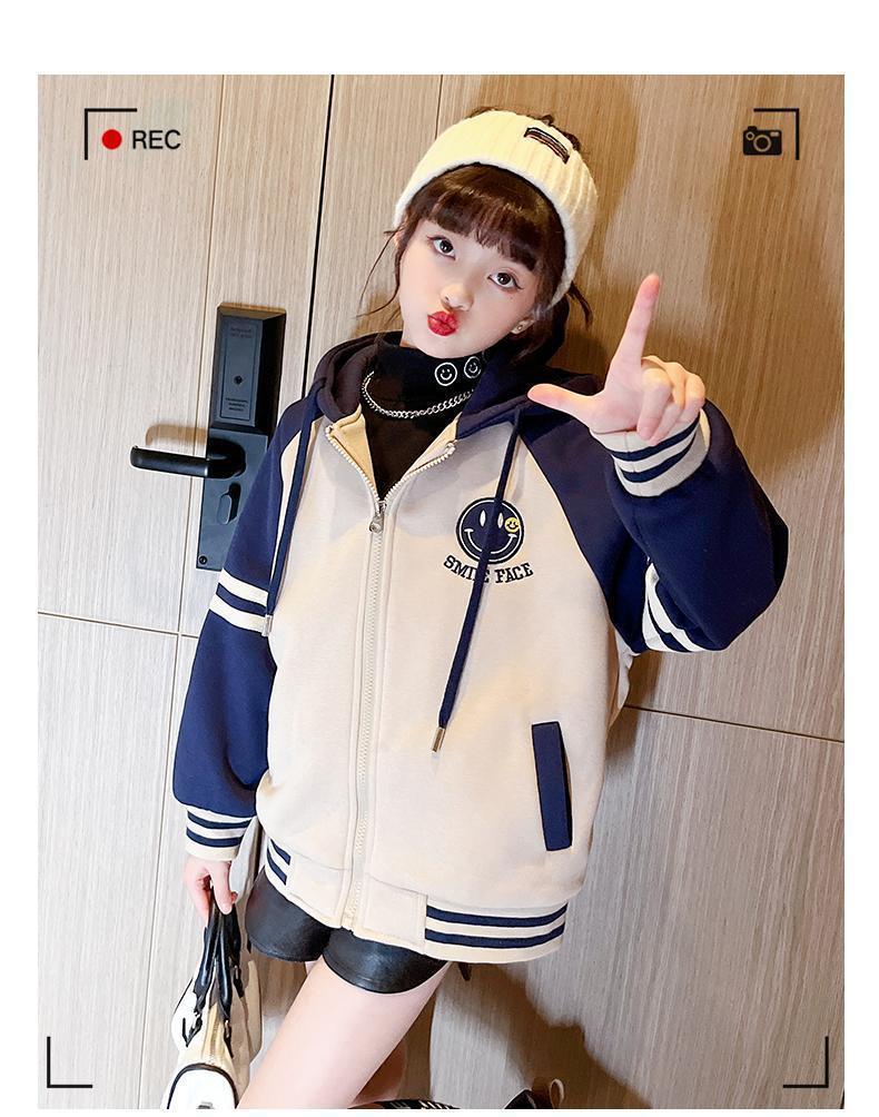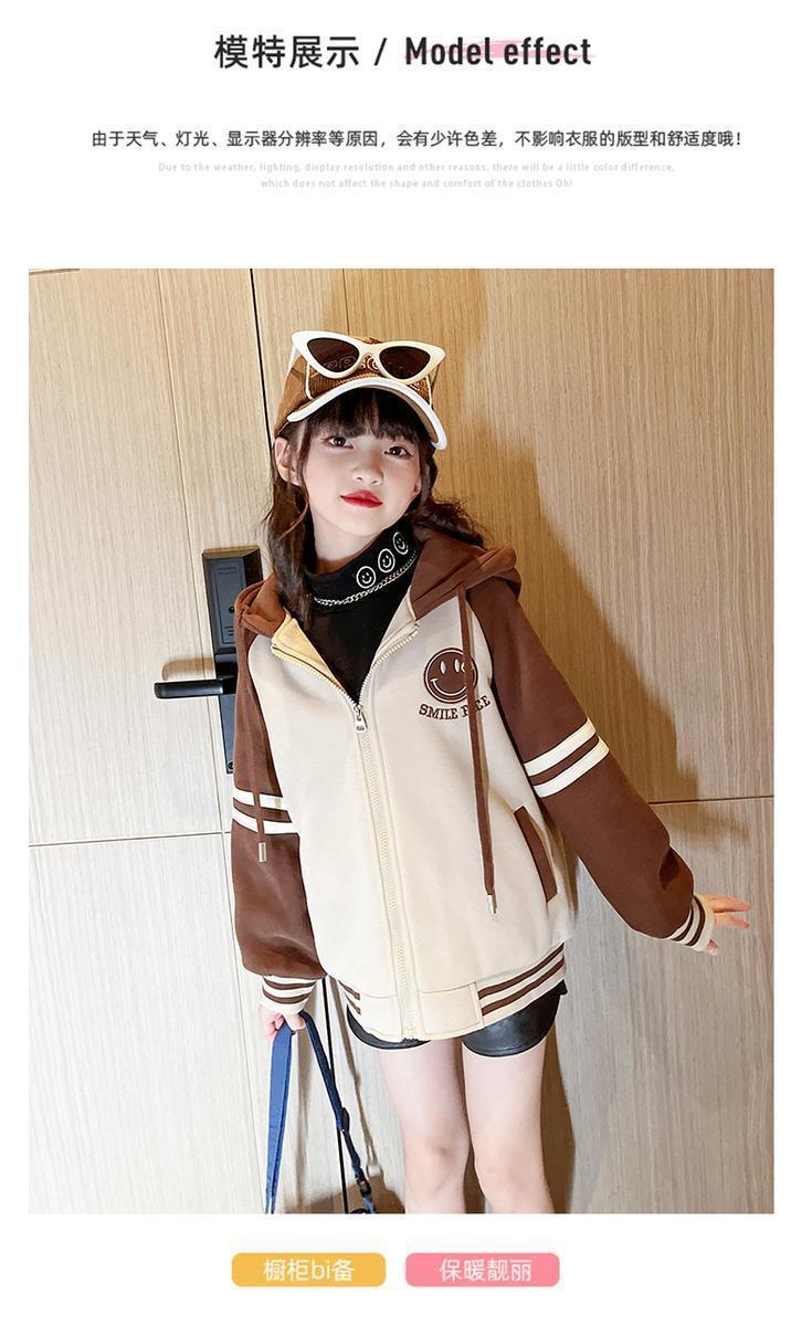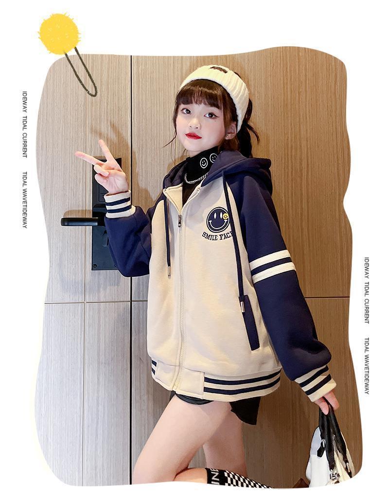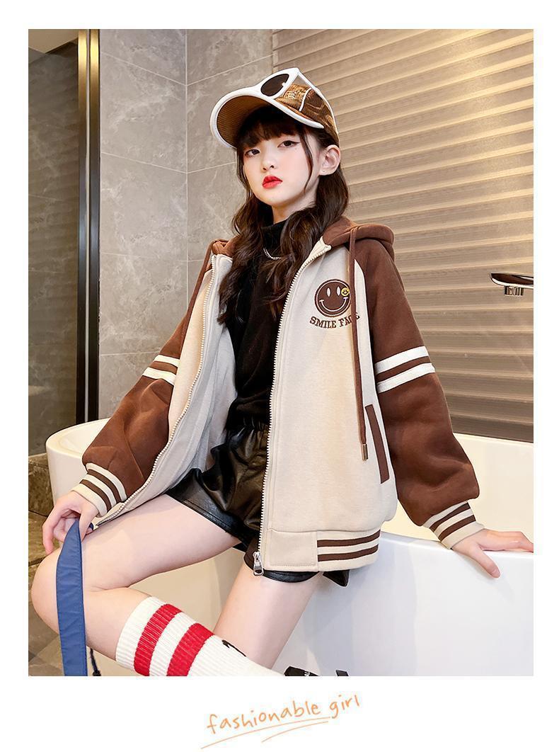 Abrigo de las niñas forrado de vellón engrosado Otoño e Invierno suéter con capucha uniforme de béisbol medio y grande niños estilo occidental niñas cardigan top