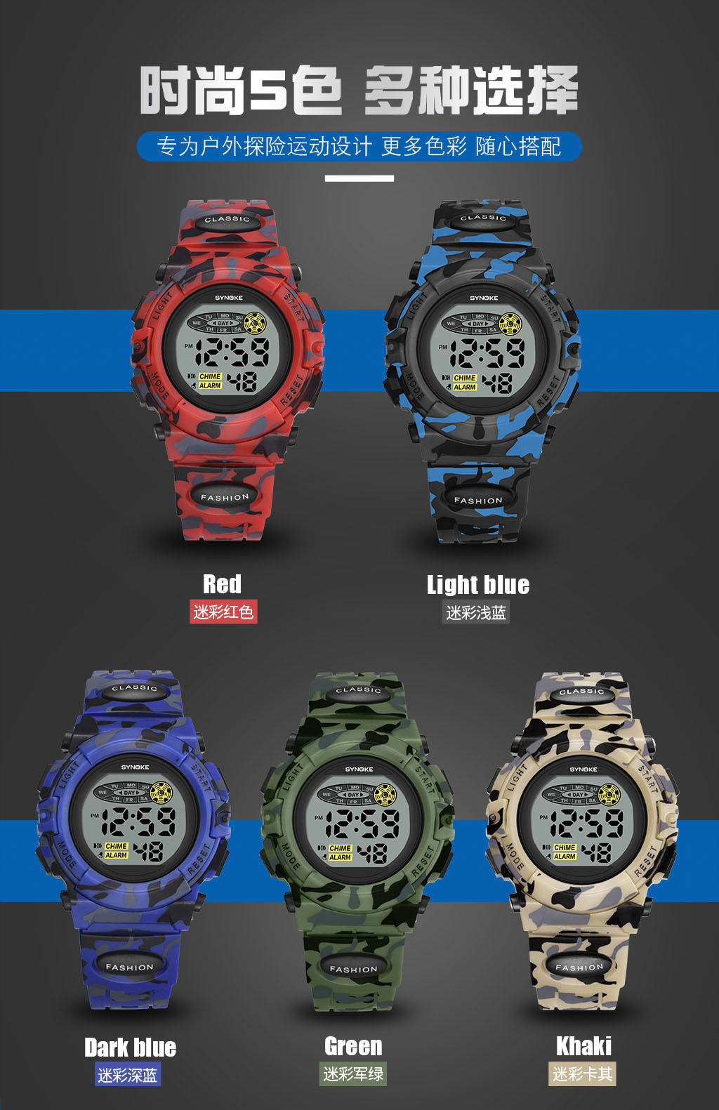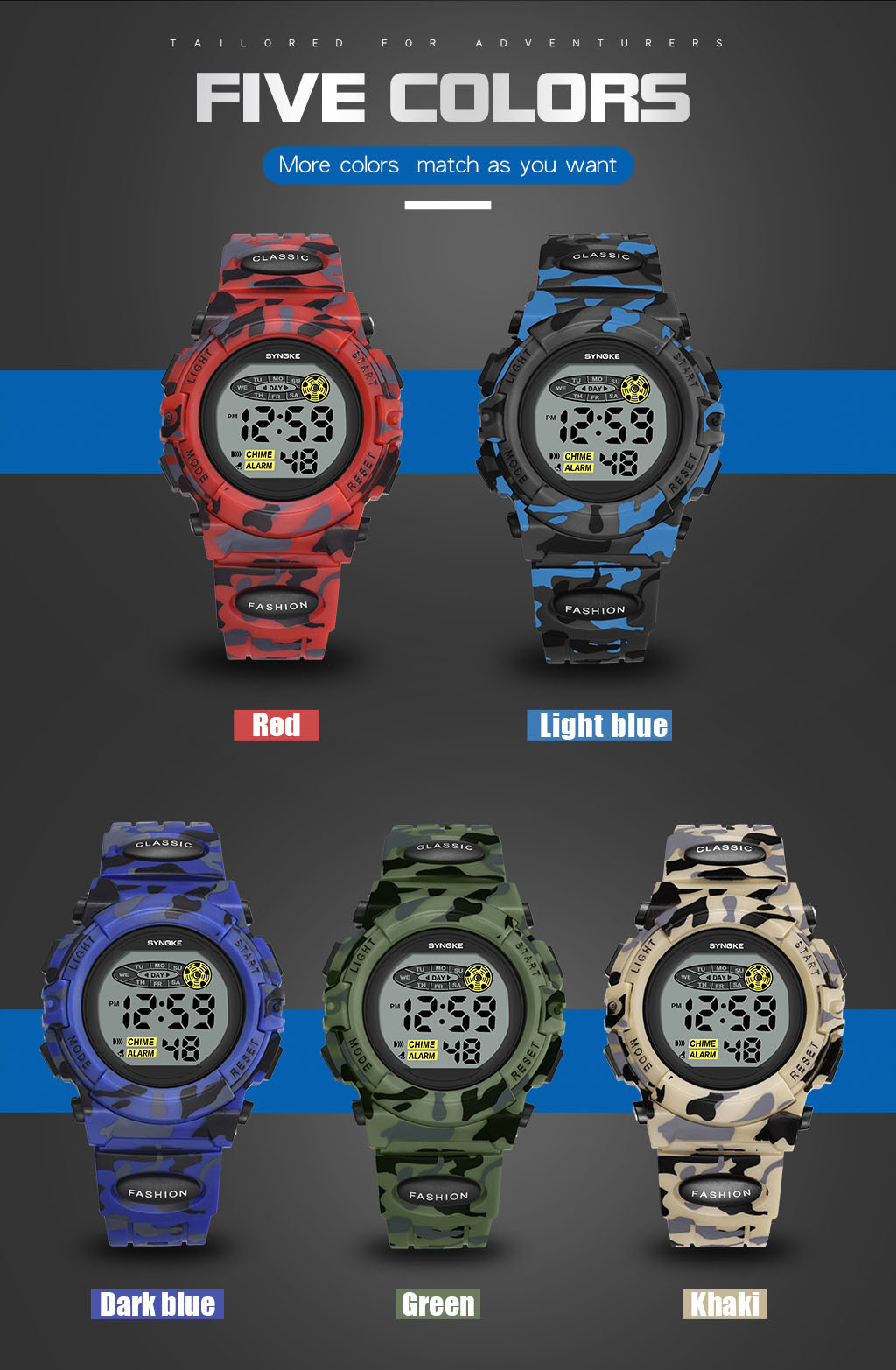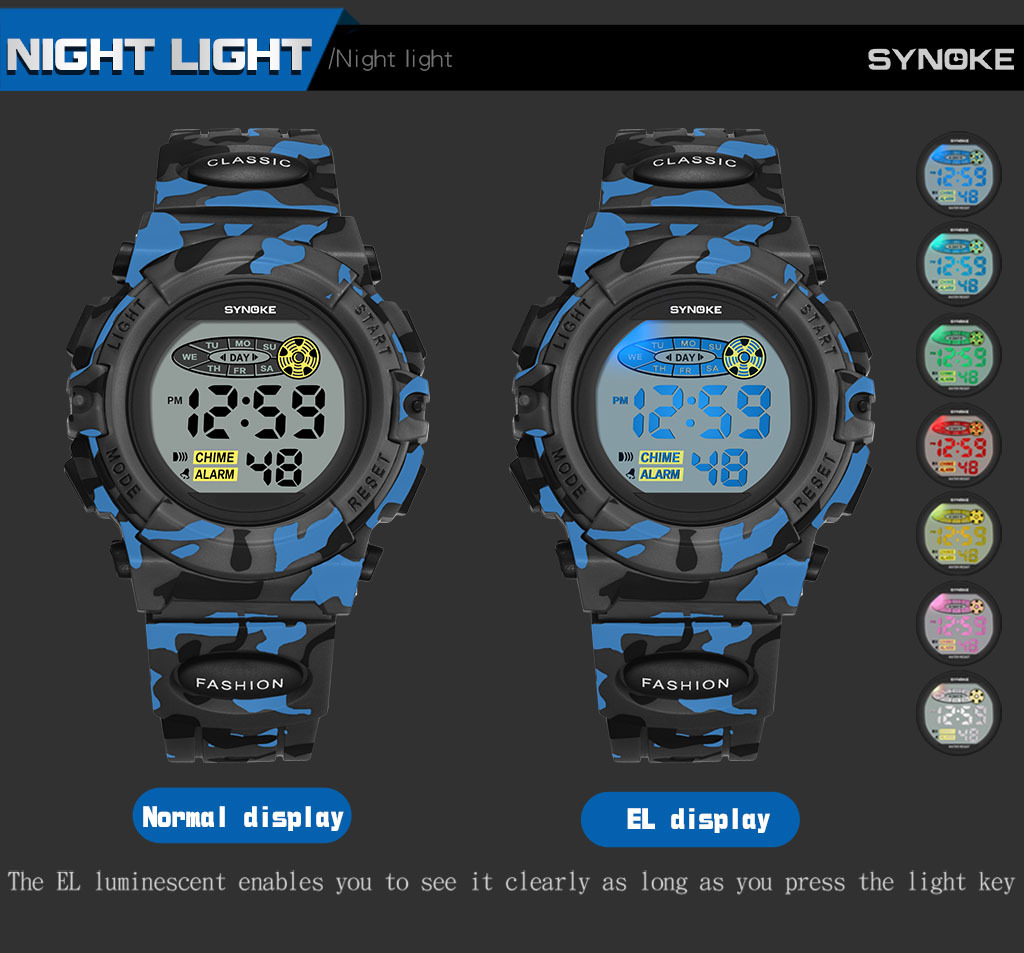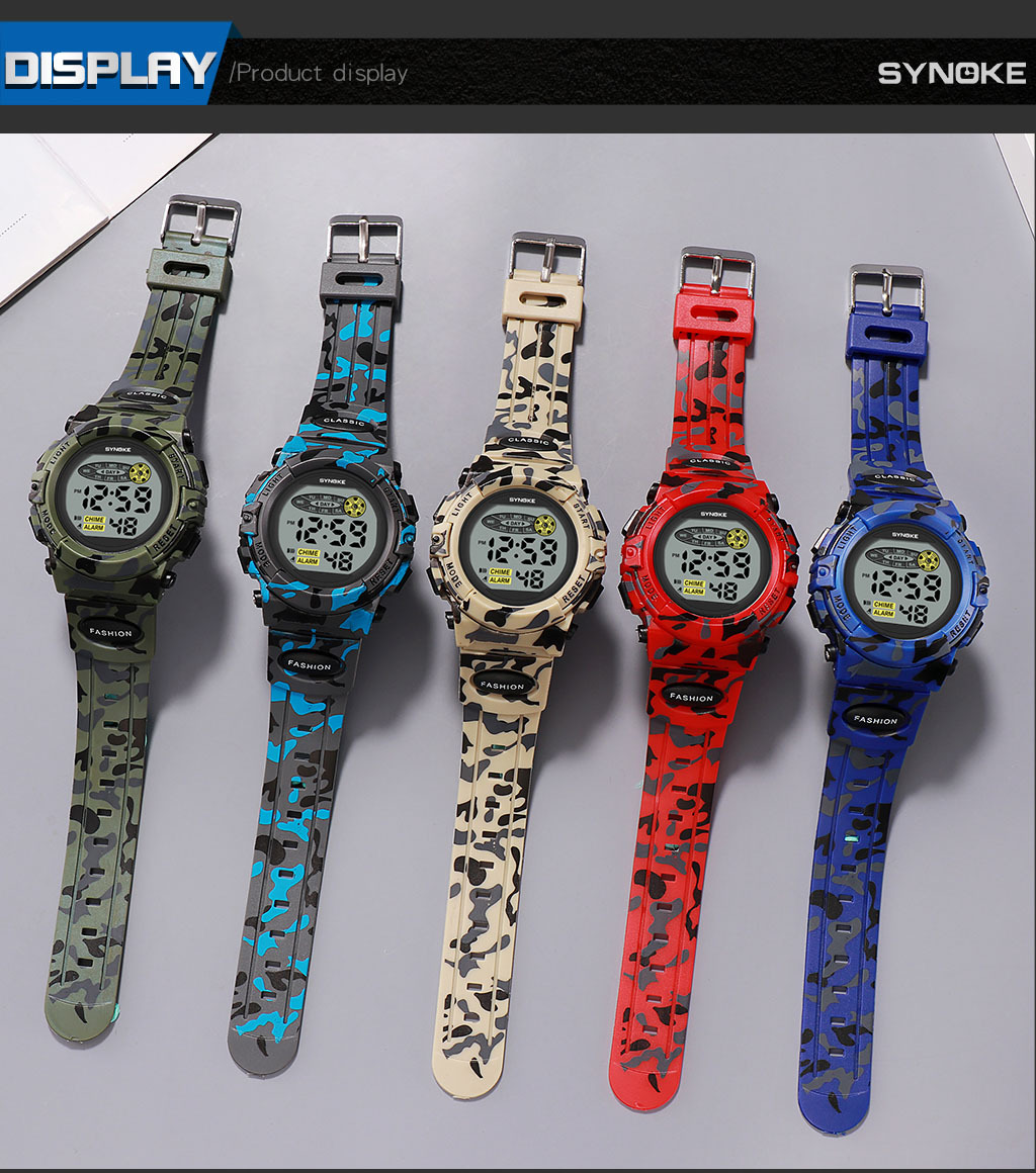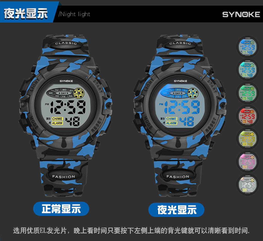 SYNOKE nuevo sudeste asiático popular colorido luminoso niños estudiante reloj electrónico personalizado camuflaje reloj deportivo