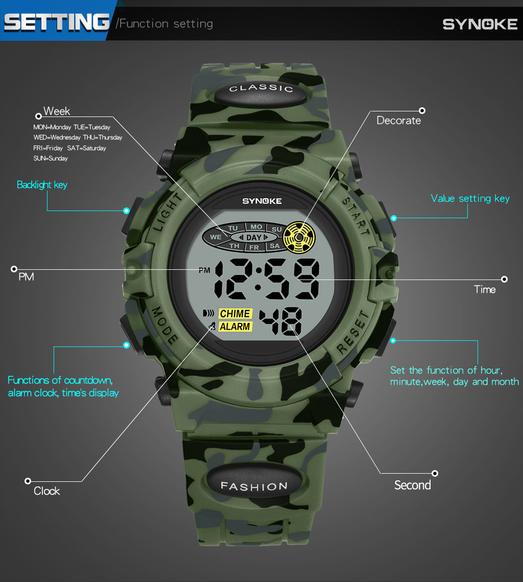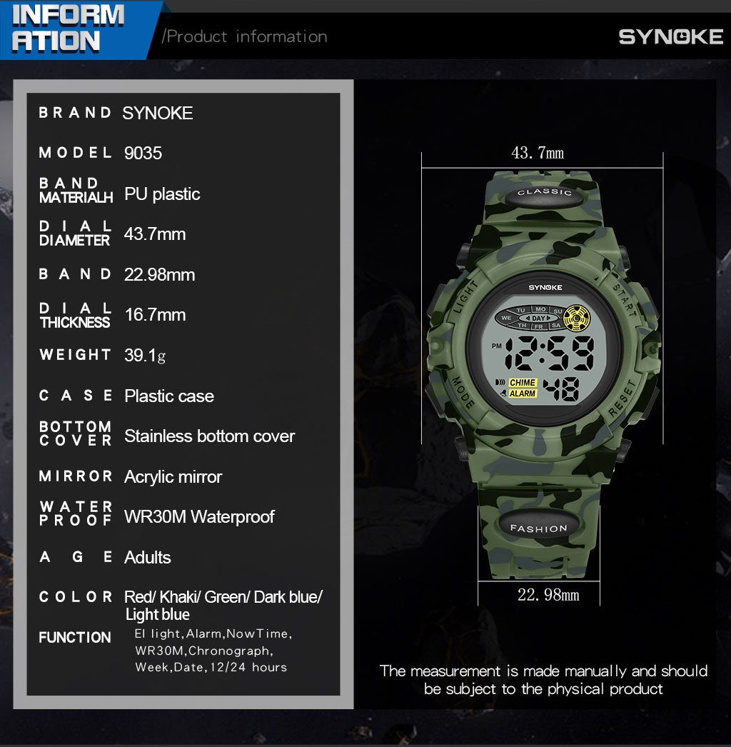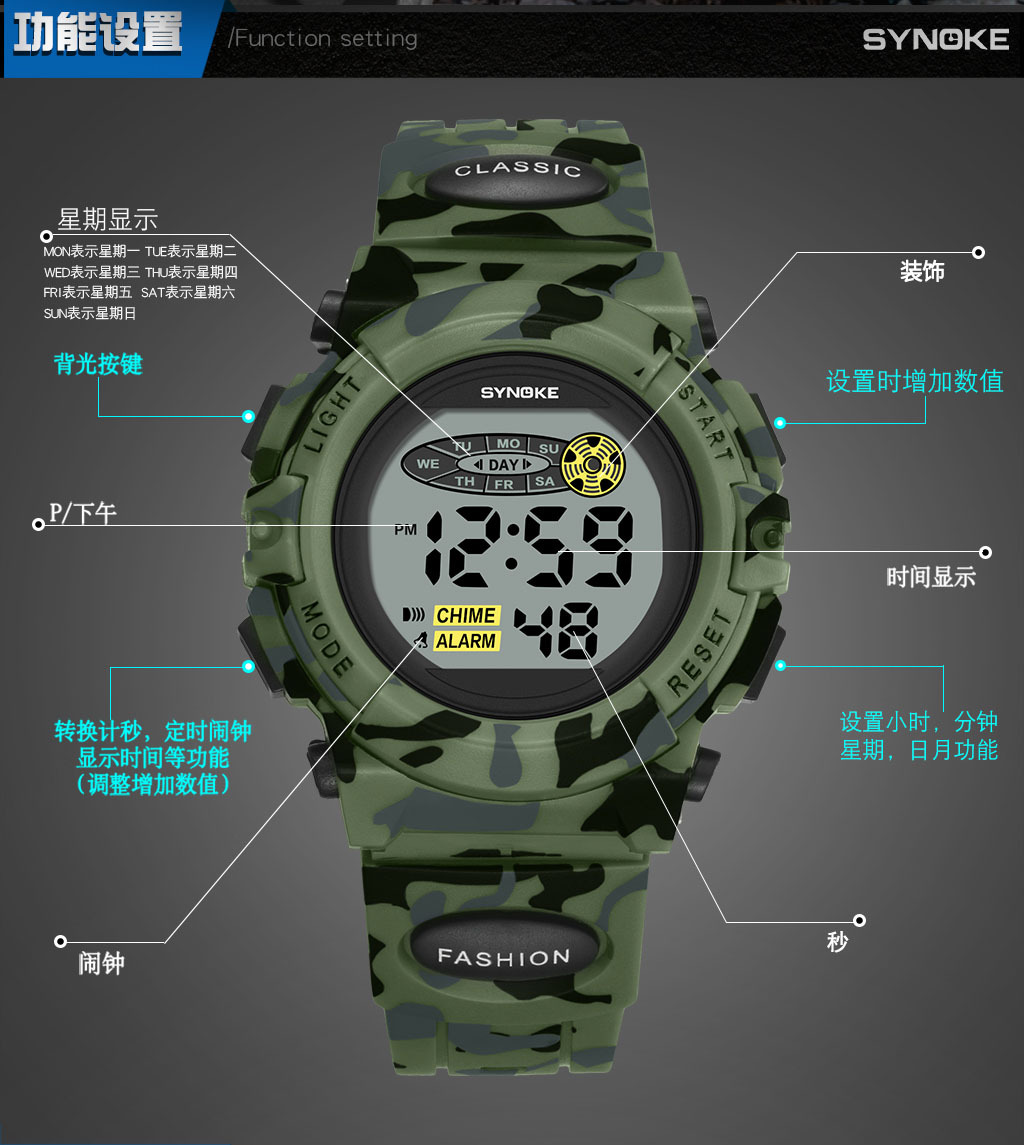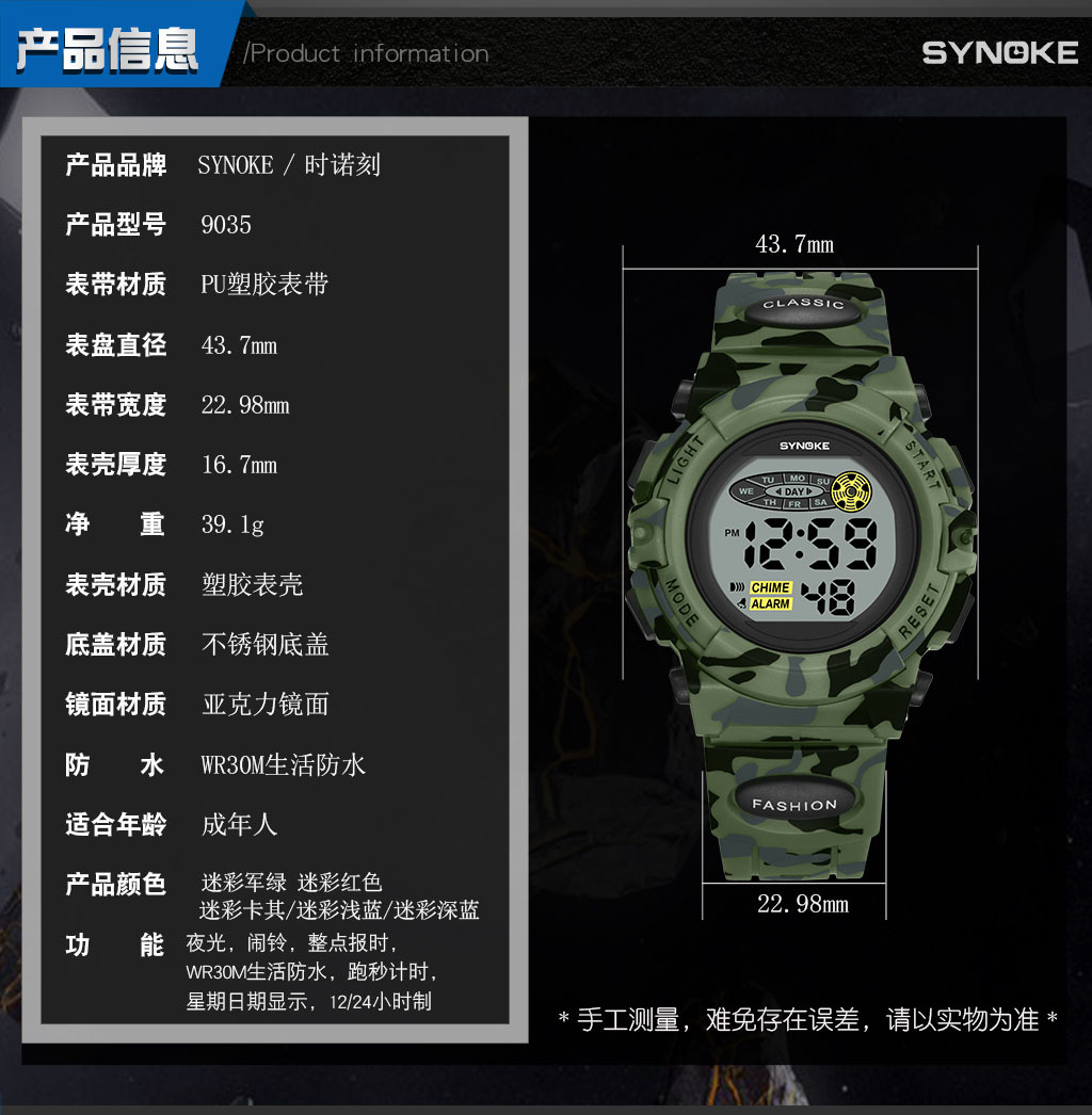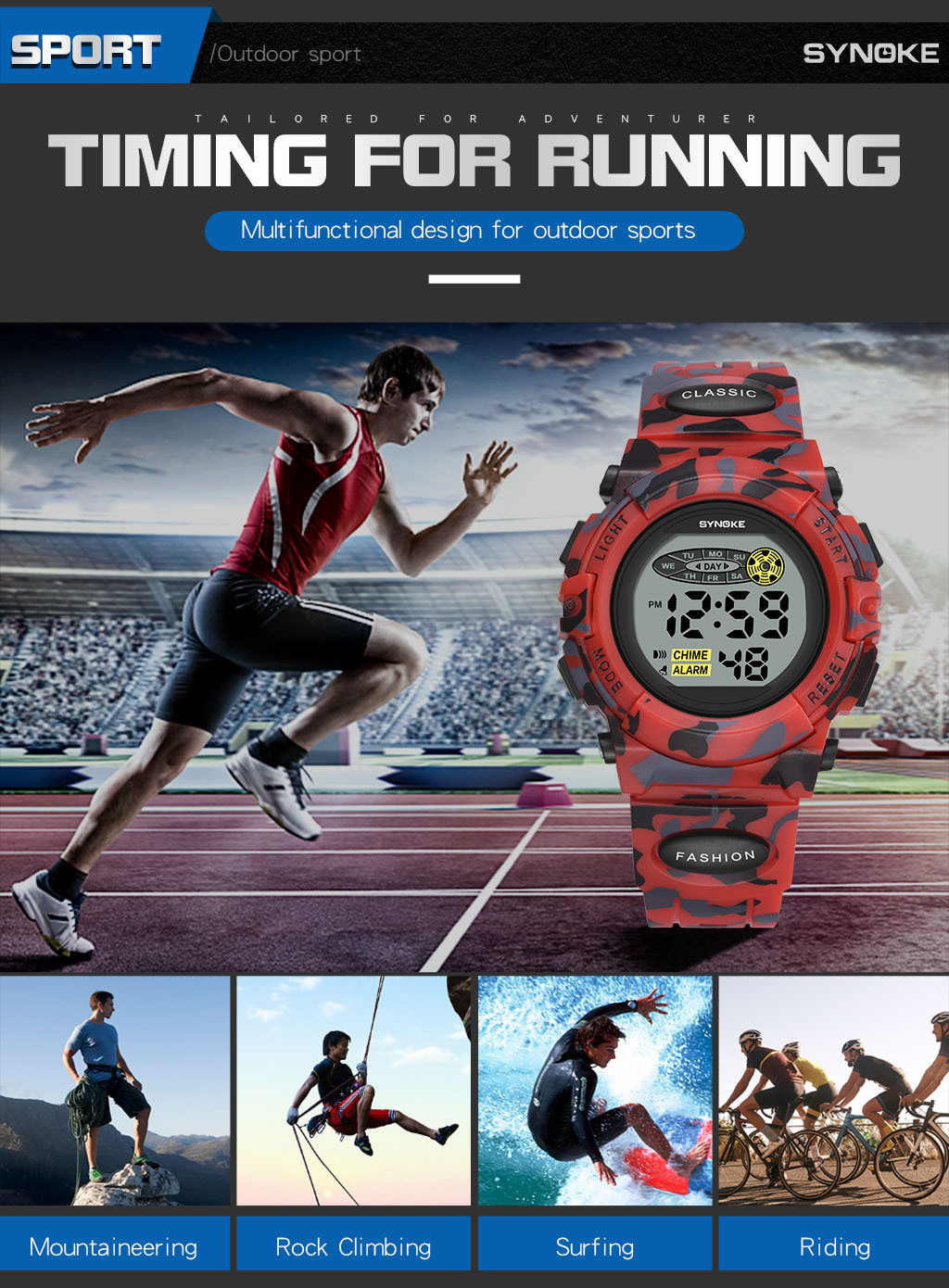SYNOKE nuevo sudeste asiático popular colorido luminoso niños estudiante reloj electrónico personalizado camuflaje reloj deportivo
